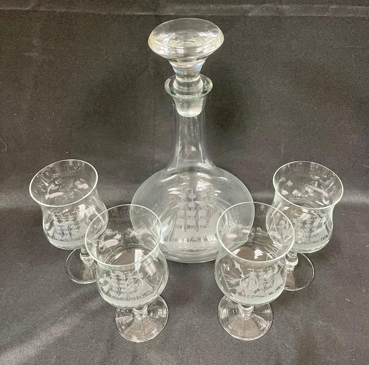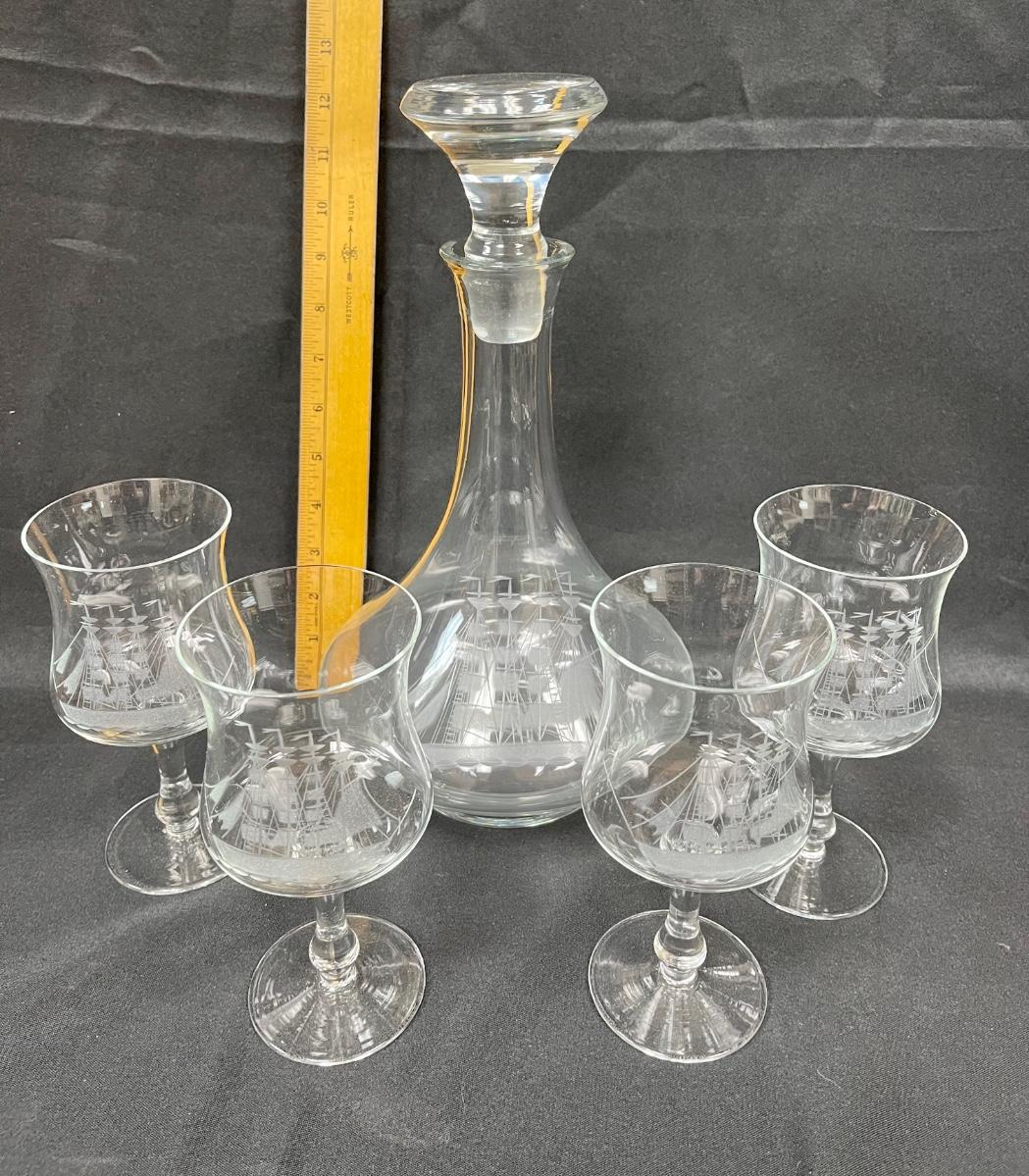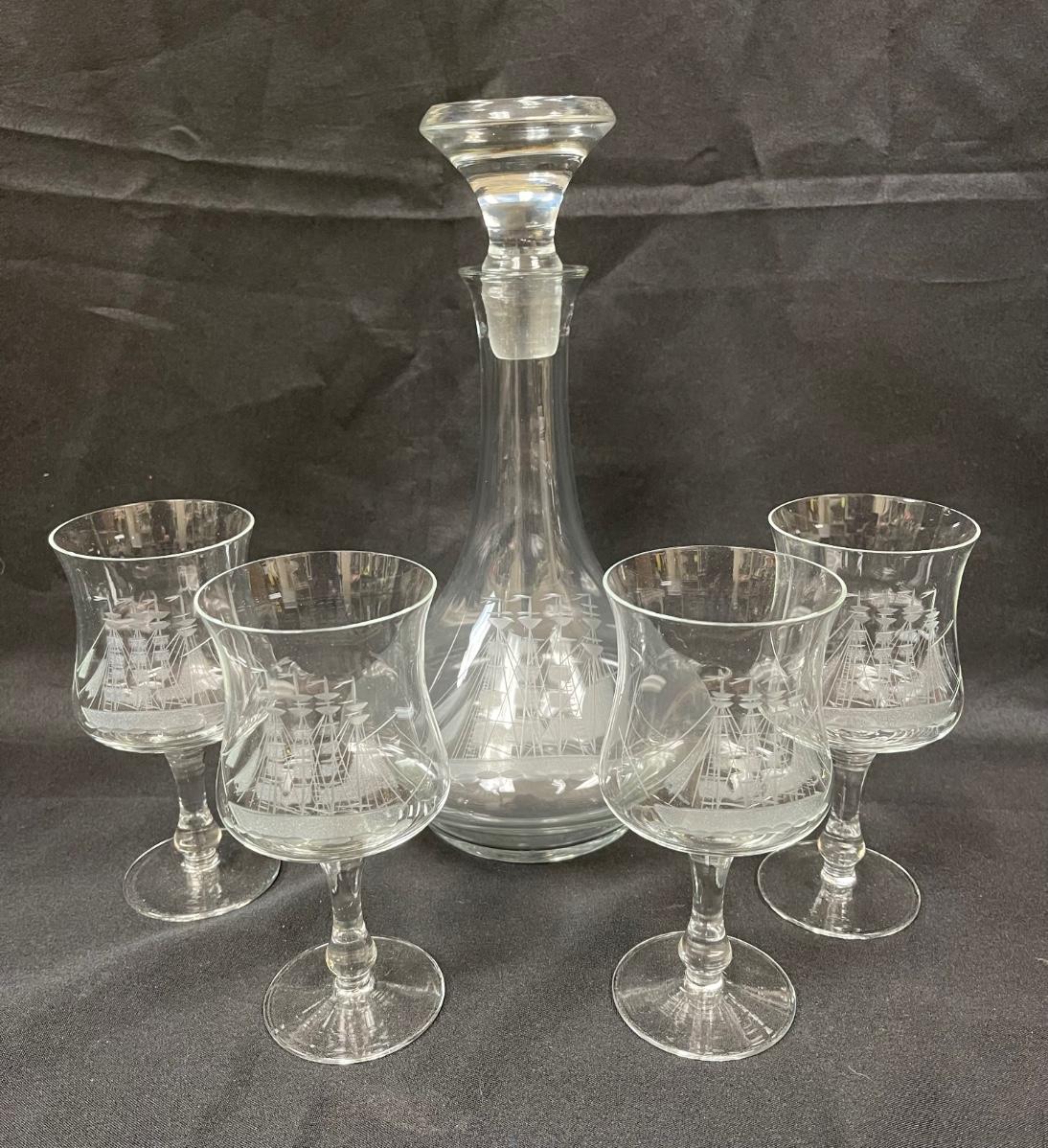 Vintage Etched Glass - 5 piece set - Decanter and wine glasses Tall Ship
