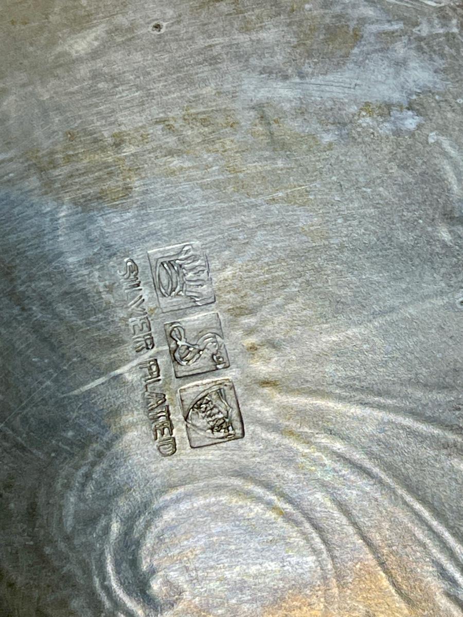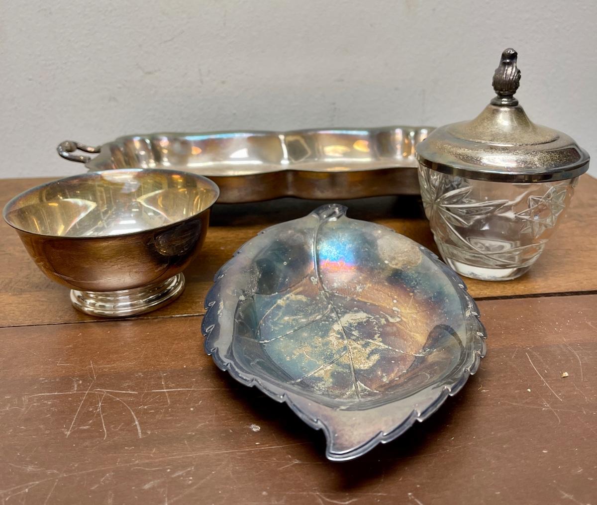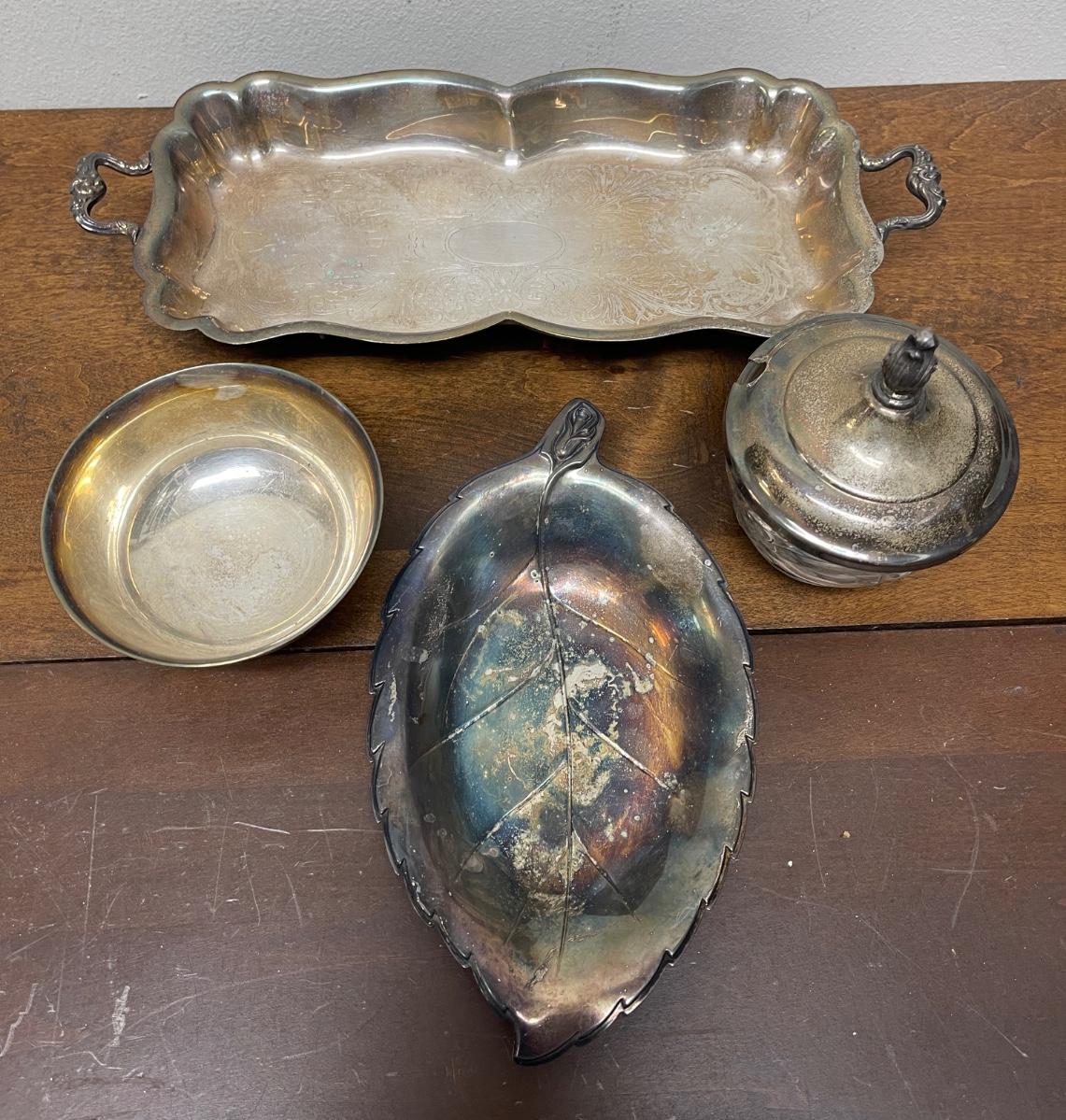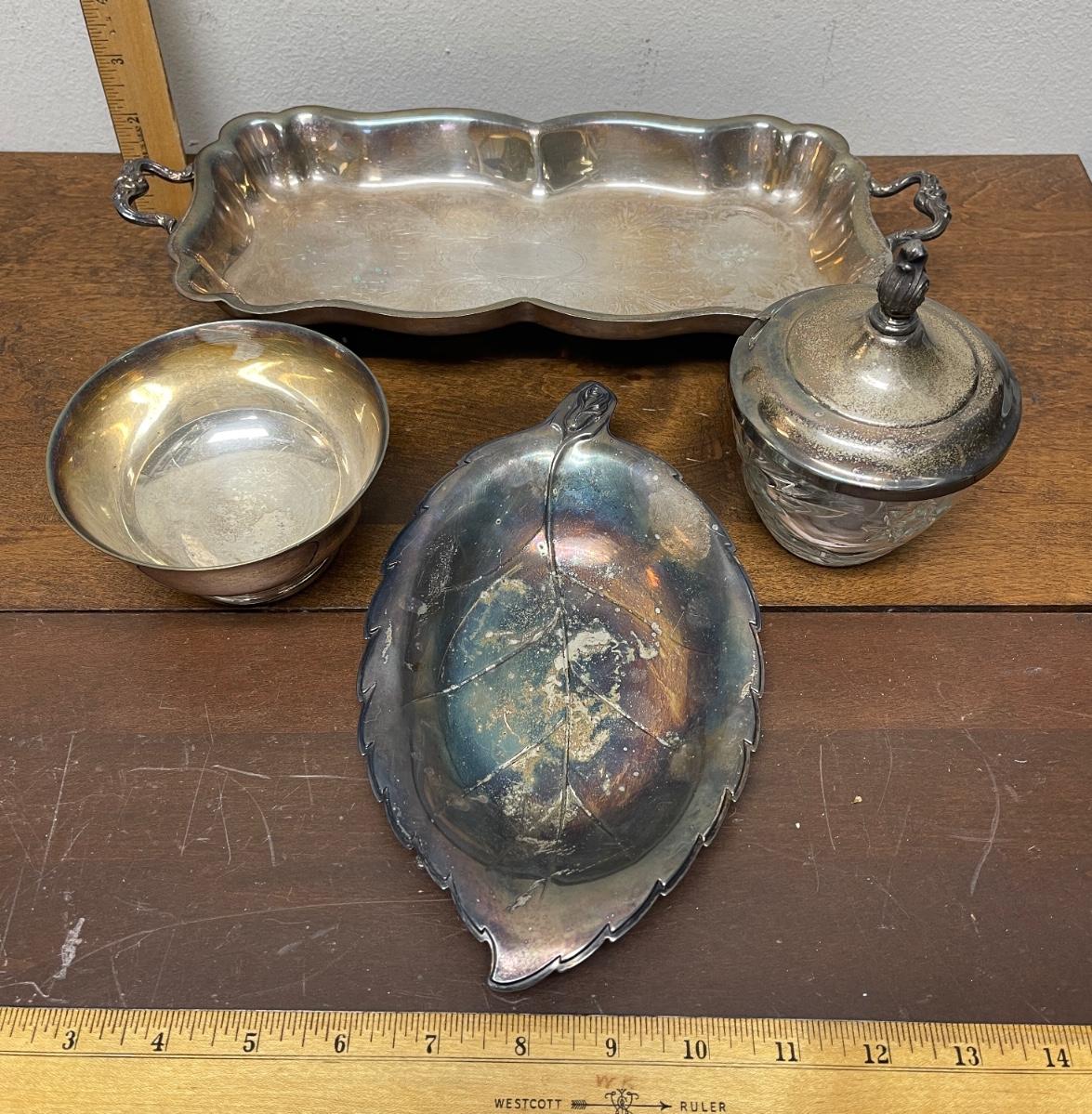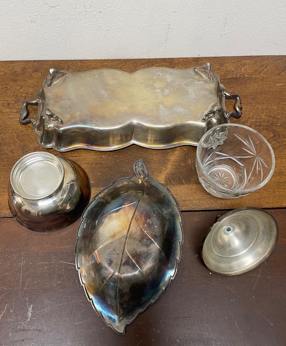 silver-plate serving pieces - tray, nut dish, sugar bowl, condiment jar
