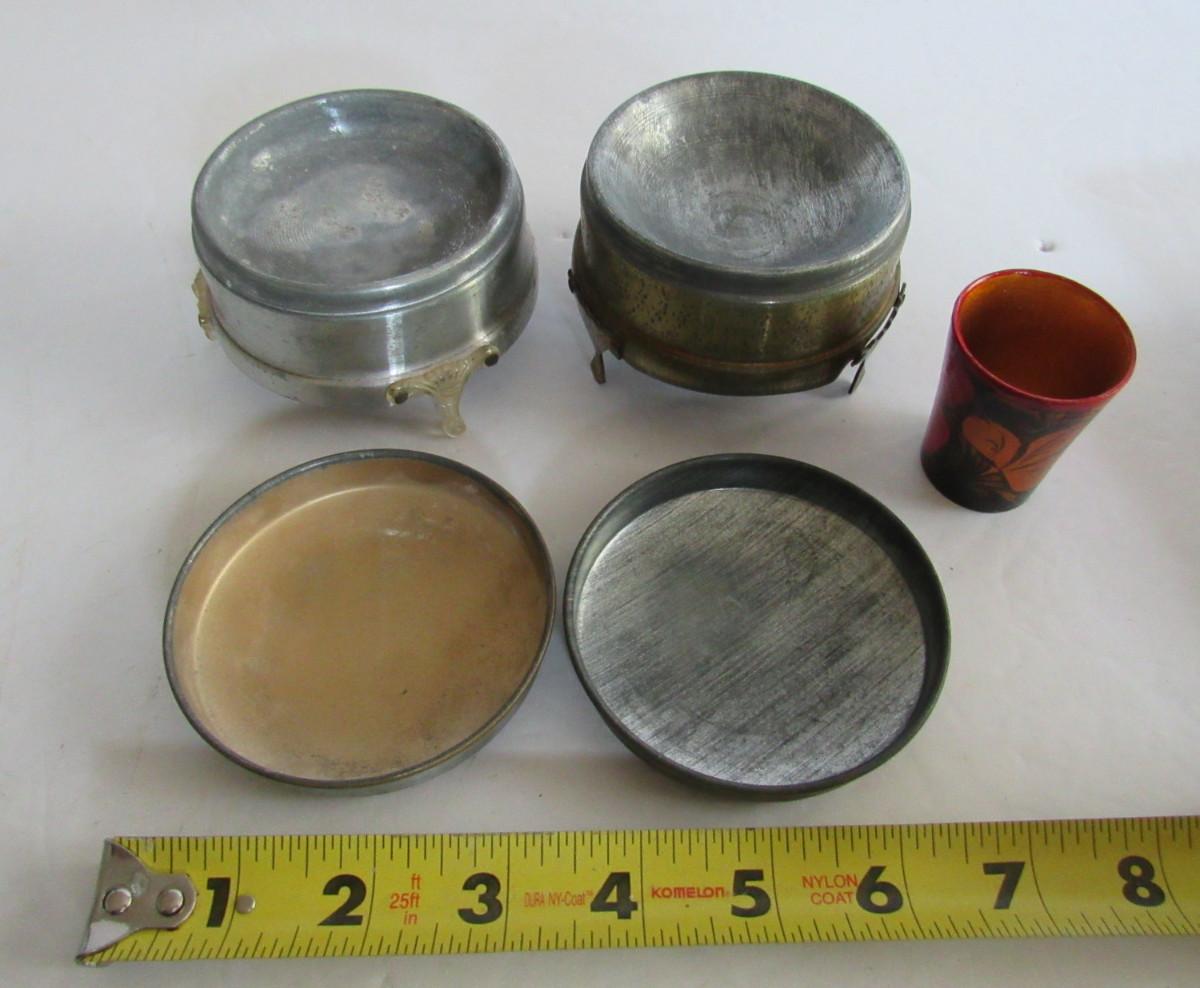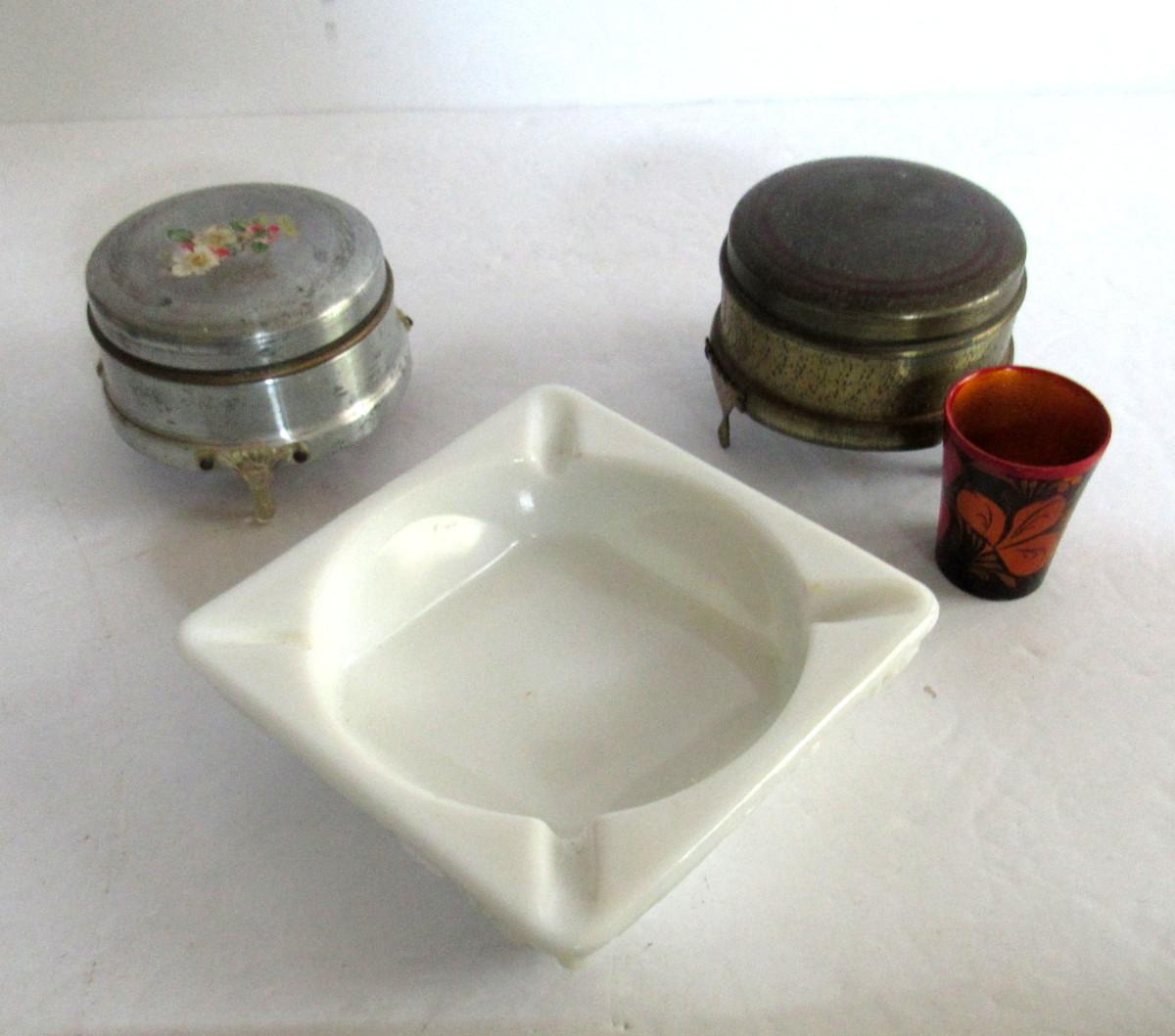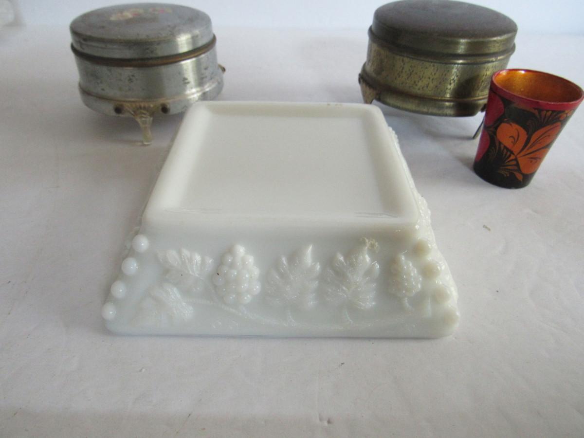 2 Old Metal Covered Boxes, Westmoreland Paneled Grape Ashtray