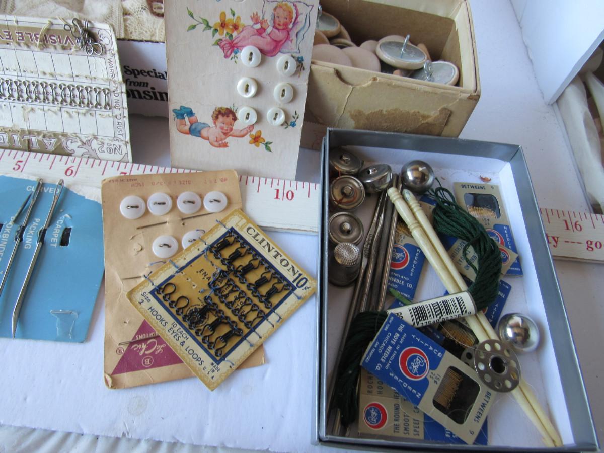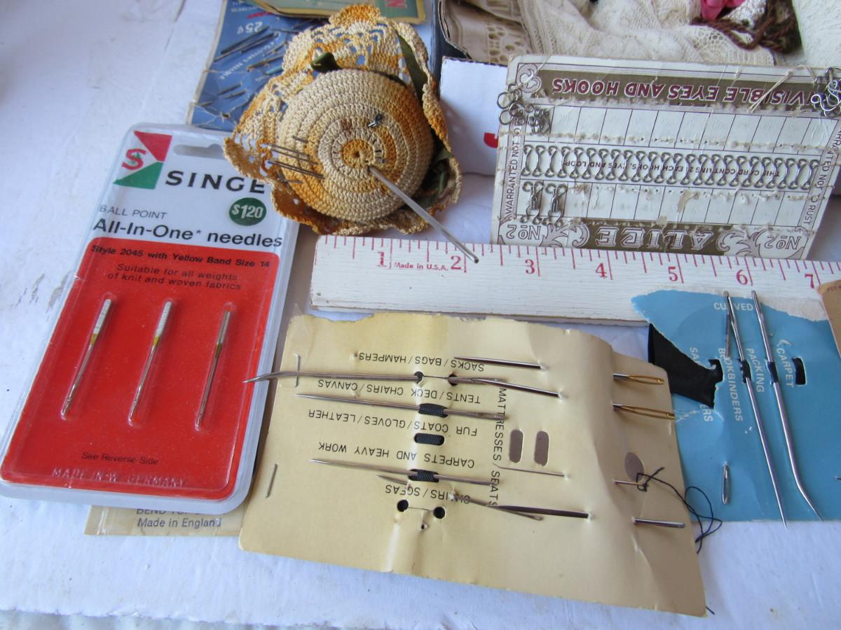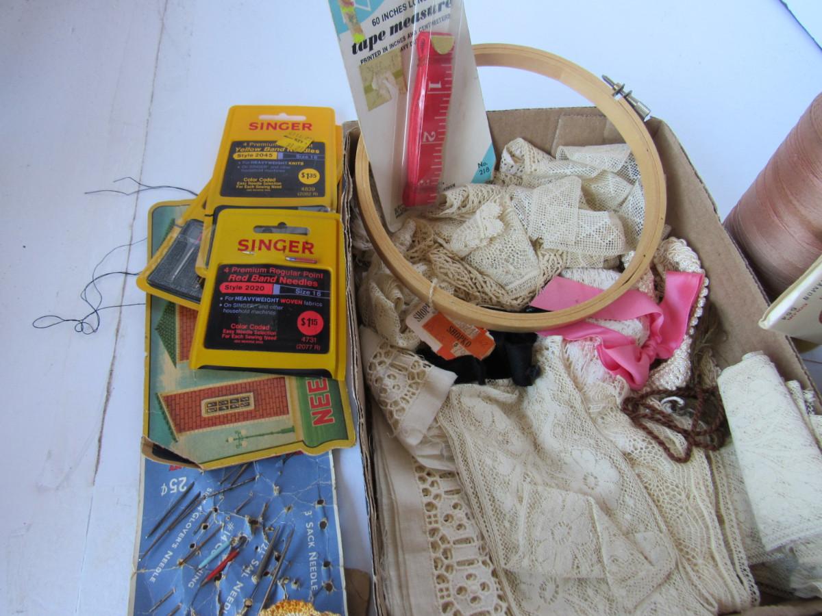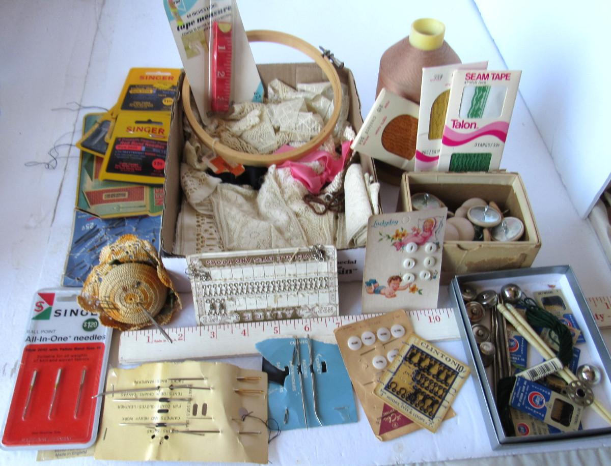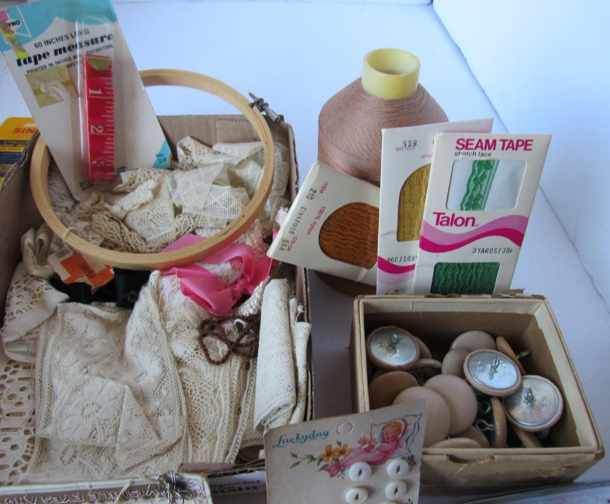 Used but usable. Nice old lace pieces, huge needles, tons of string on spool, more. Shipping is available at actual shipping cost plus $5.00 handling fee per box for supplies/labor. See our terms for details. All sales are final. Condition notes may not be all inclusive, we may miss some issues as most vintage items are not in mint condition and have some degree of wear, paint loss, etc, but we always try to note obvious damage.