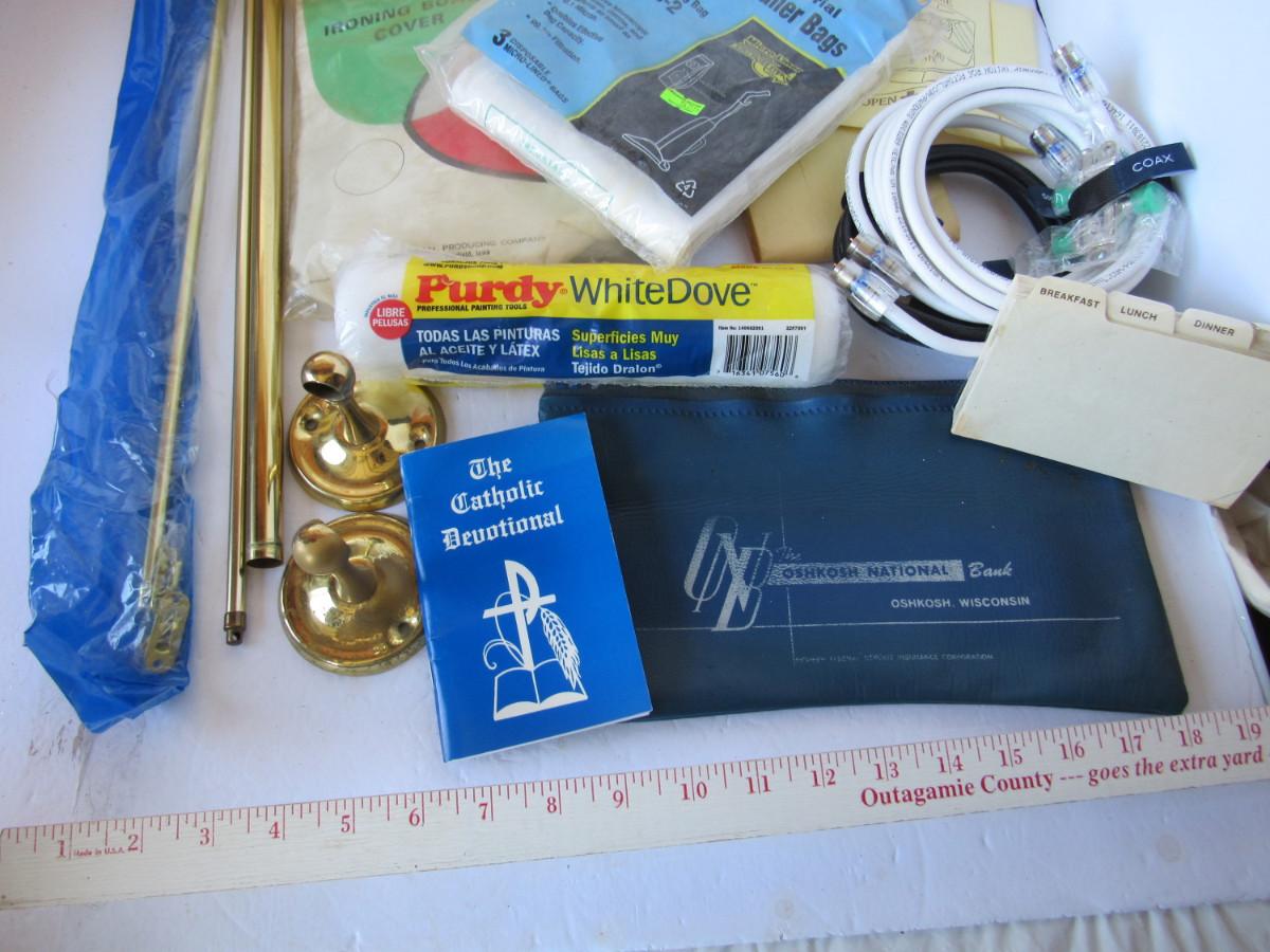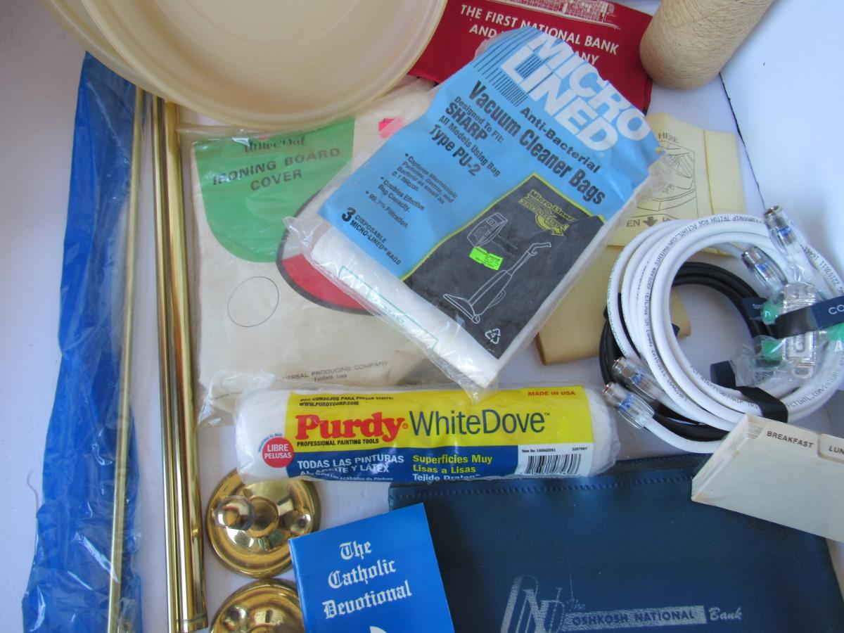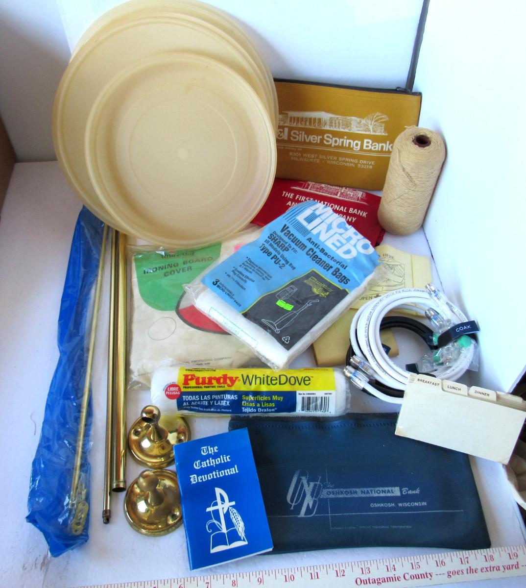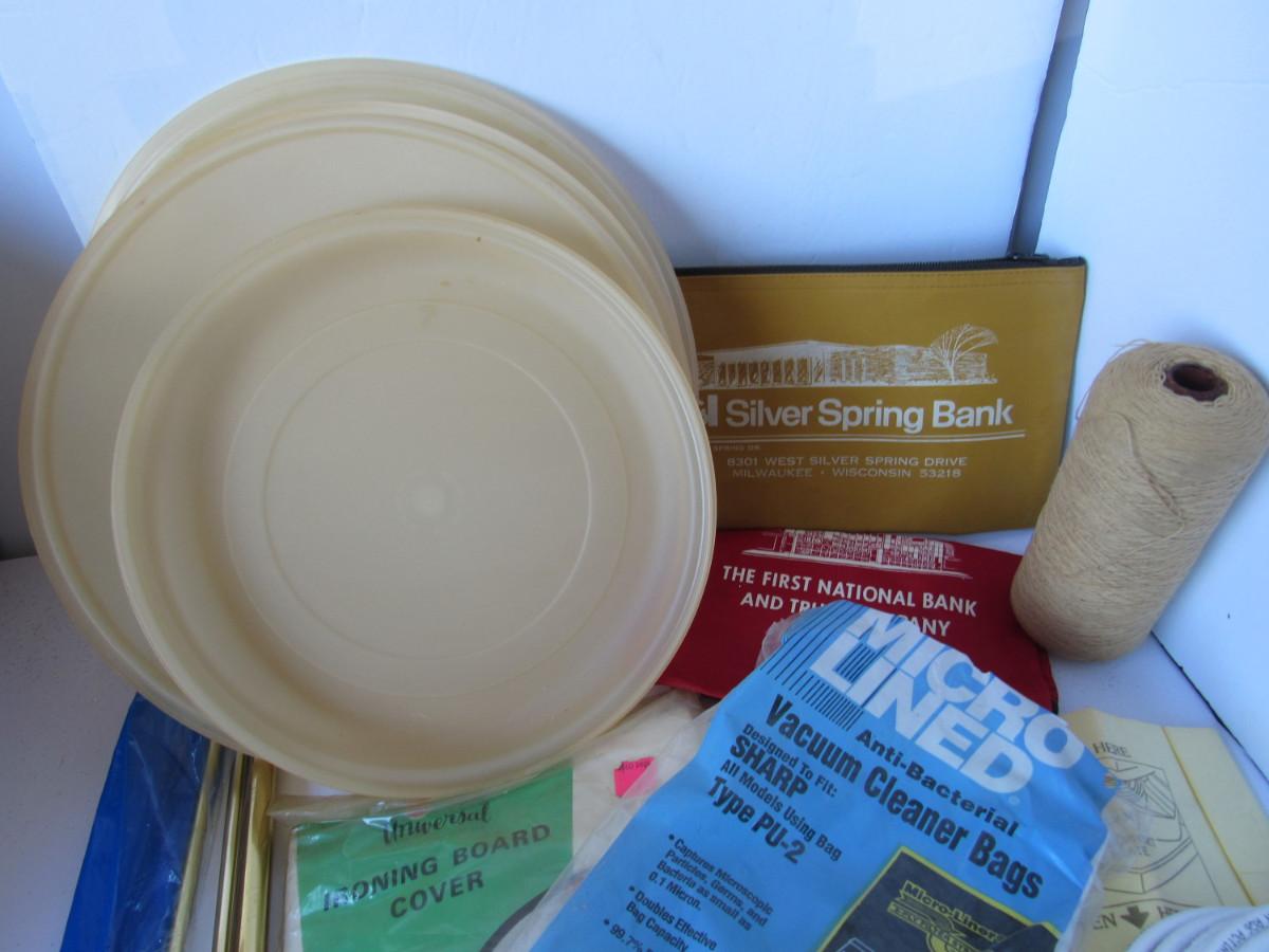 Large vintage Tupperware covers, bank bags, huge roll of string, curtain rod, vac bags, more.