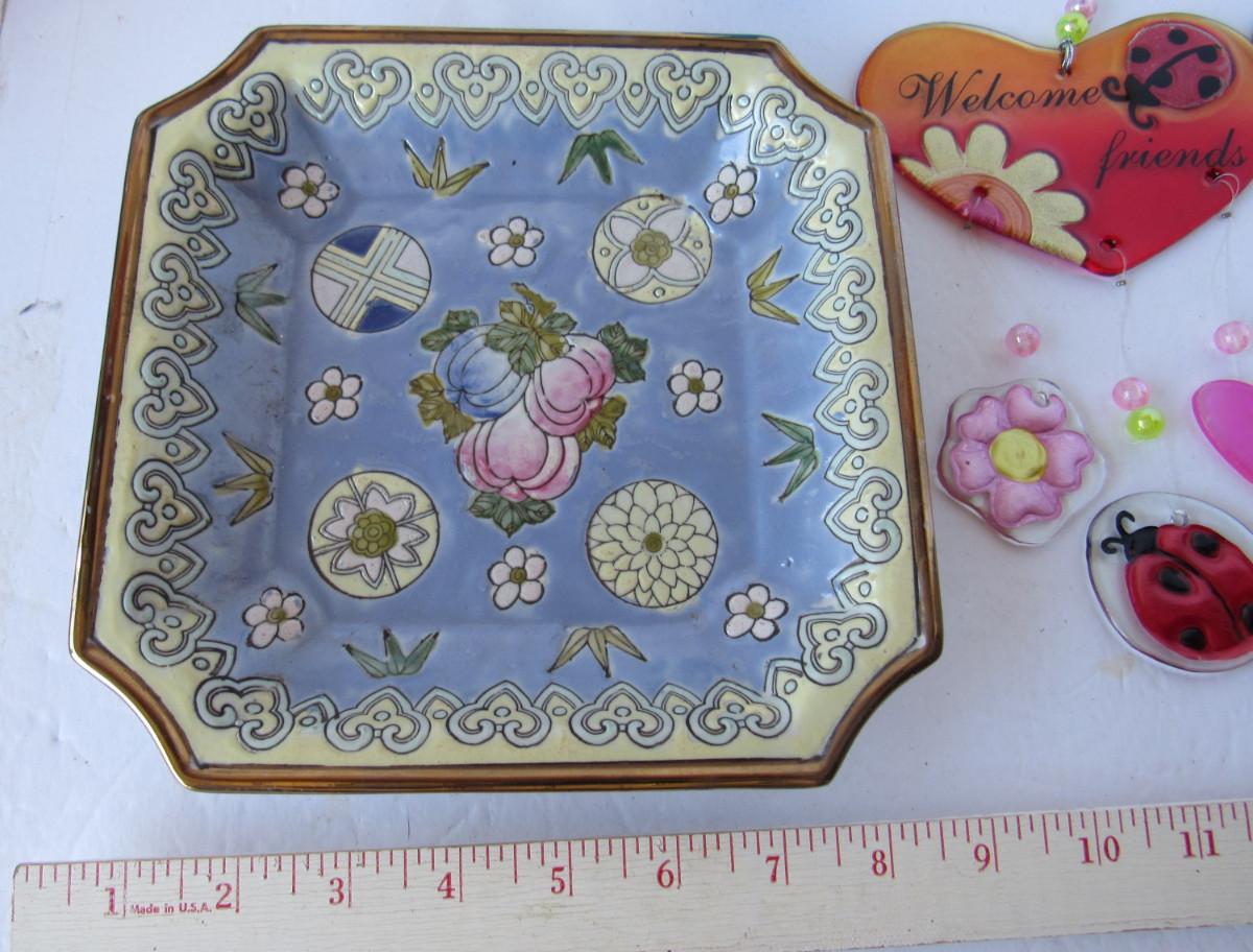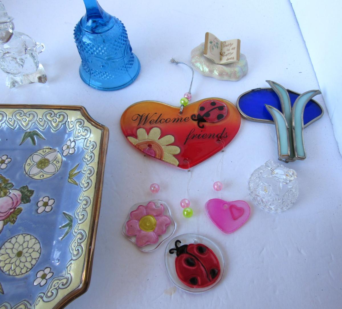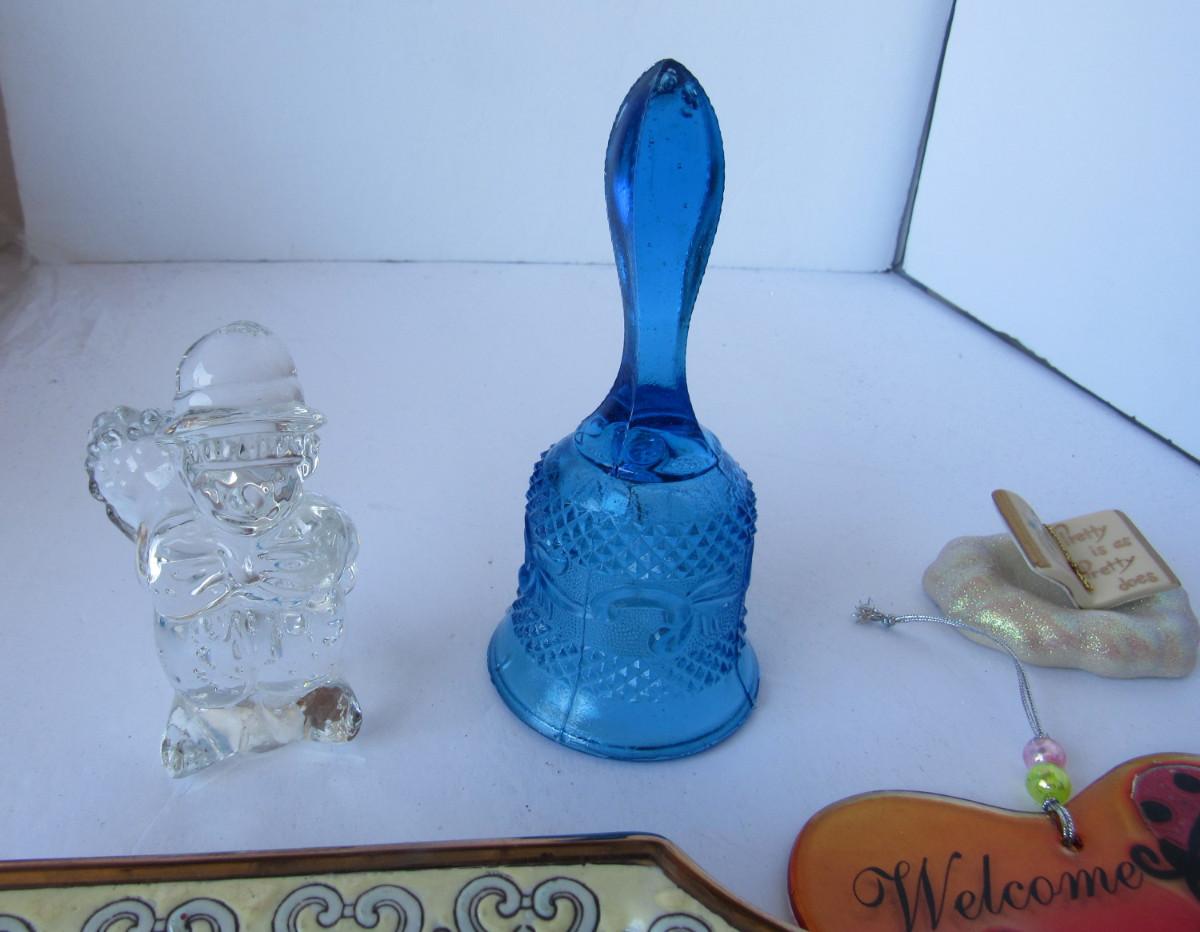 Glass bell, glass figure, oriental plate, glass wind chime and small glass figure in good used shape. The stained glass pieces need to be soldered back together. Shipping is available at actual shipping cost plus $5.00 handling fee per box for supplies/labor. See our terms for details. All sales are final. Condition notes may not be all inclusive, we may miss some issues as most vintage items are not in mint condition and have some degree of wear, paint loss, etc, but we always try to note obvious damage.