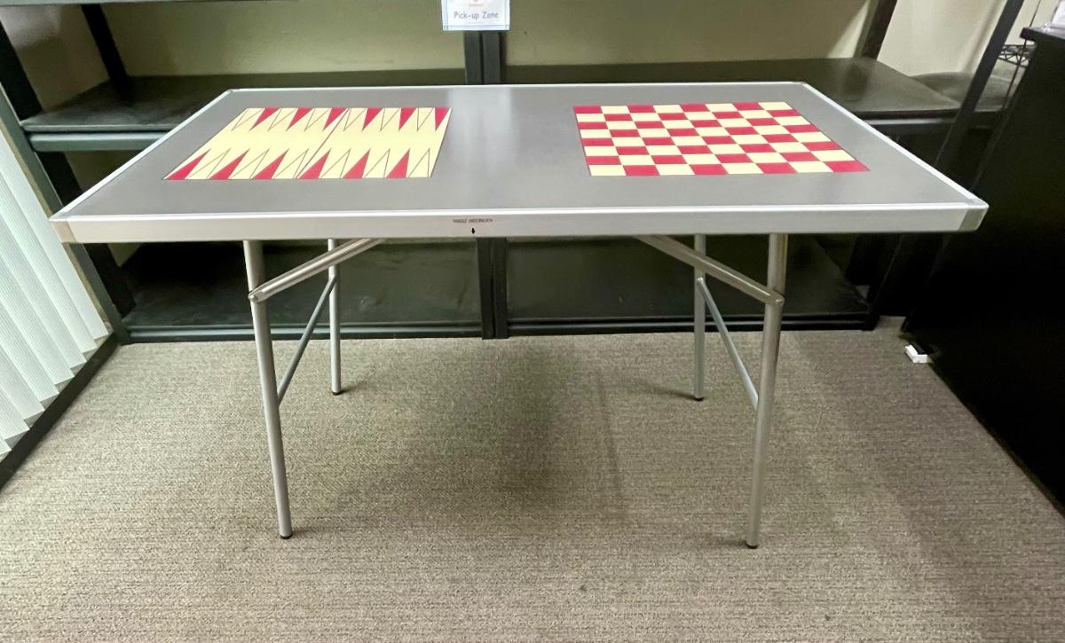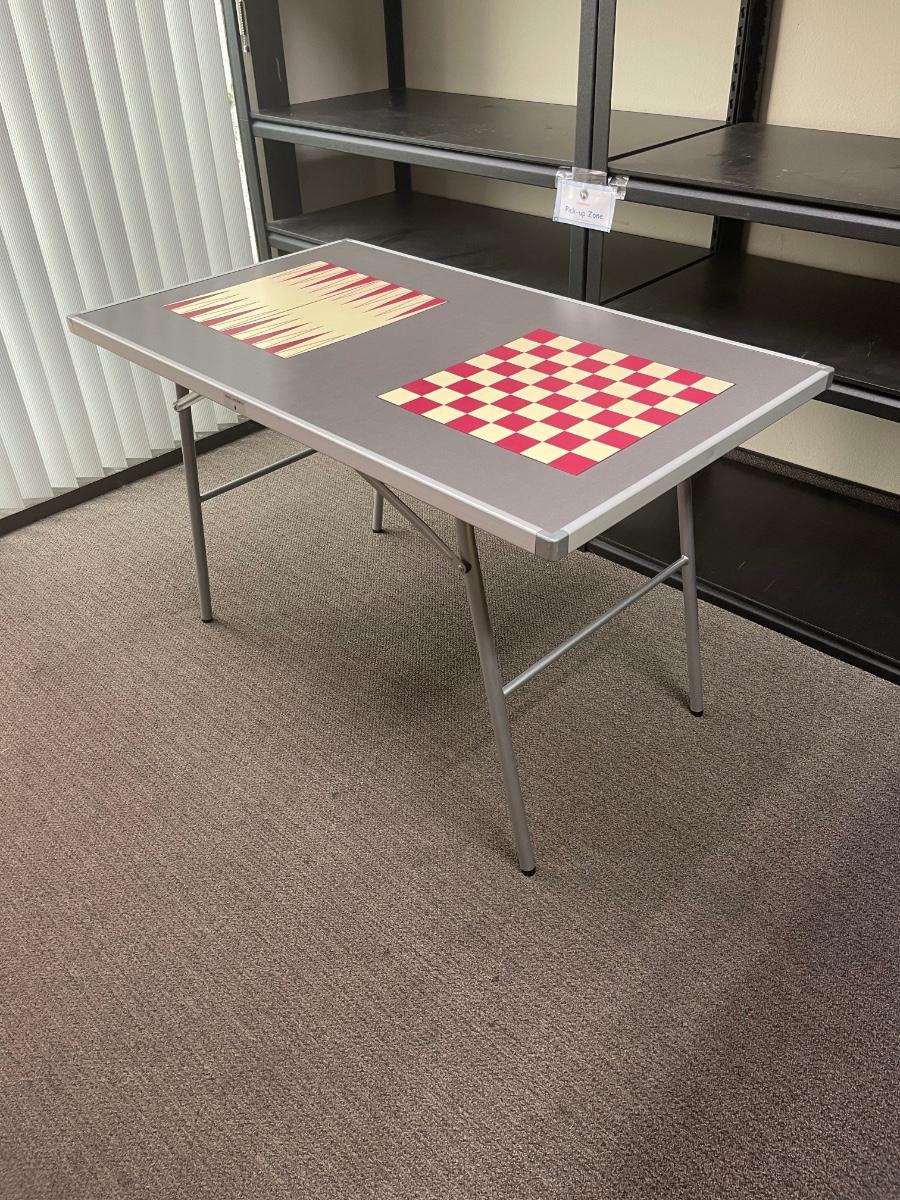 Outdoor game table is perfect for the backyard, beach or camping trip. Lightweight folding table has a built-in chess, checkers and backgammon board. Includes backgammon chips and chess pieces. Handy nylon carrying case with handles. Made of 100-percent aluminum.
