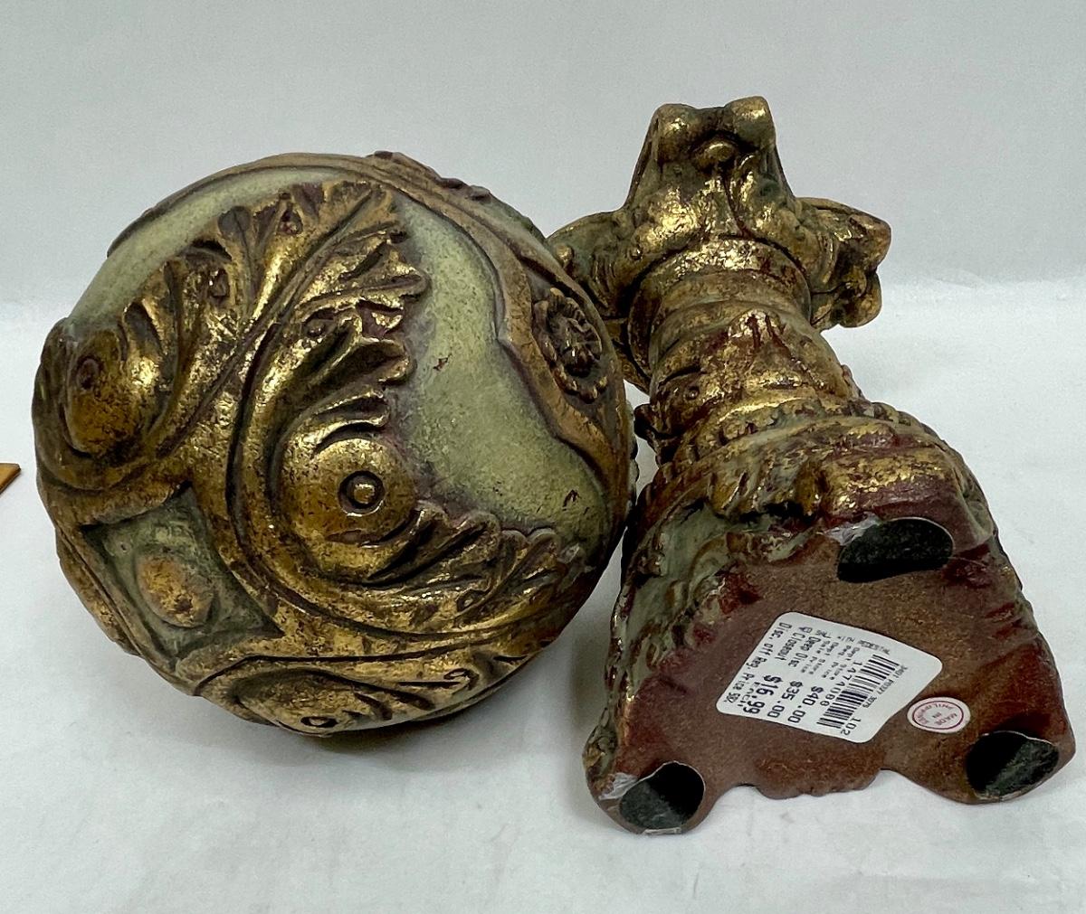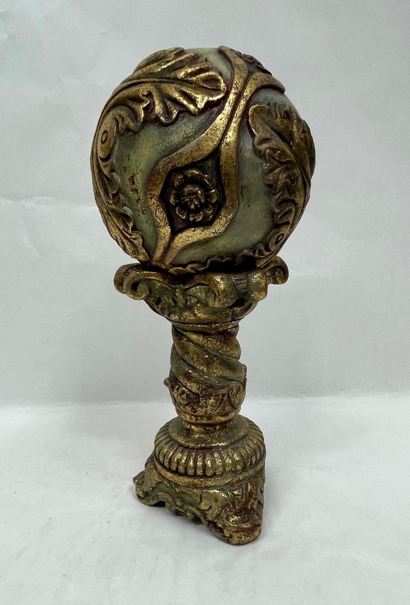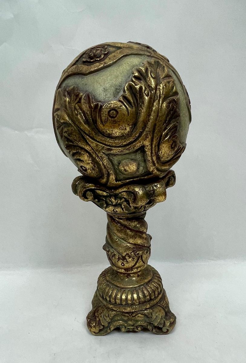 5" diameter ball on a 7" pedestal. Made out of plastic or resin, painted to look like weathered brass. From the Philippines. Good condition.