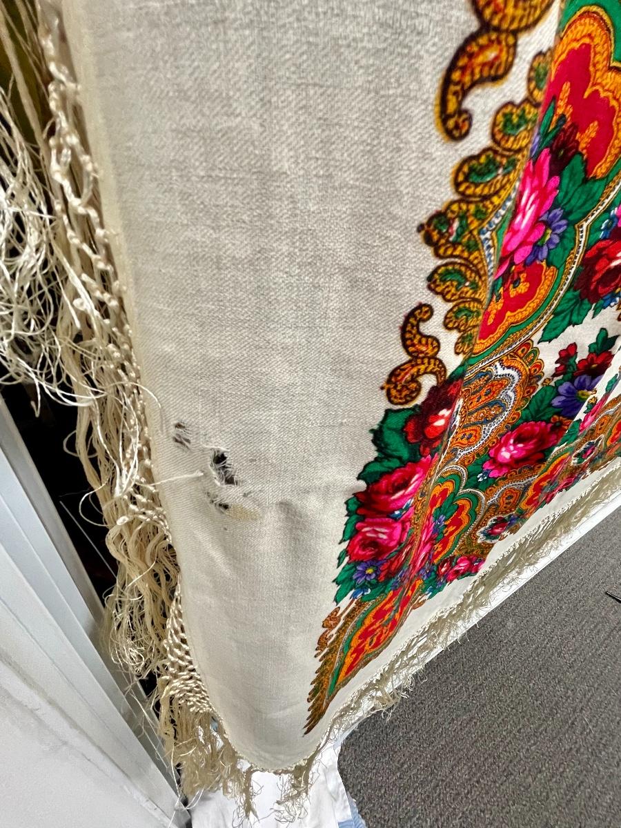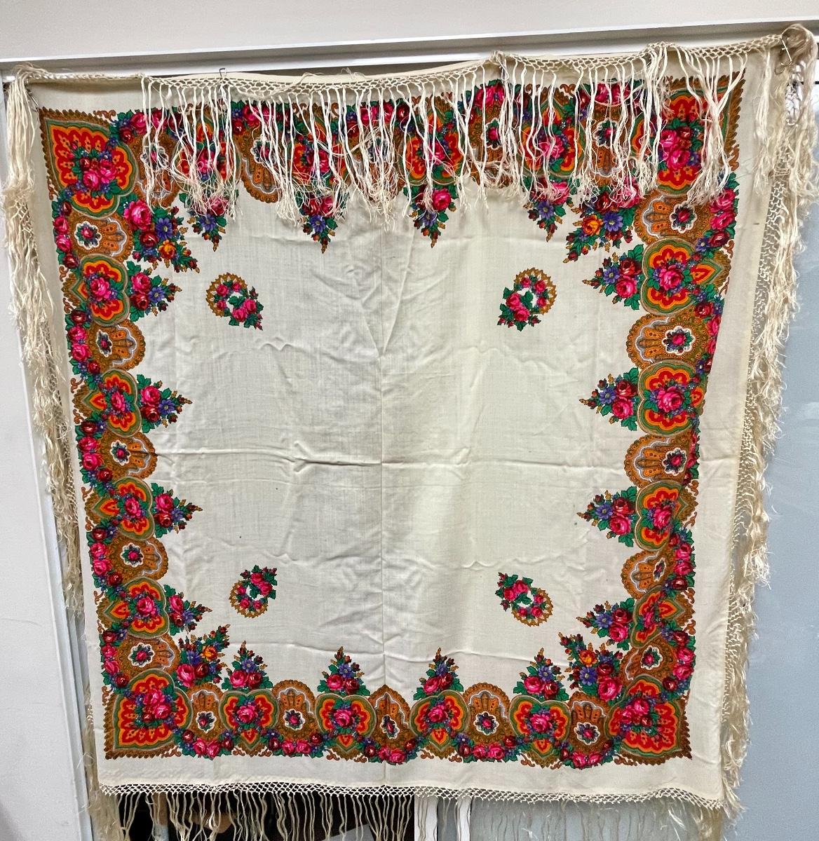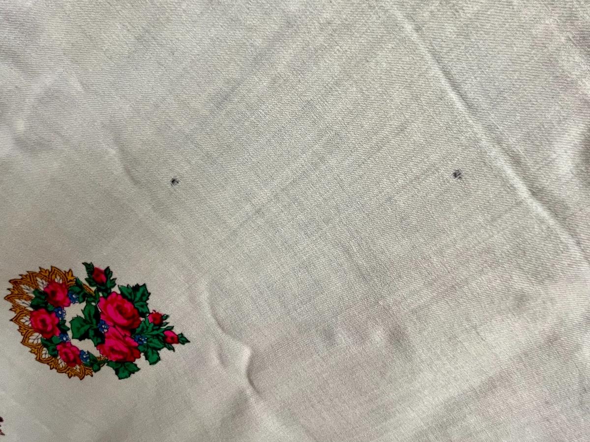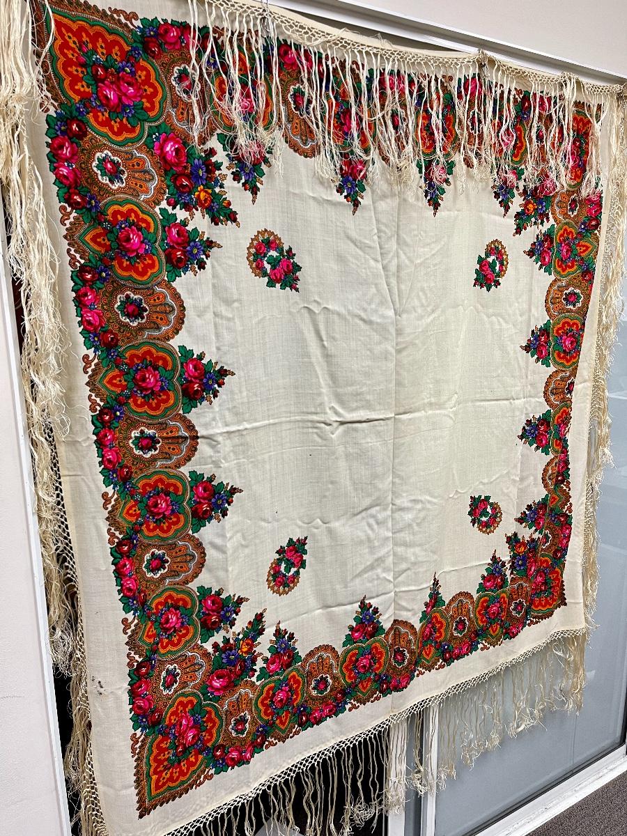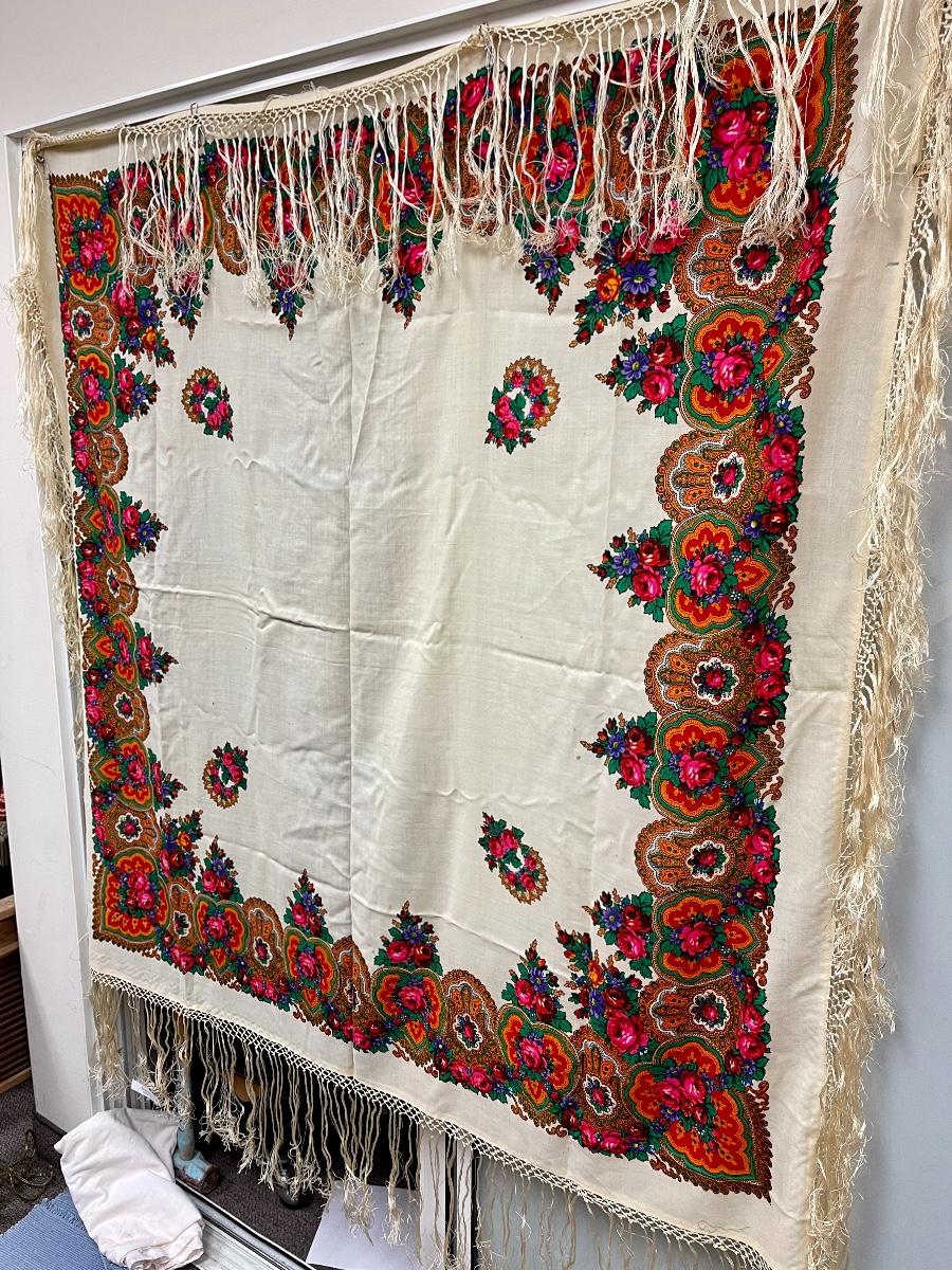 Vintage Fringed Edge Table Cloth Wall Hanging Scarf Shawl. Does have small amount of damage.