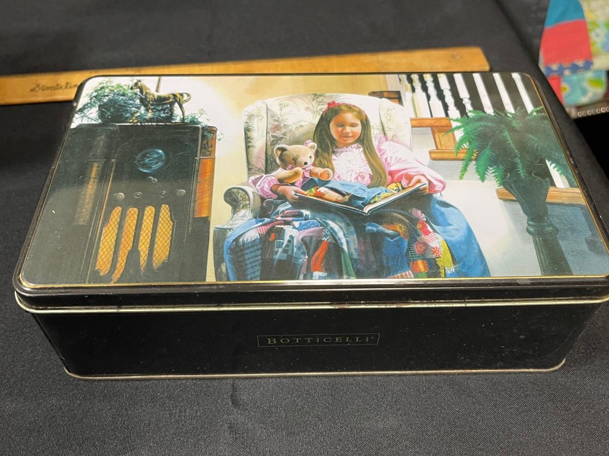 Pair of Matching Botticelli Collector Tins Girl with Bear Reading in Chair. In fair condition. About 10" length.