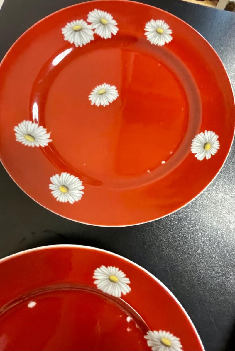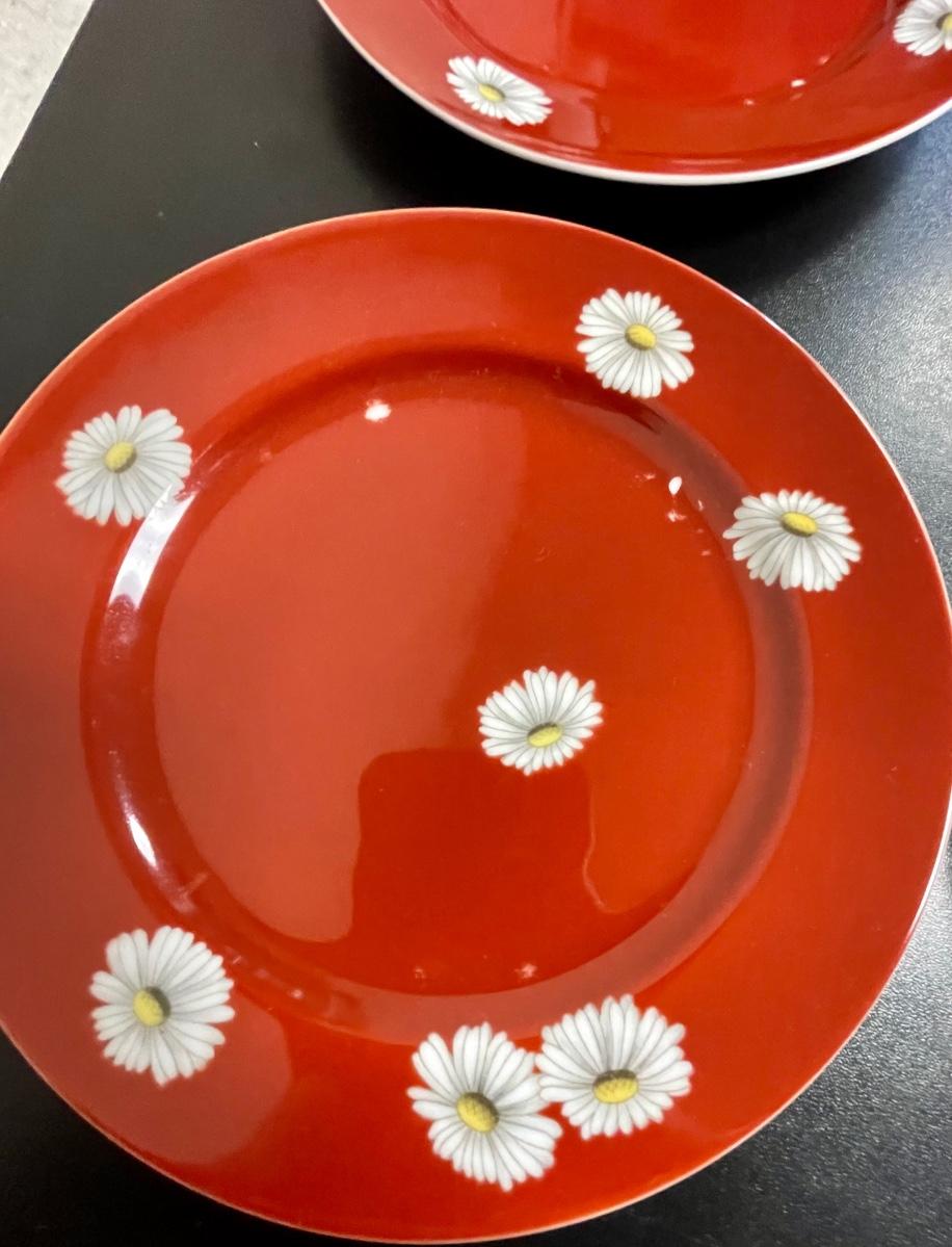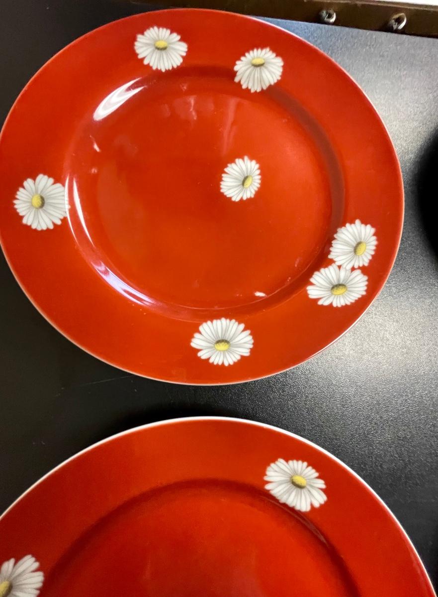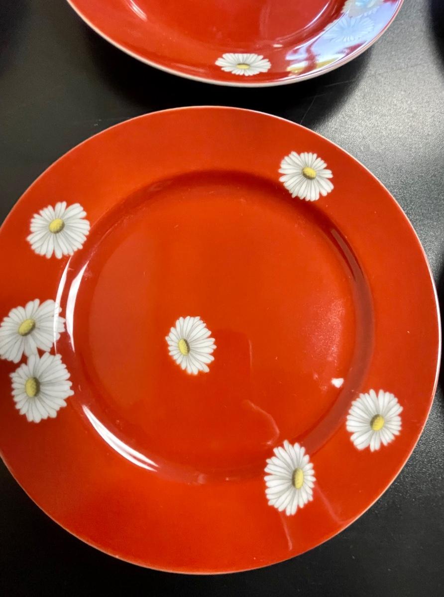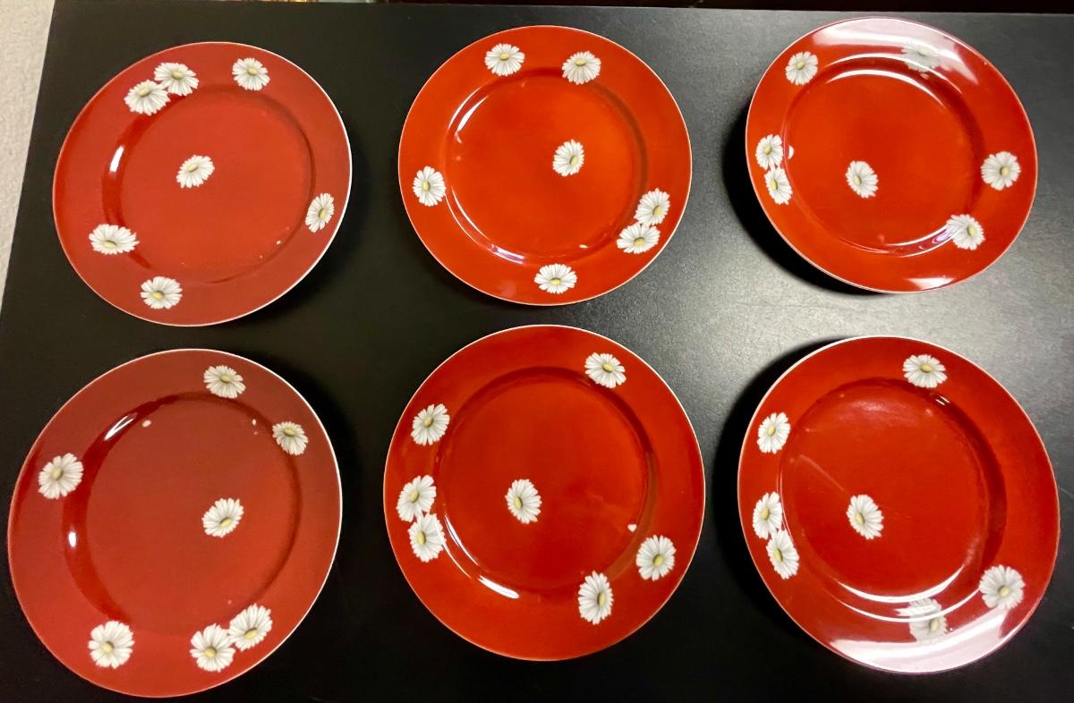Vintage pattern of Noritake white chrysanthemum on red background. In good condition, no chips, but white spot or two on most plates. The spots appear to be under glaze, so we think they were done during manufacturing.