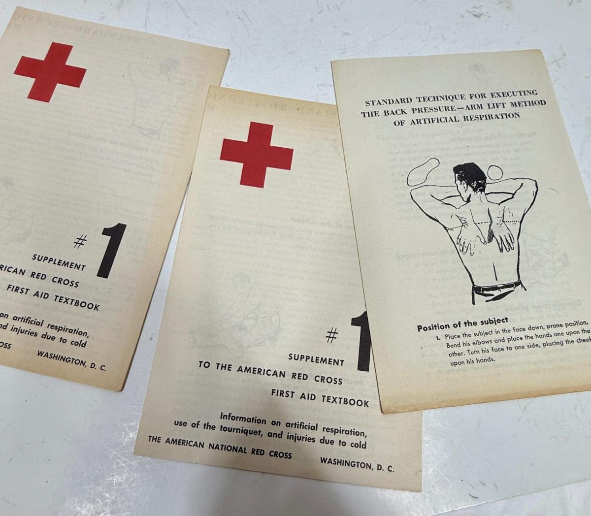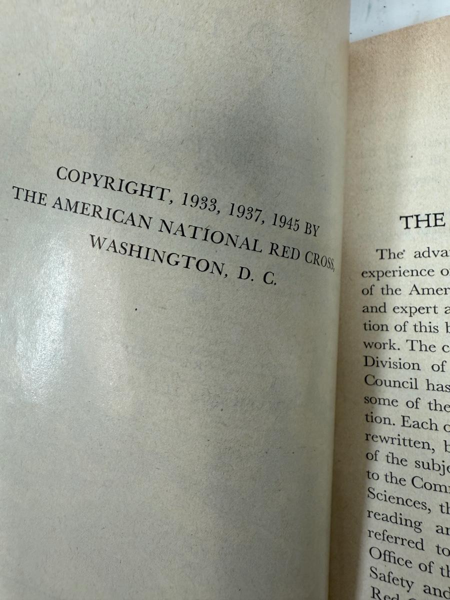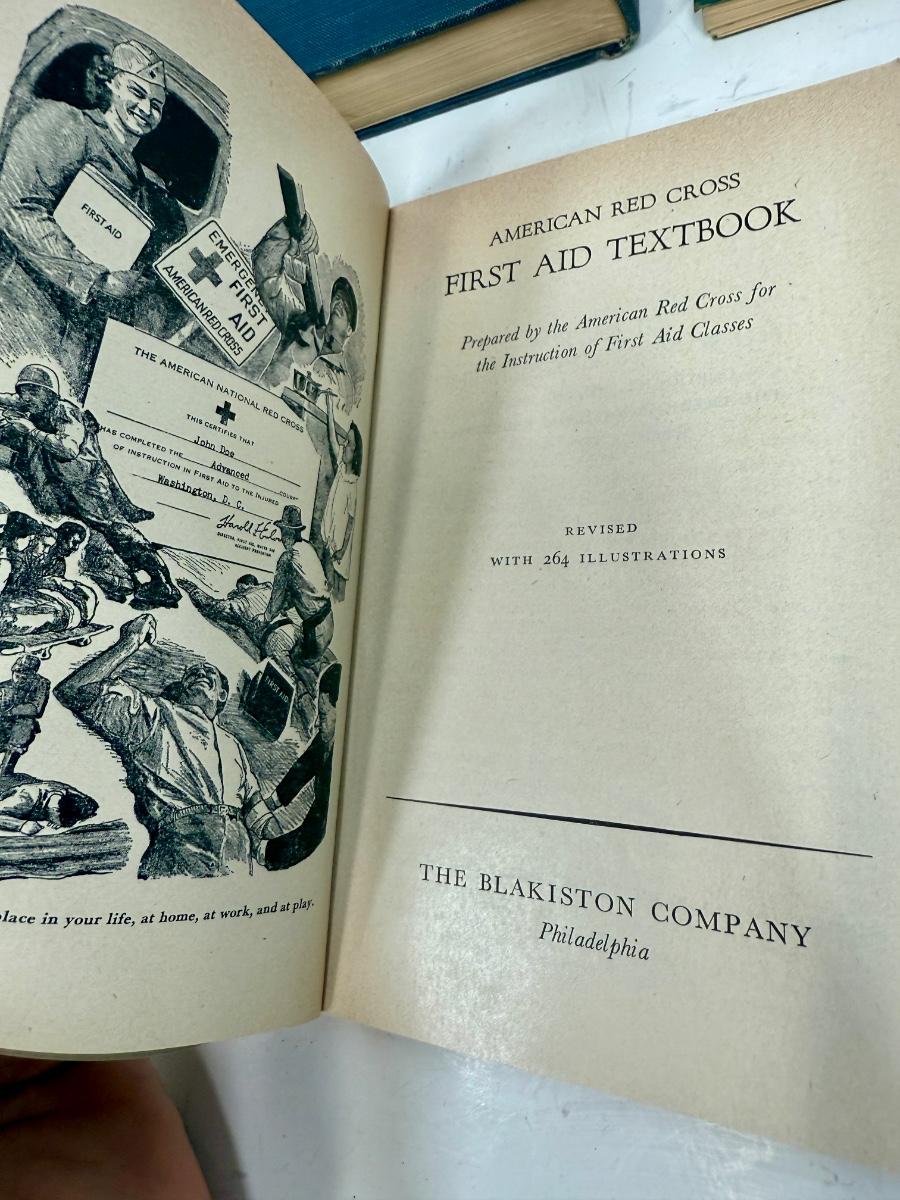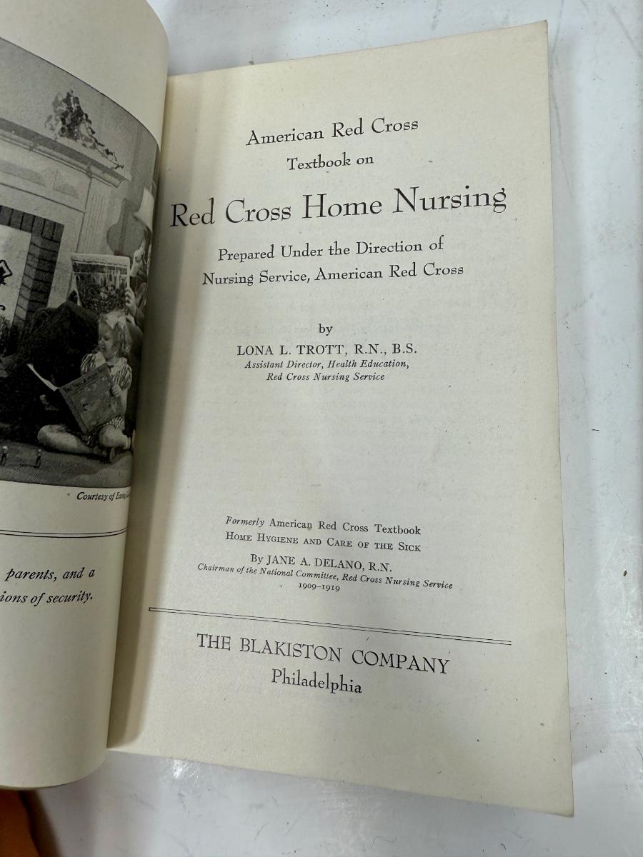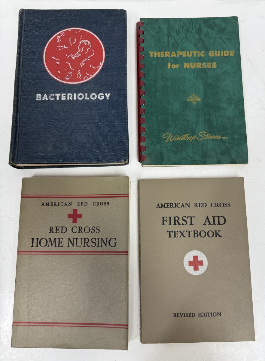 Titles include: Bacteriology, Red Cross Home Nursing, First Aid textbook, and Therapeutic Guide for Nurses.