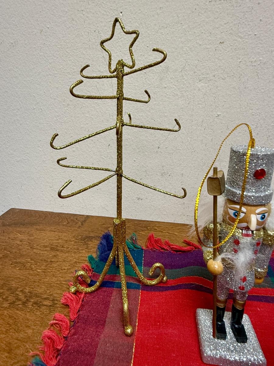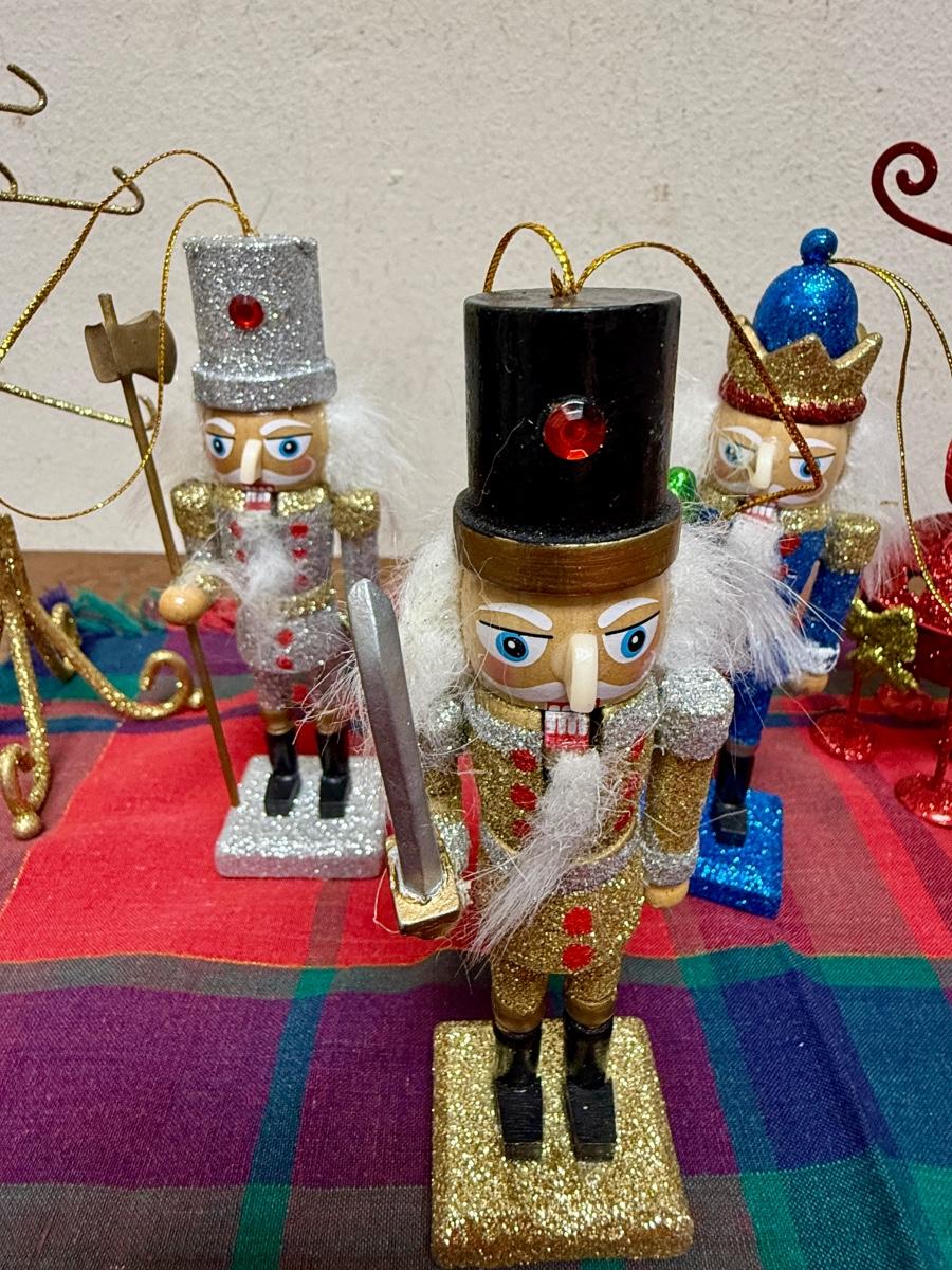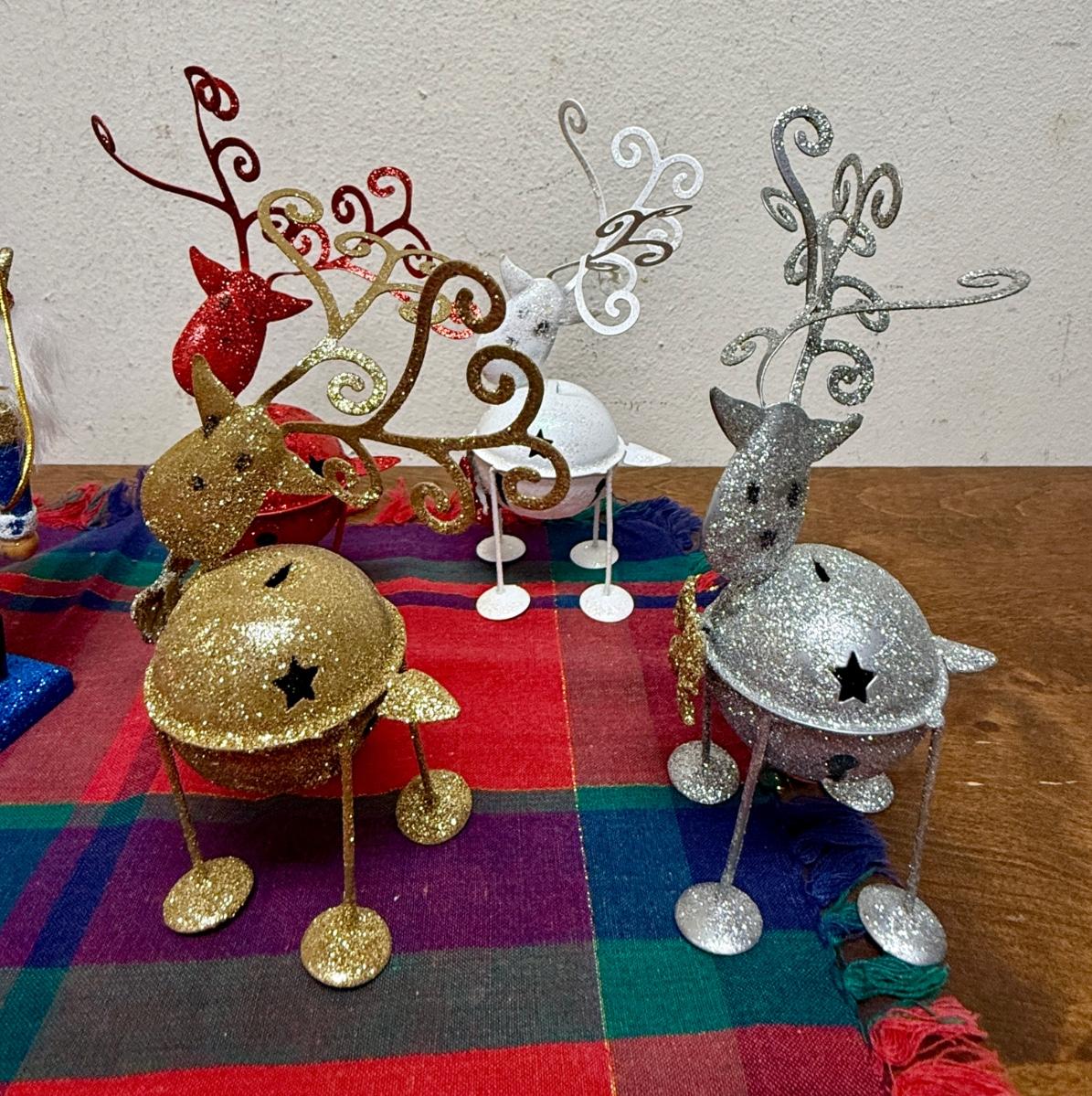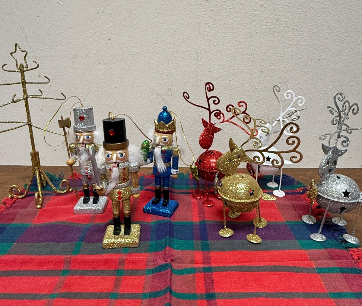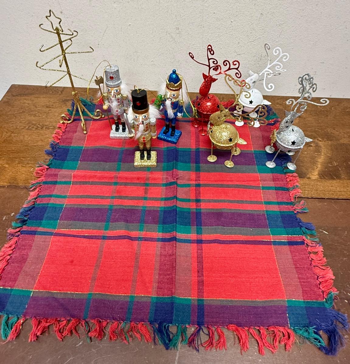 Christmas Decor Lot - Plaid Table Covering, 4 metal reindeer, 3 nutcrackers and gold painted dollhouse sized coat stand