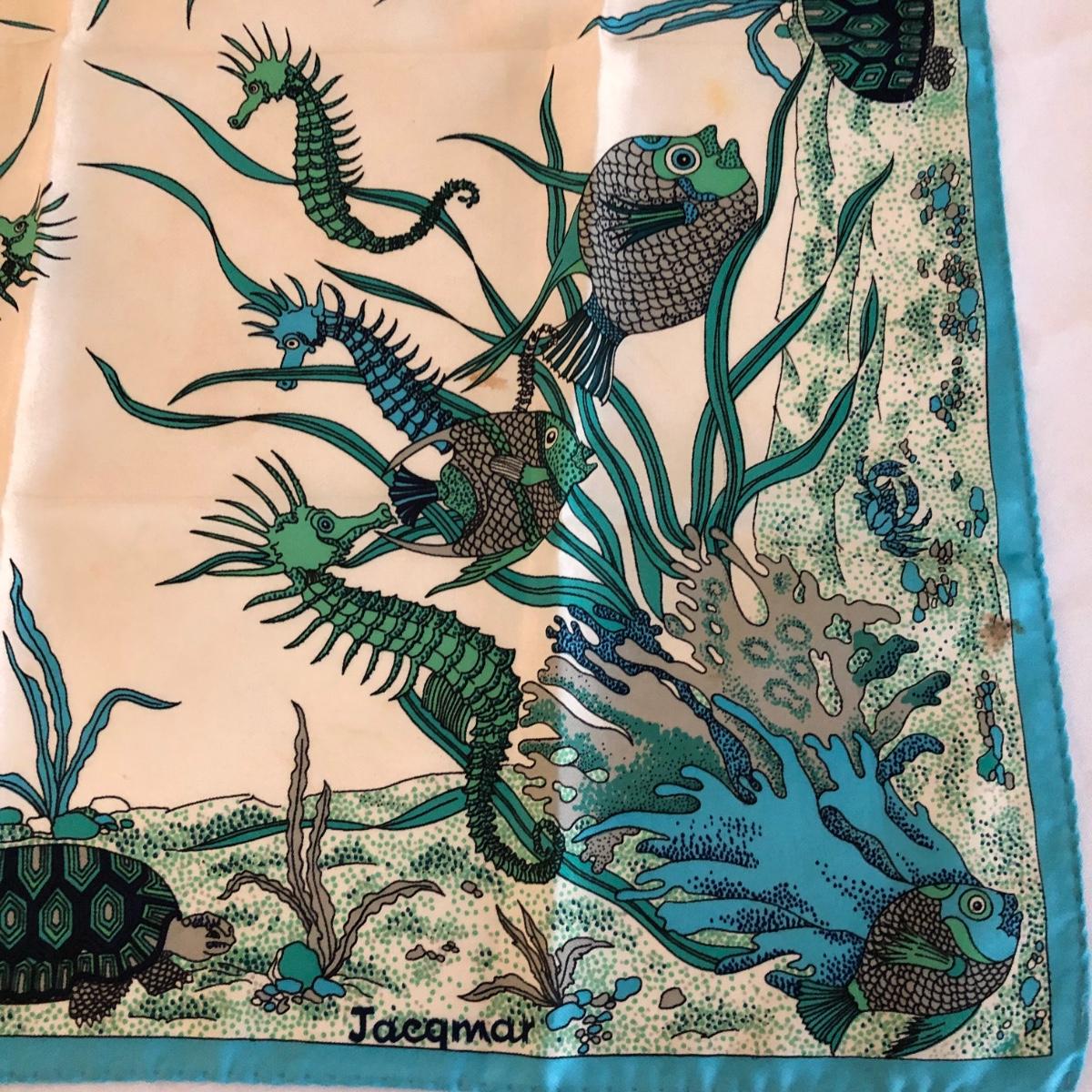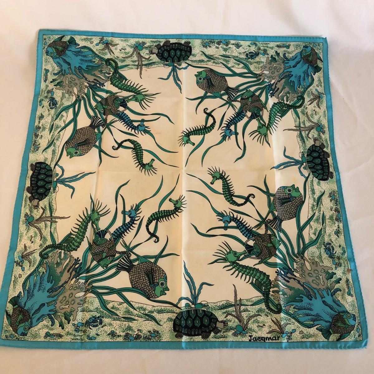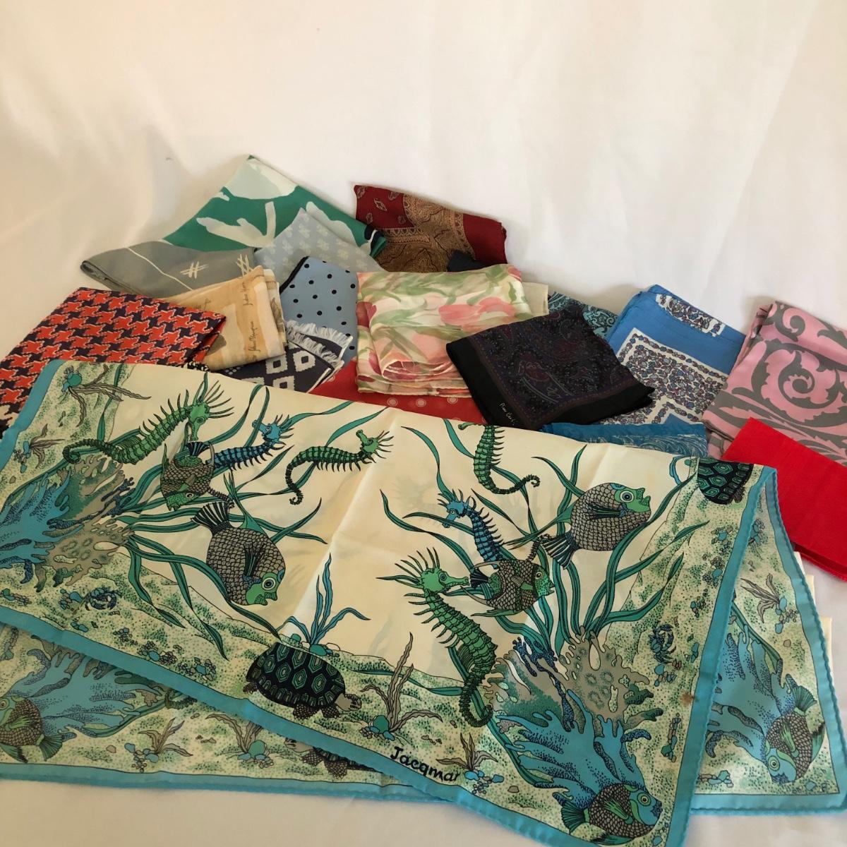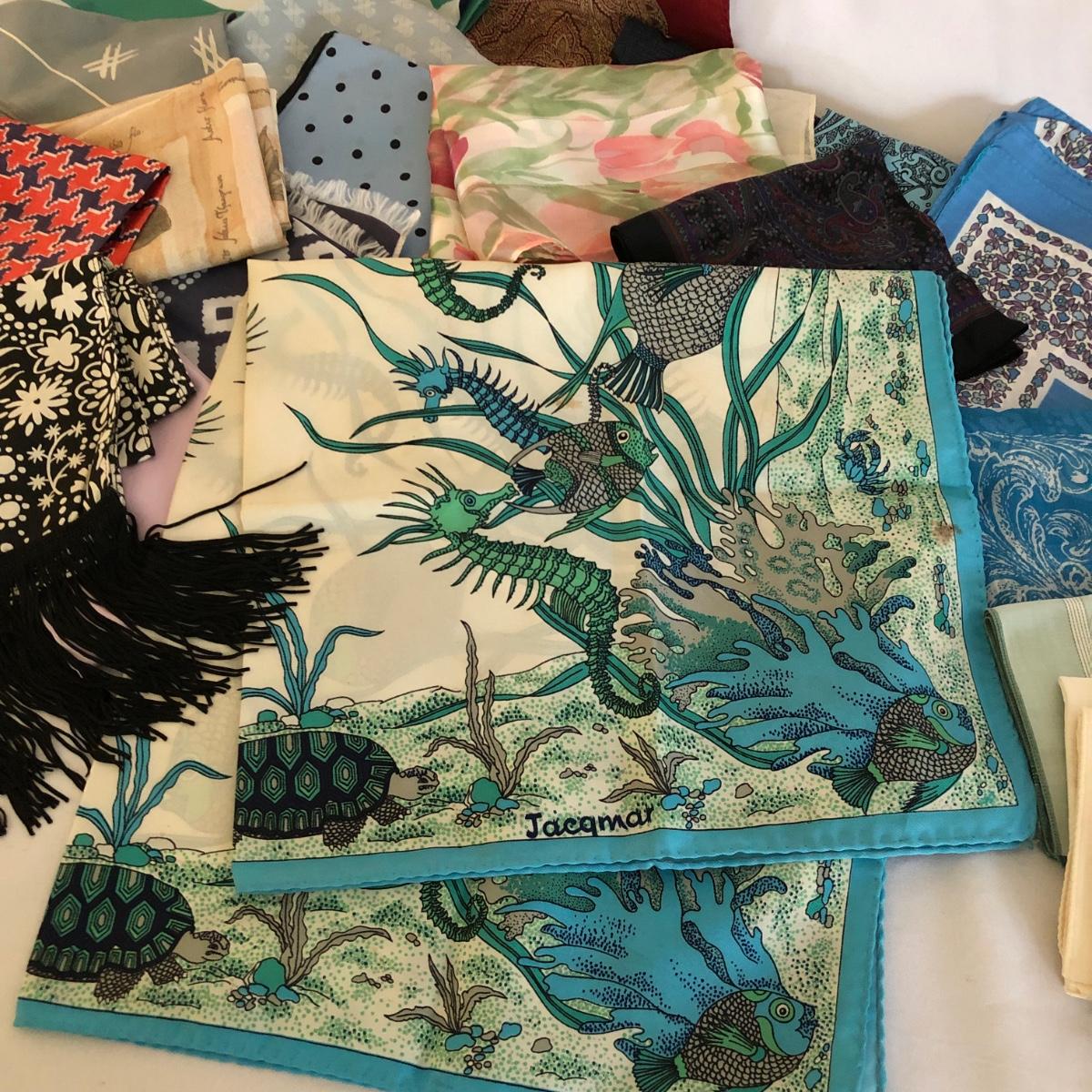 This collection of silk scarves includes 19 scarves and 5 handkerchiefs. The Jacqmar scarf is an underwater scene with seahorses, fish, and turtles. This blue, green, grey, and white scarf measures 26.5” x 26”. The Jacqmar scarf has some areas with small stains as pictured. Shipping available.