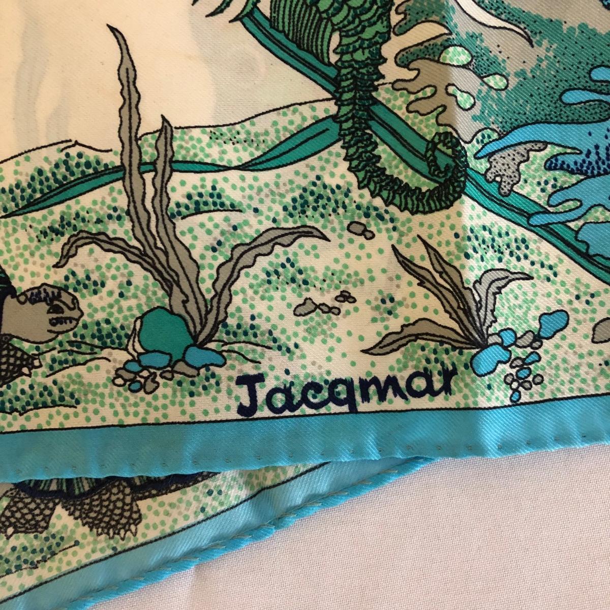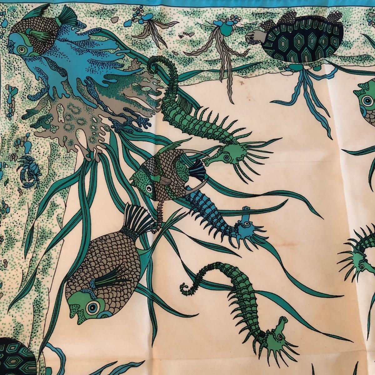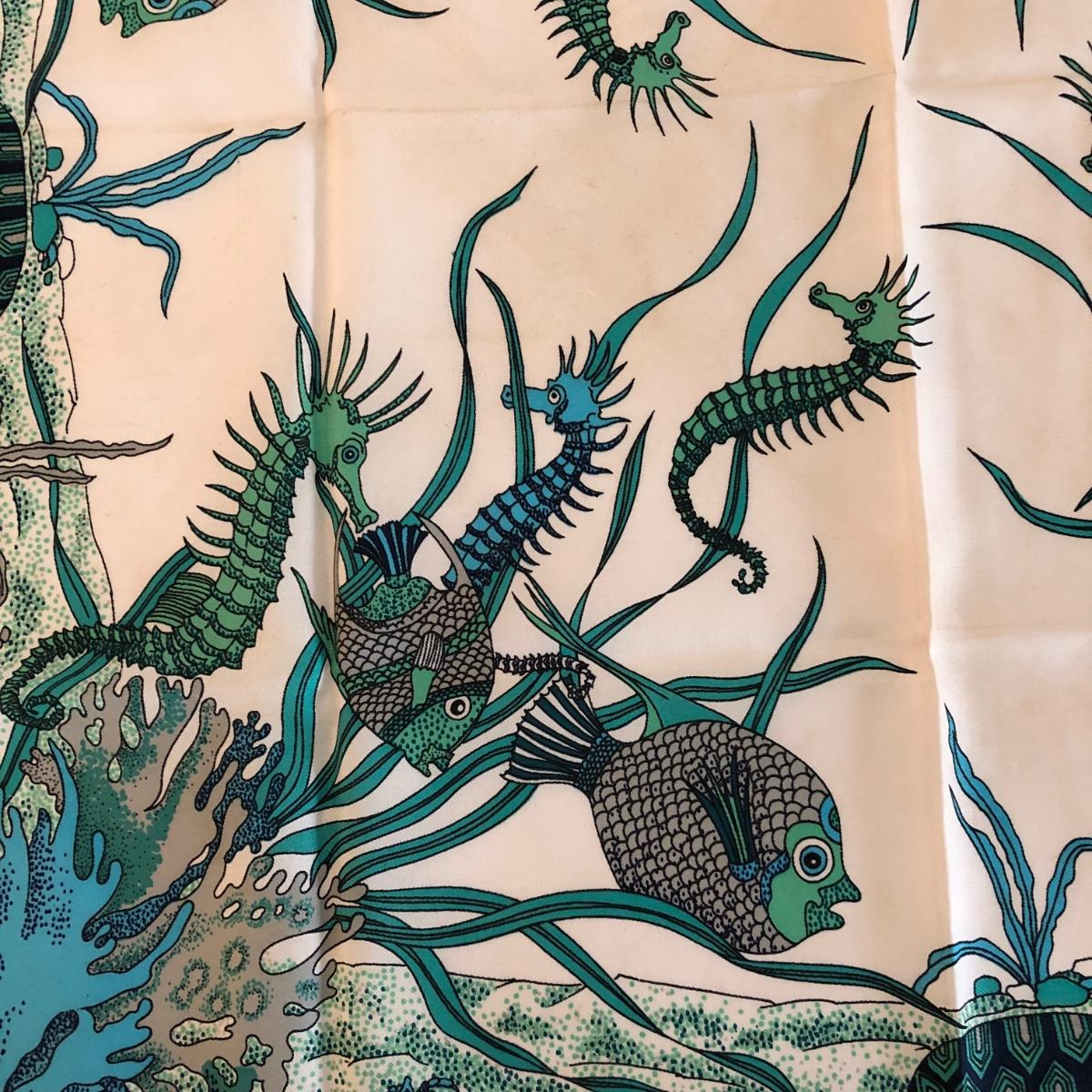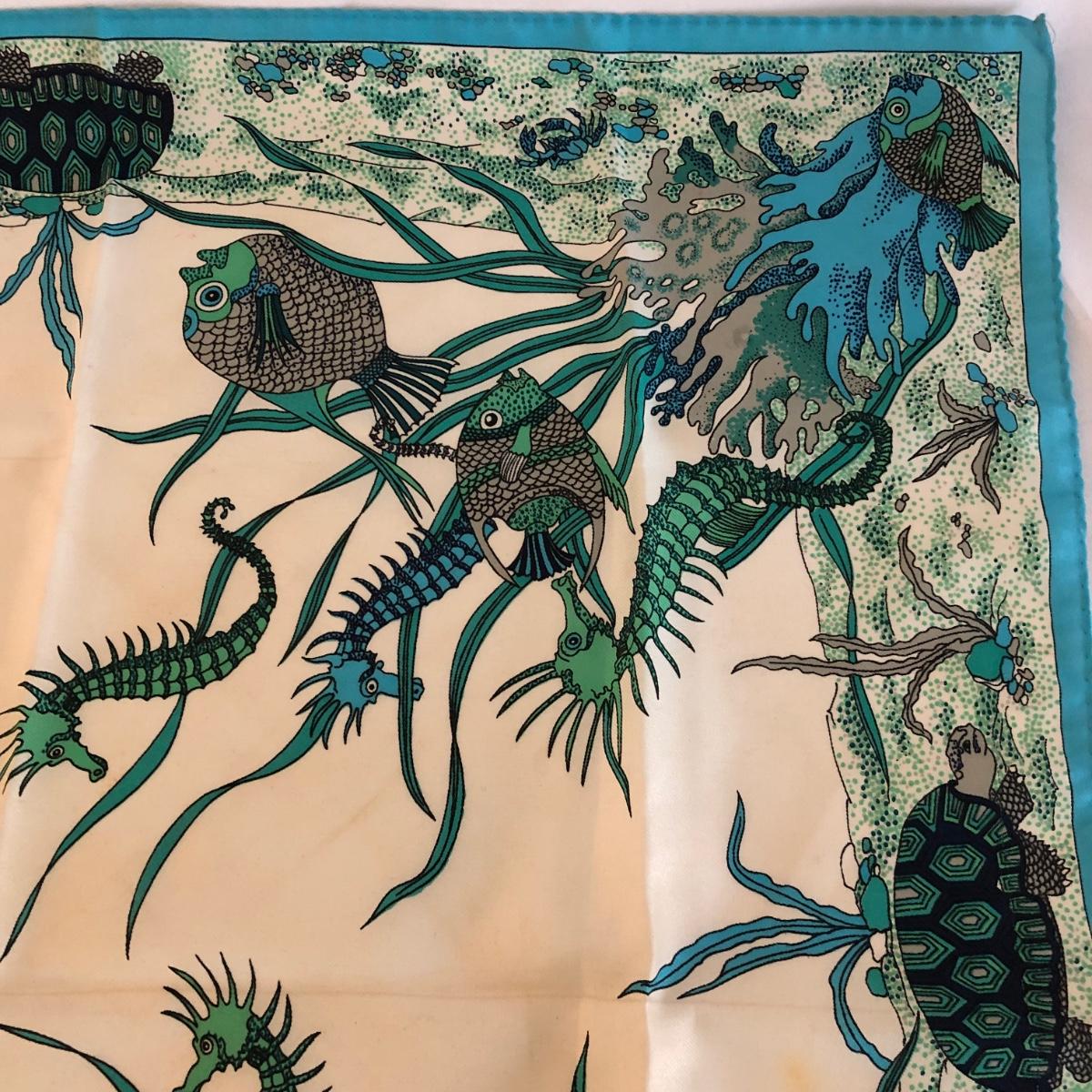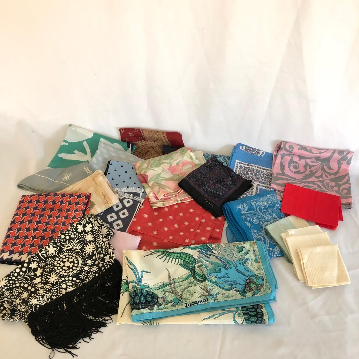 This collection of silk scarves includes 19 scarves and 5 handkerchiefs. The Jacqmar scarf is an underwater scene with seahorses, fish, and turtles. This blue, green, grey, and white scarf measures 26.5” x 26”. The Jacqmar scarf has some areas with small stains as pictured. Shipping available.