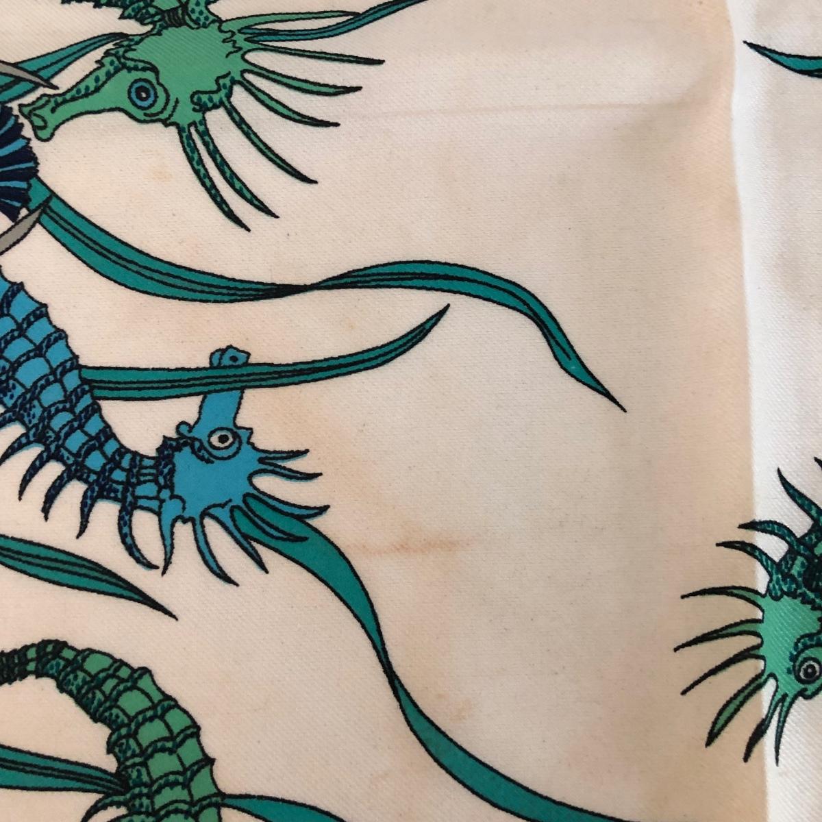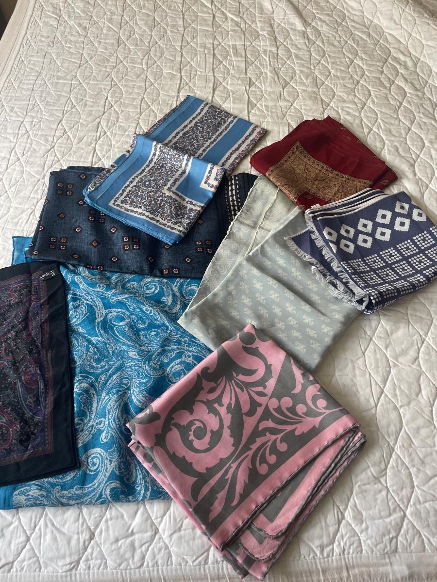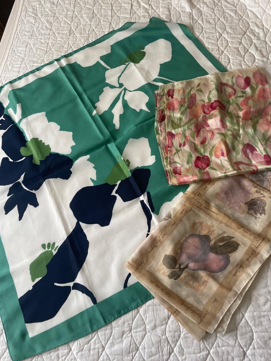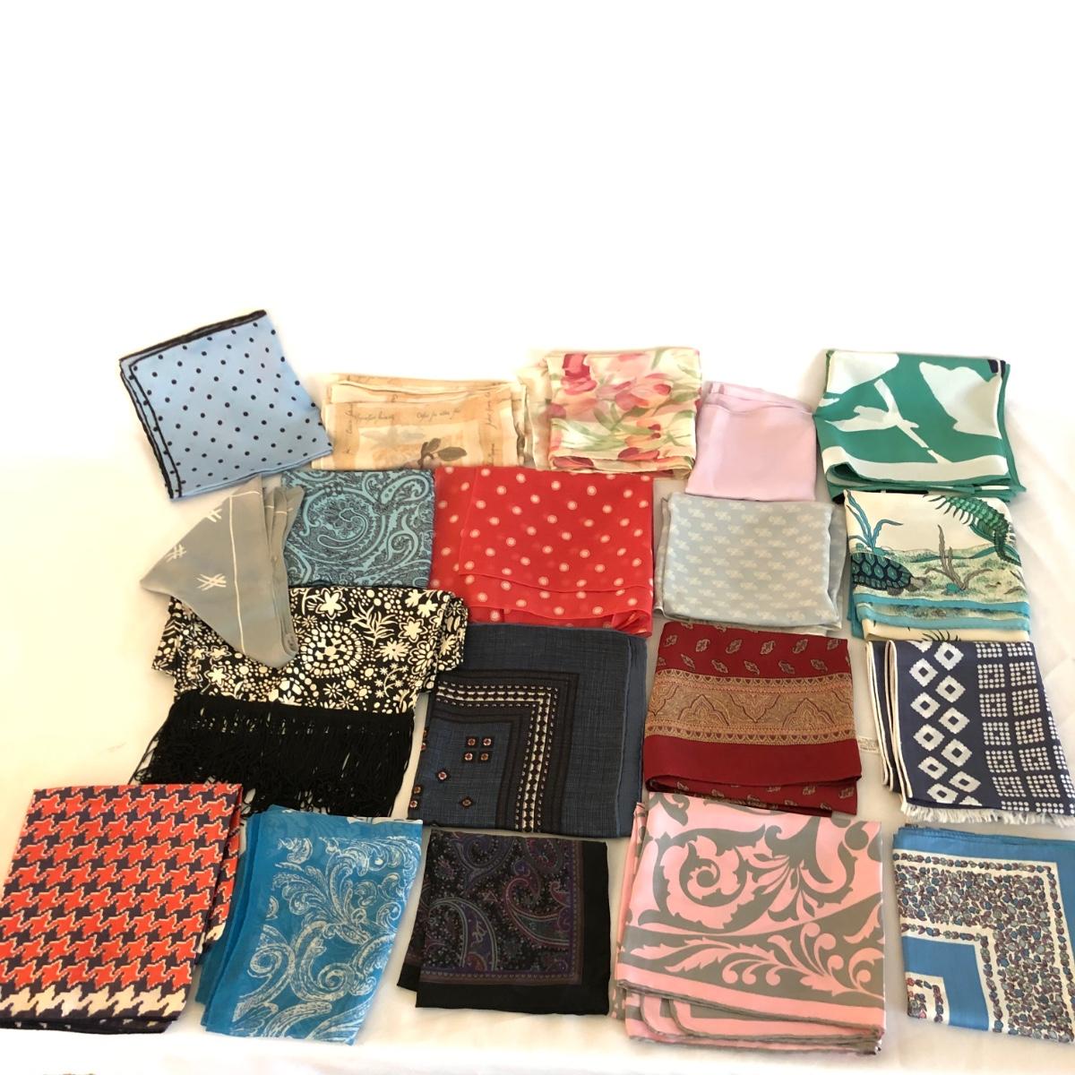 This collection of silk scarves includes 19 scarves and 5 handkerchiefs. The Jacqmar scarf is an underwater scene with seahorses, fish, and turtles. This blue, green, grey, and white scarf measures 26.5” x 26”. The Jacqmar scarf has some areas with small stains as pictured. Shipping available.