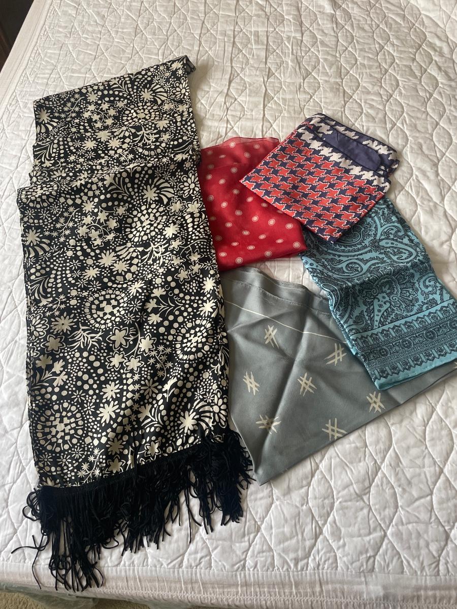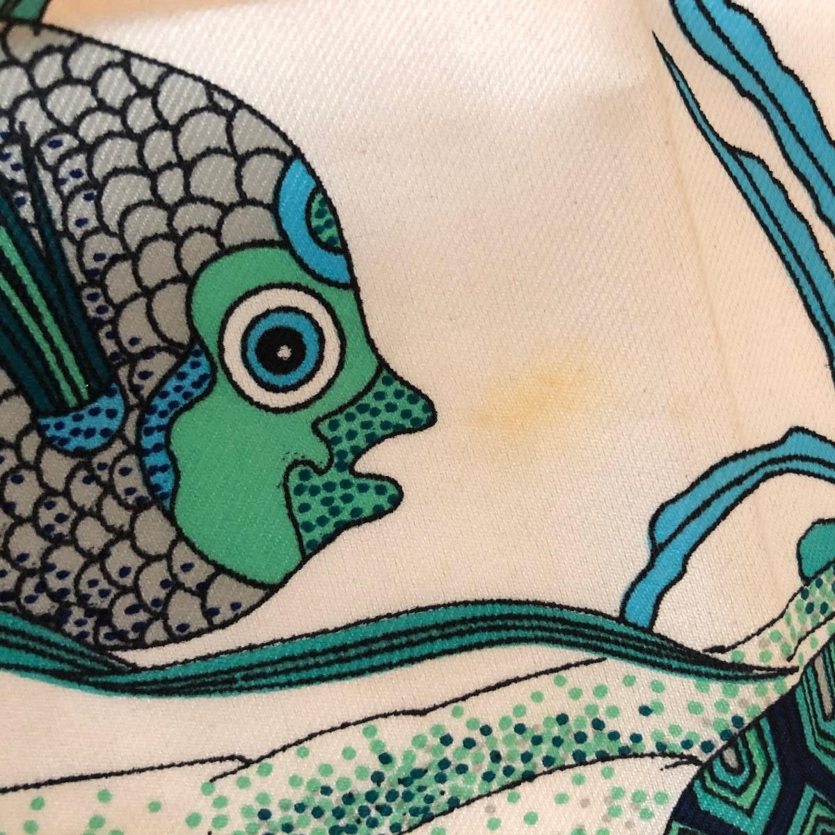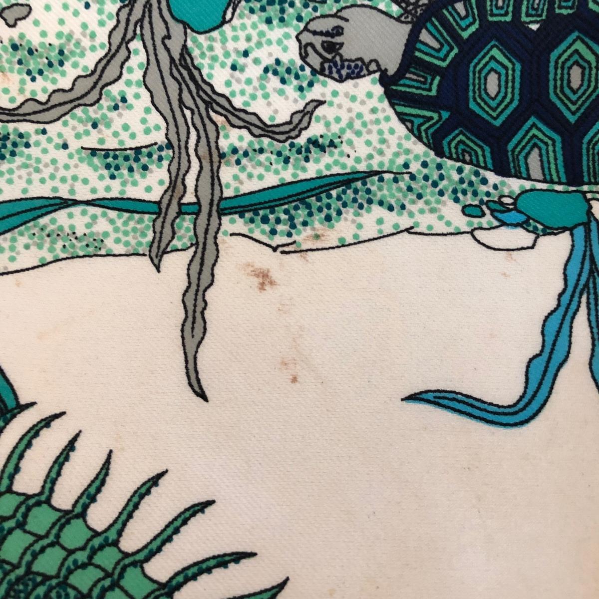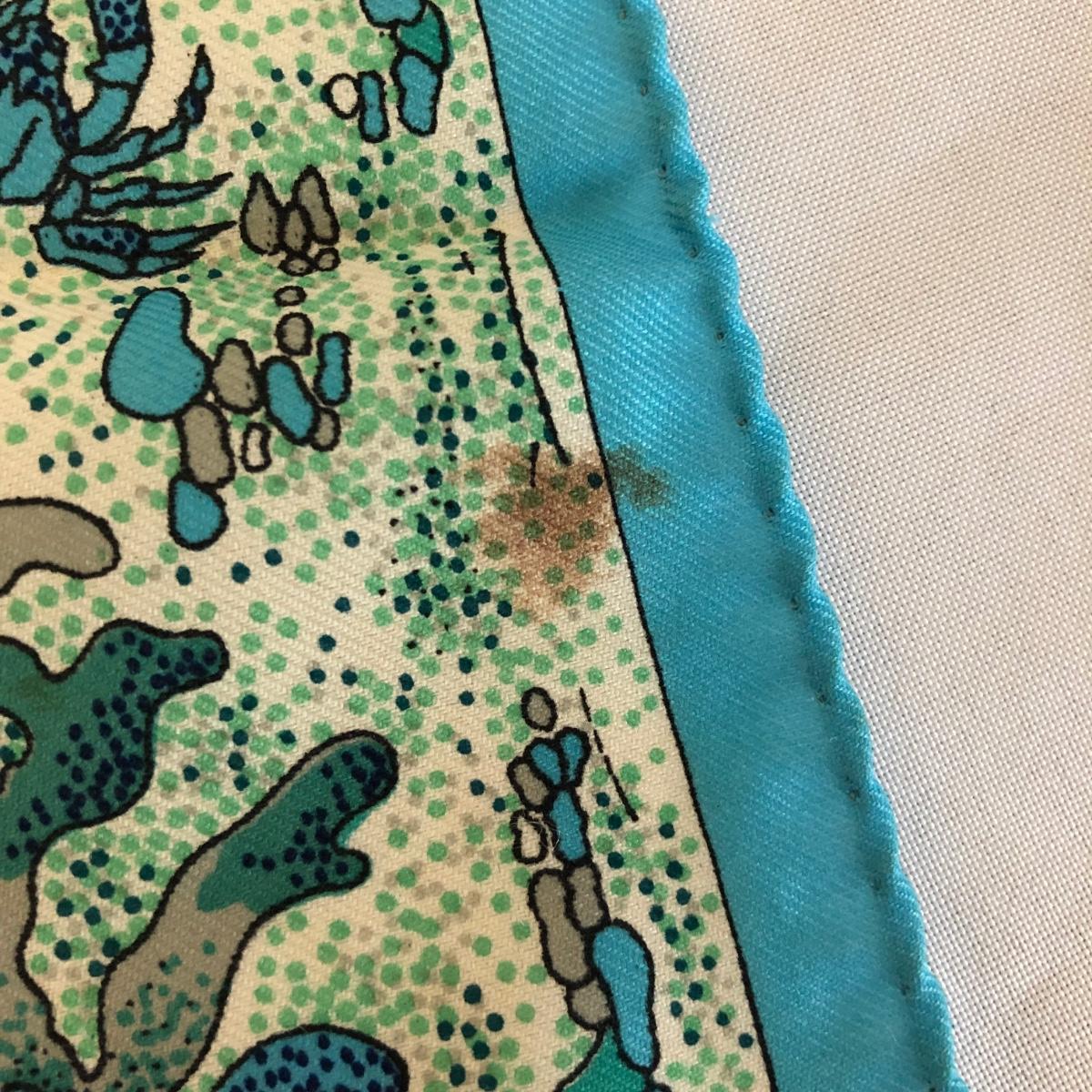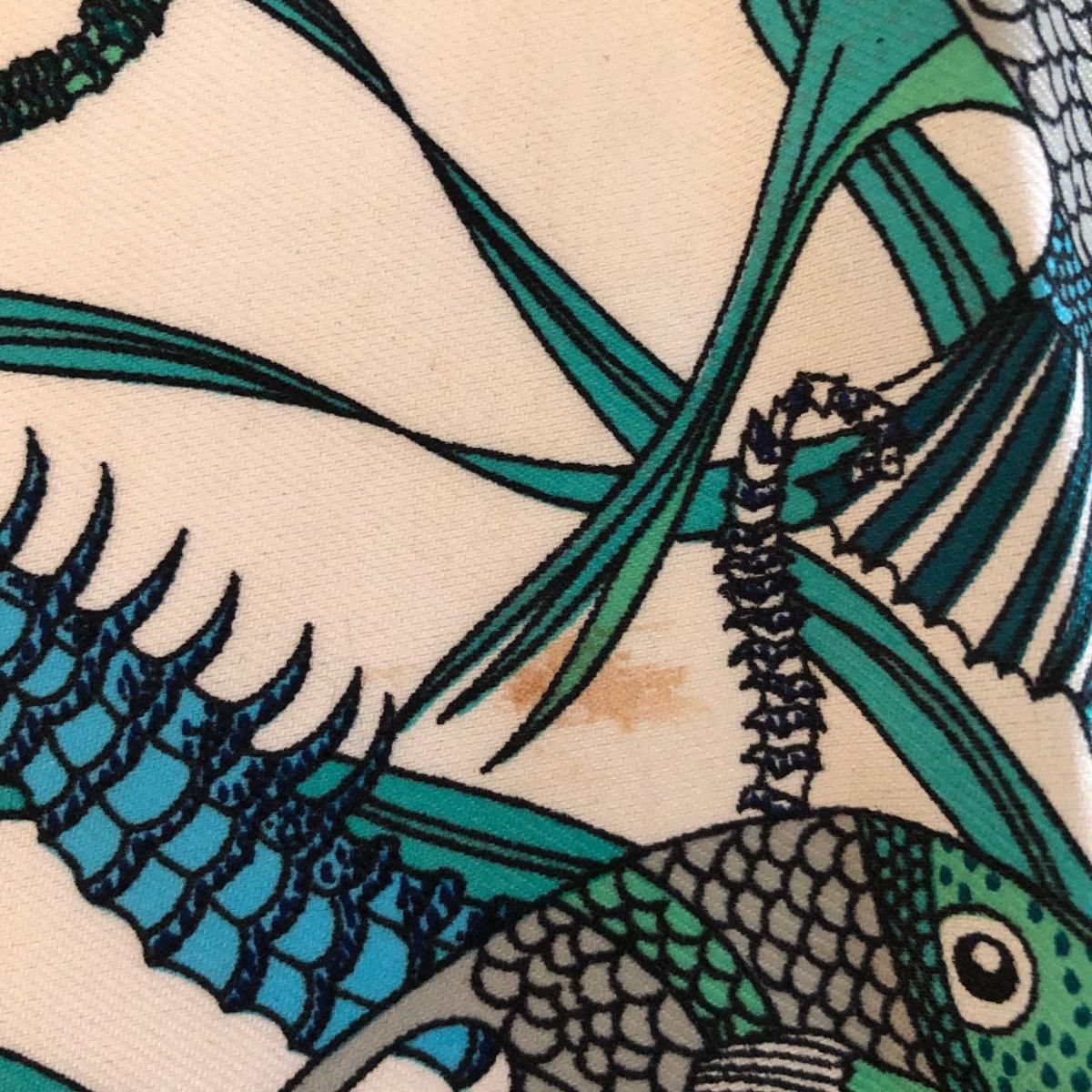 This collection of silk scarves includes 19 scarves and 5 handkerchiefs. The Jacqmar scarf is an underwater scene with seahorses, fish, and turtles. This blue, green, grey, and white scarf measures 26.5” x 26”. The Jacqmar scarf has some areas with small stains as pictured. Shipping available.