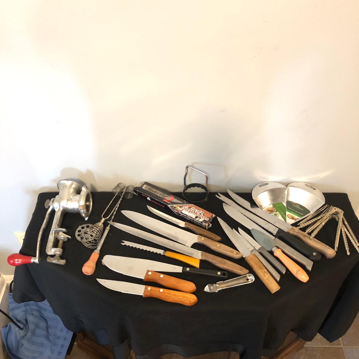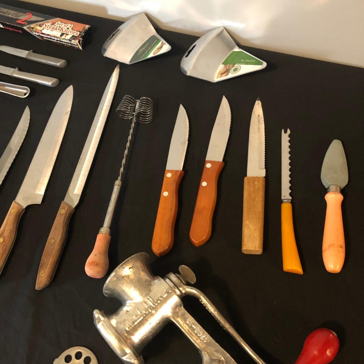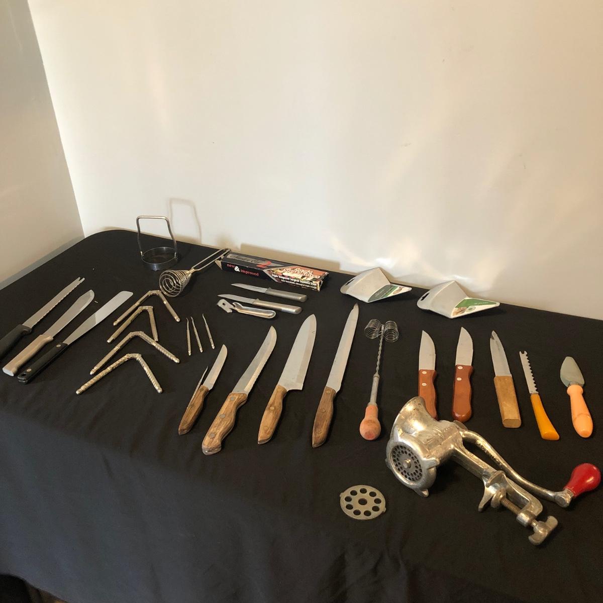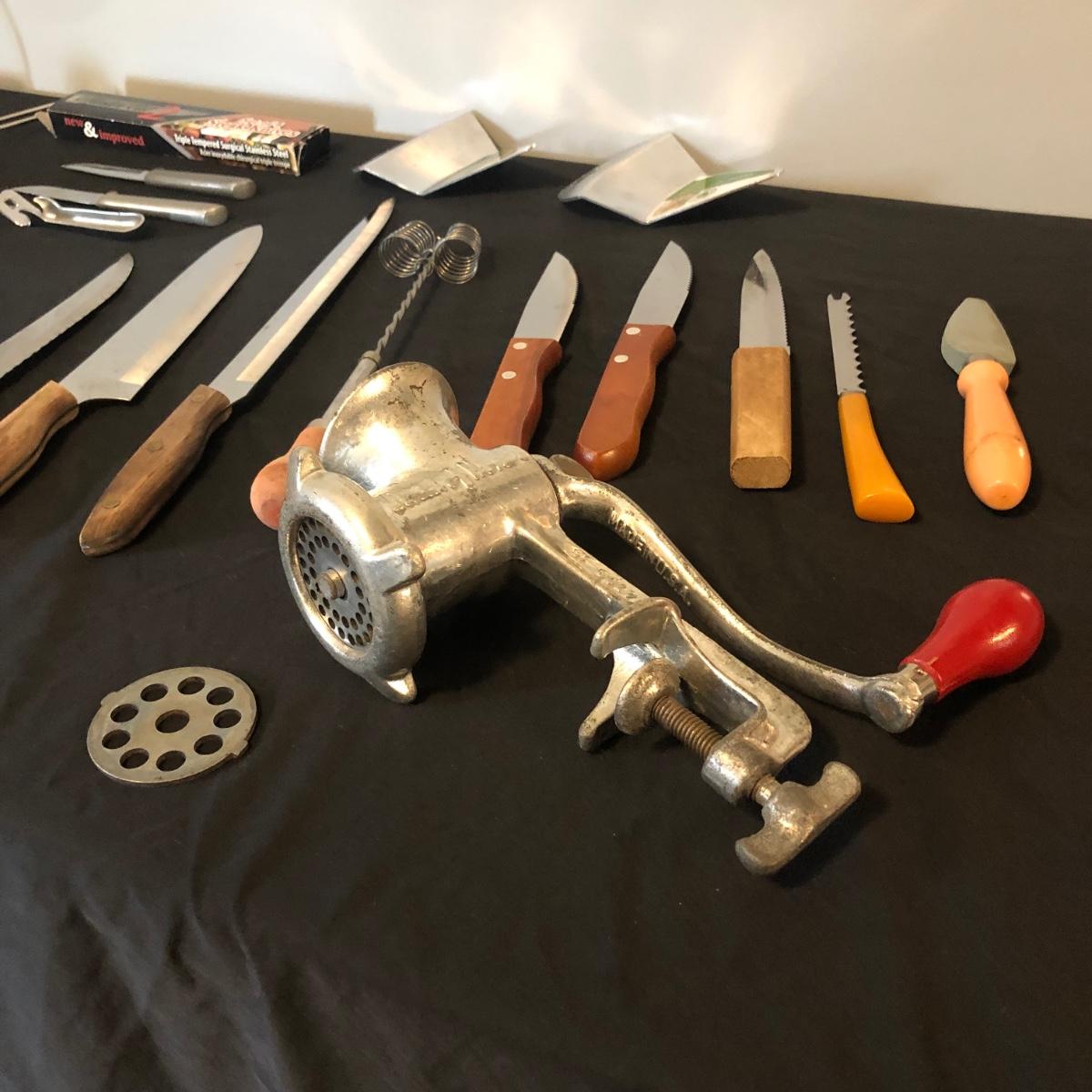 Vintage Kitchen Tools with Knives, Maid of Honour Meat Grinder, Lobster Crackers, and More (K-JF)