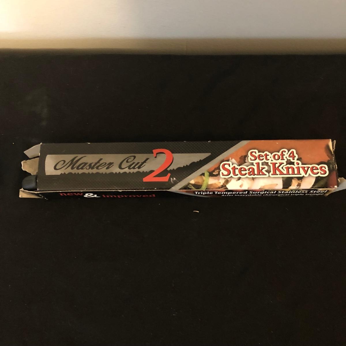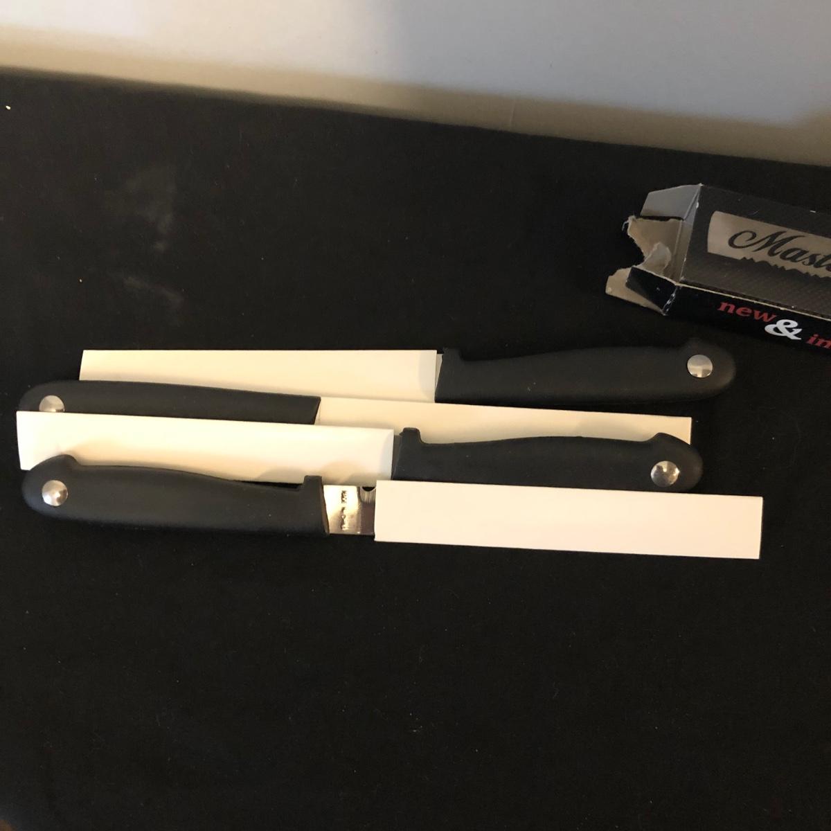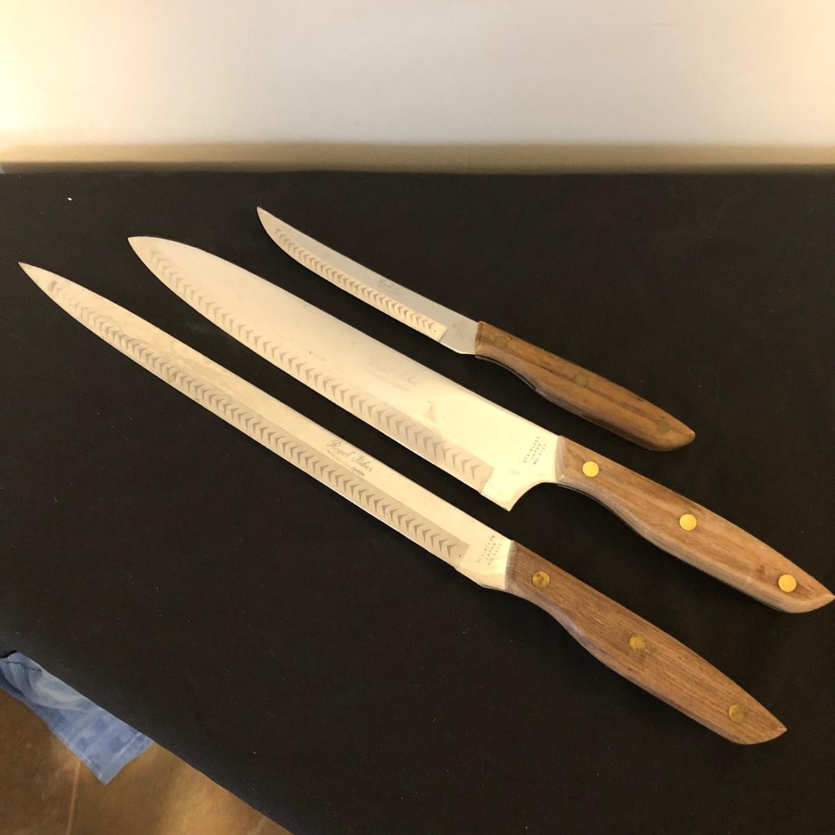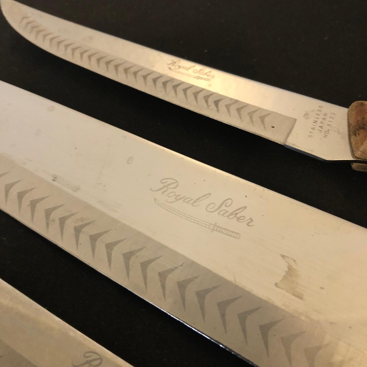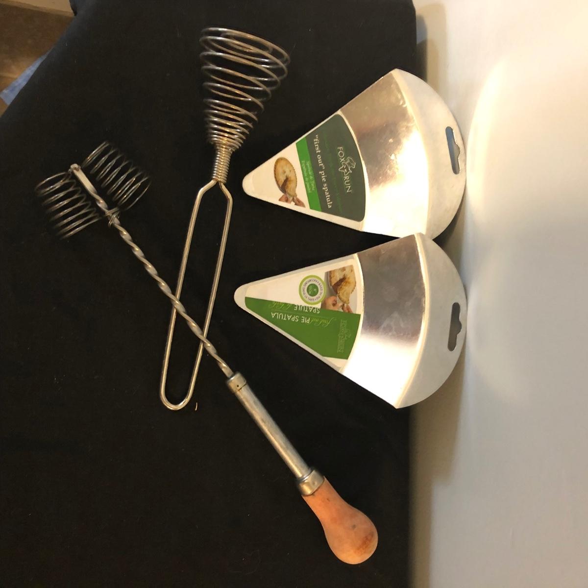 This selection of vintage kitchen tools includes a collection of cooking knives with 3 by Royal Sabre, a handheld knife sharpening stone tool, a group of lobster/nut crackers with picks, a Vintage Maid of Honour Meat grinder that is marked Made in USA, 3 Master Cut 2 steak knives in the box, 2 Fox Run pie spatulas, a biscuit cutter, a beer can opener, and more. Shipping available.