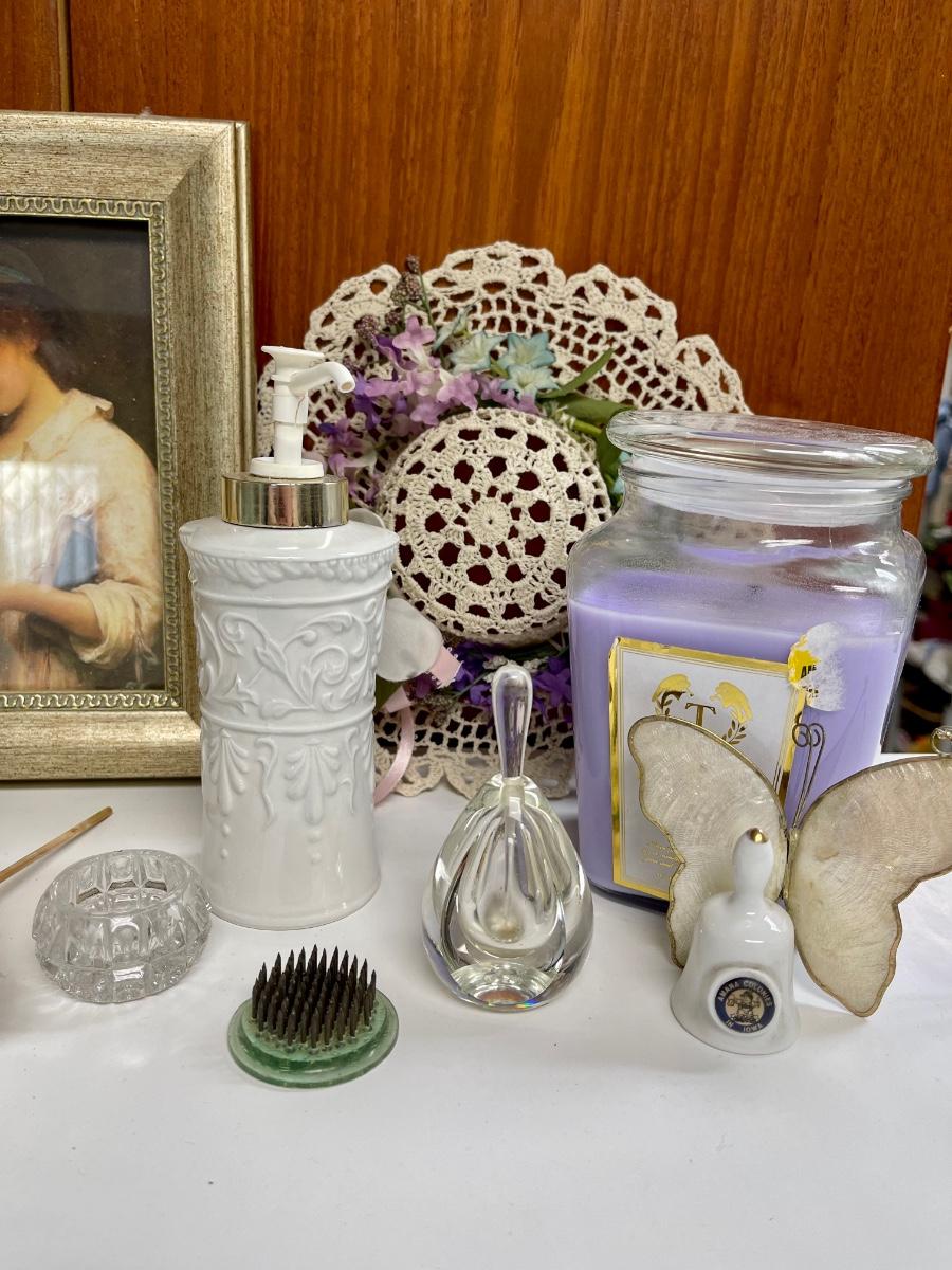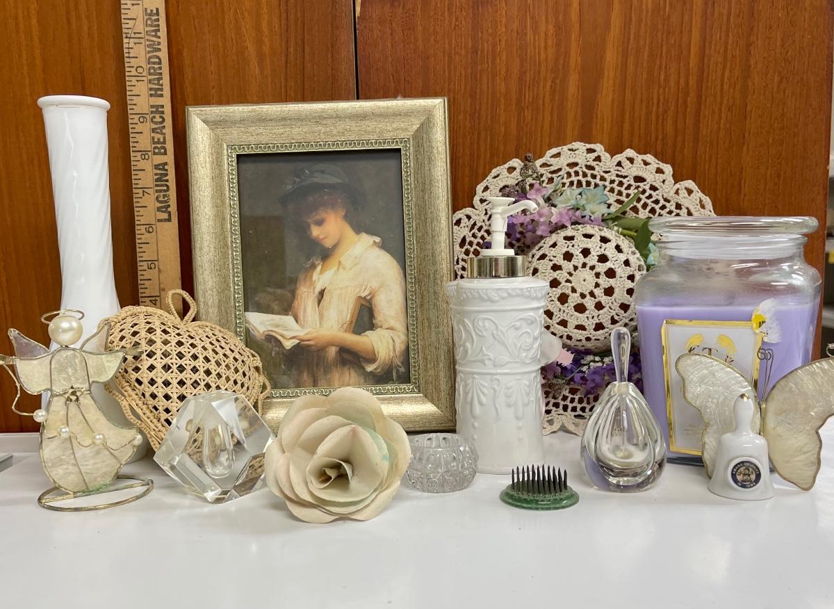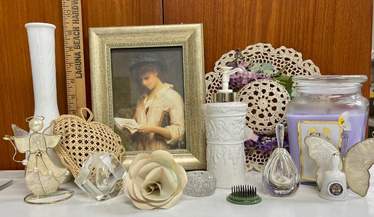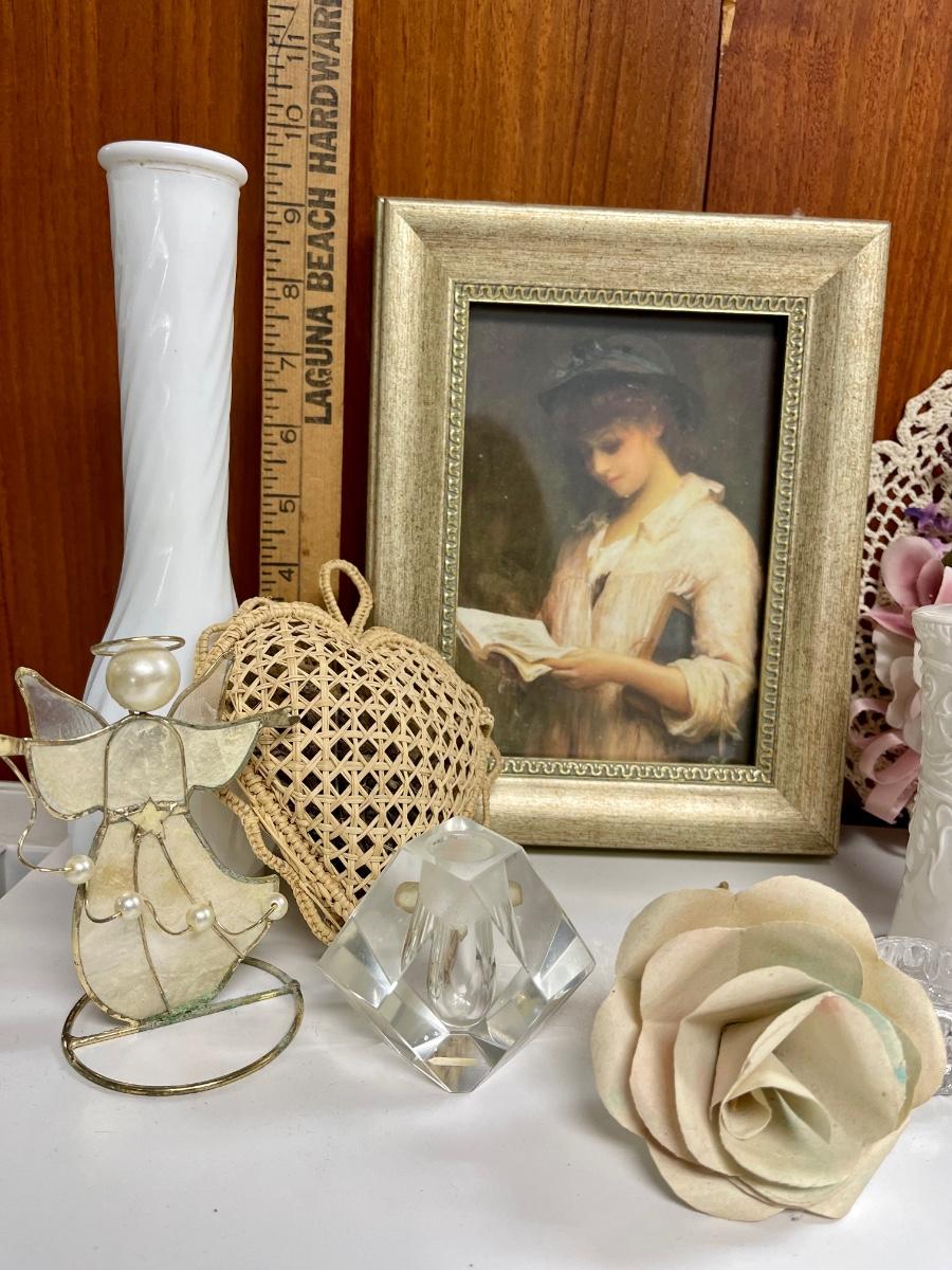 Home Decor Lot - Framed print, Starched Doille Hat, Starched Doille Heart, Soap, Candle, Perfume bottles, etc