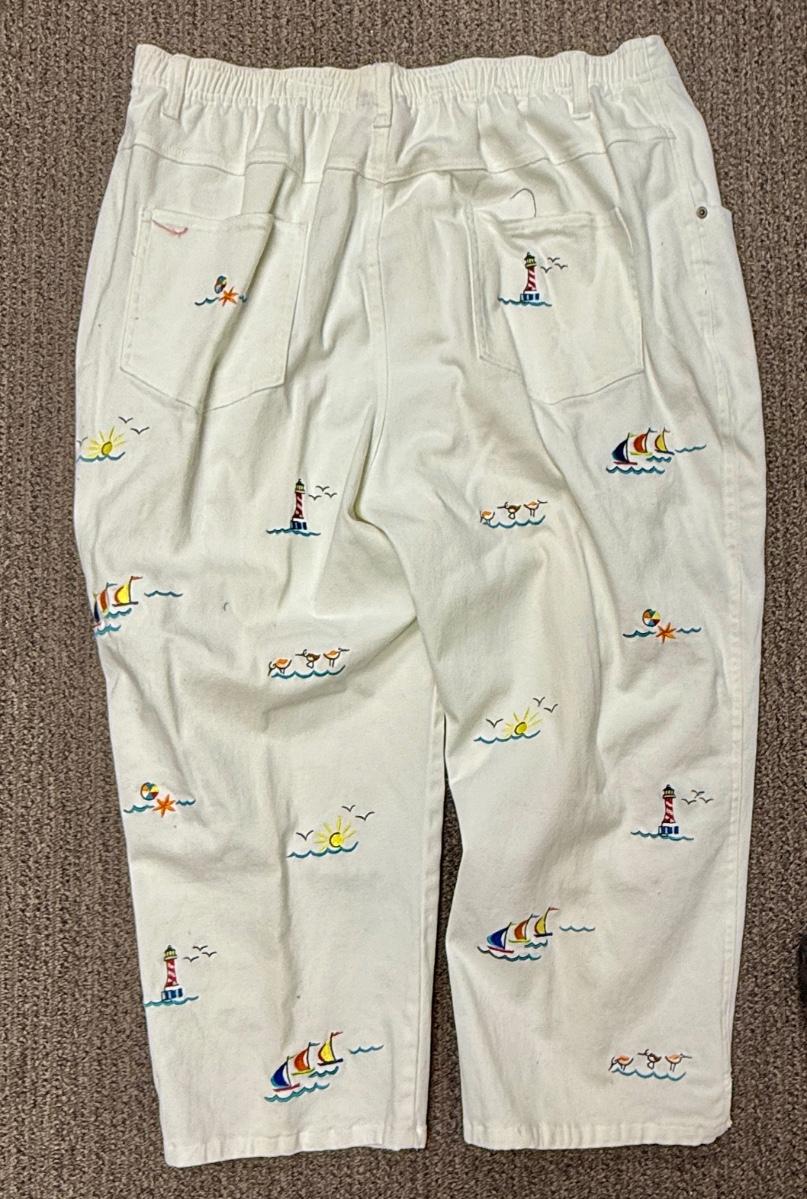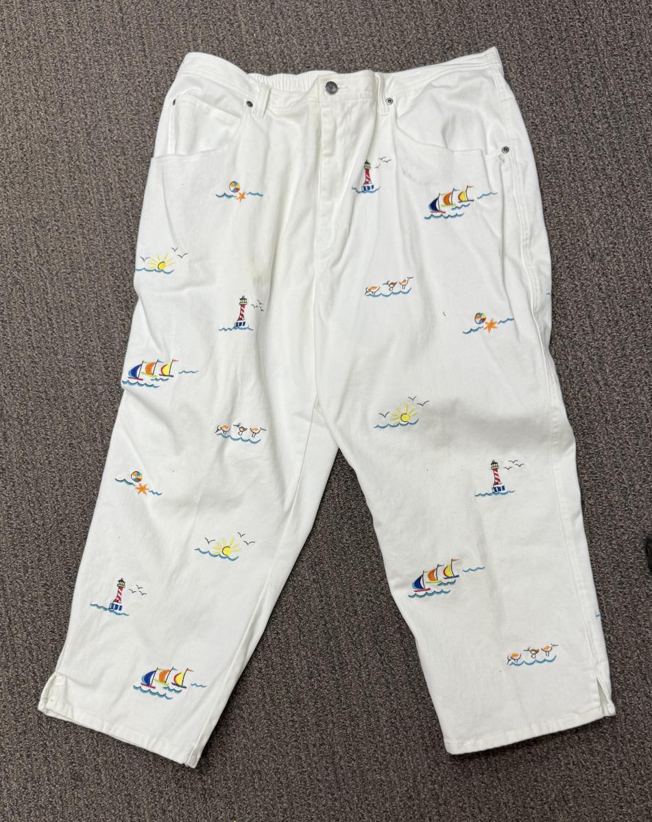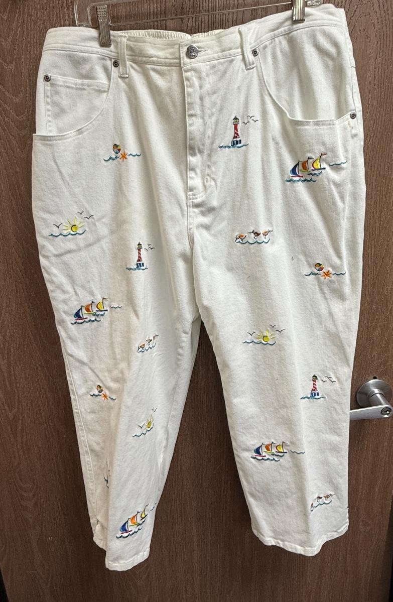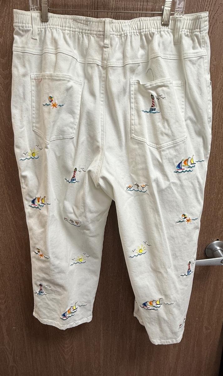 Quacker Factory size 1X Embroidered Sailboats on White Jeans Capri Style
