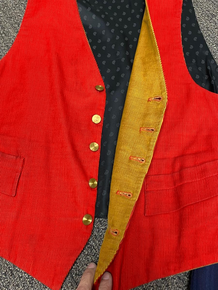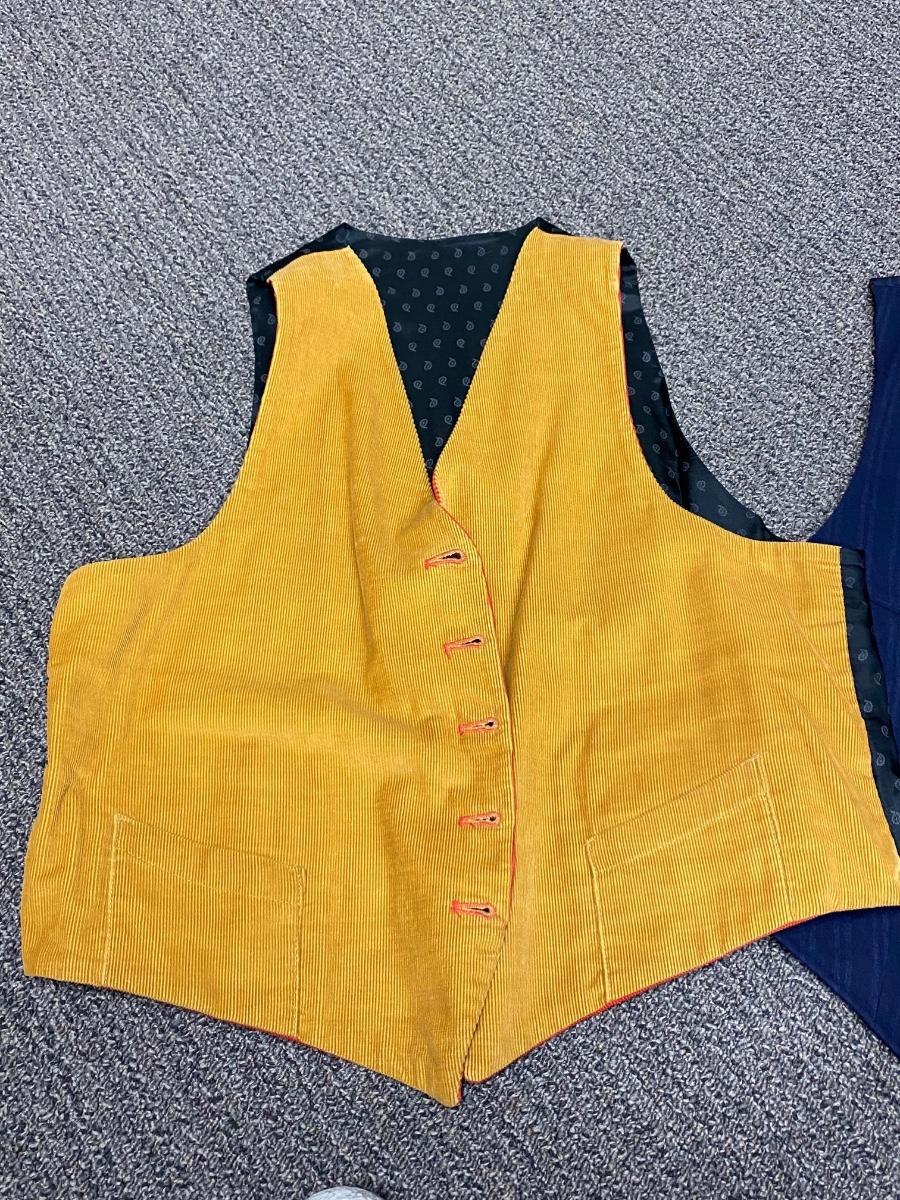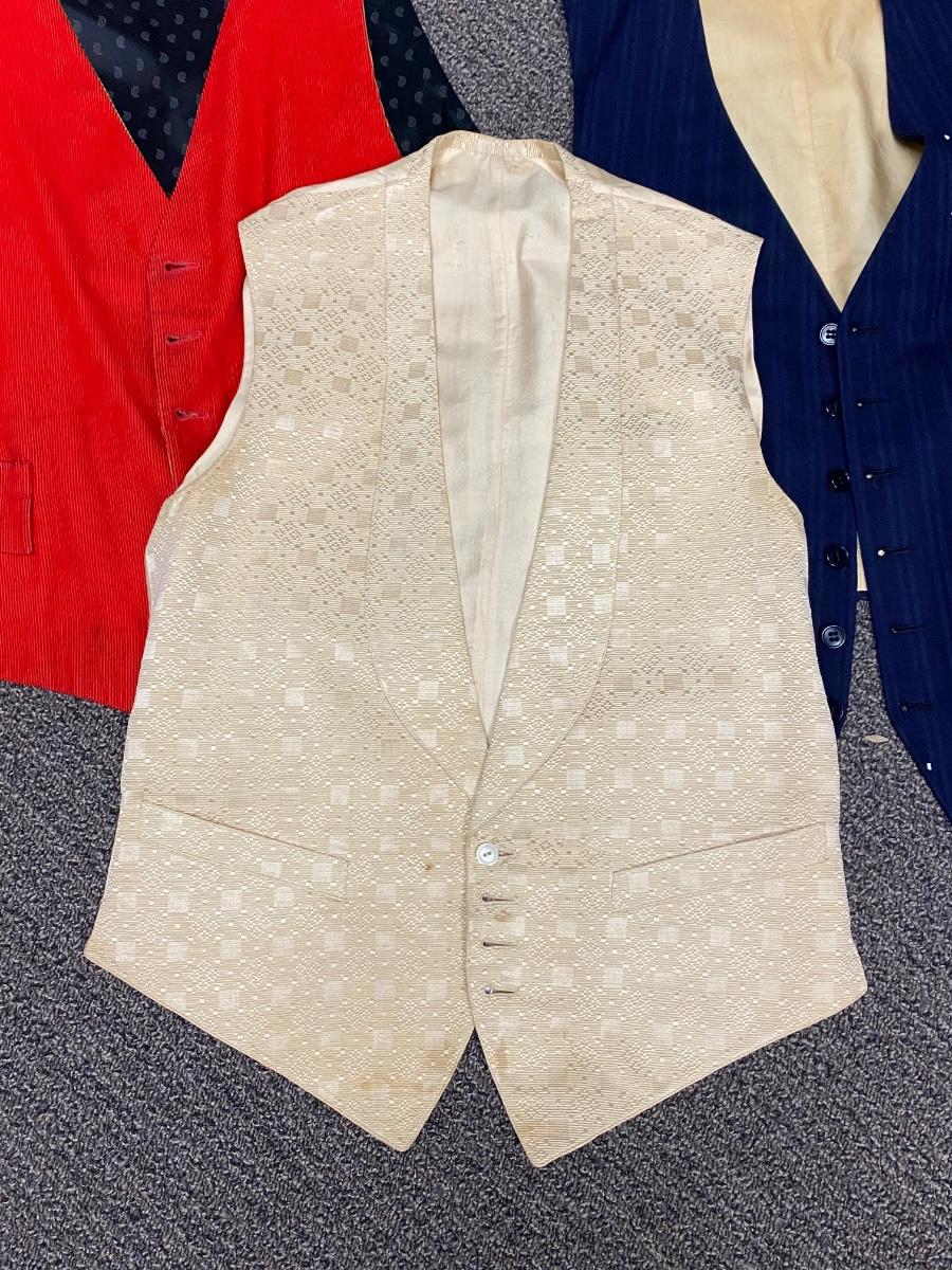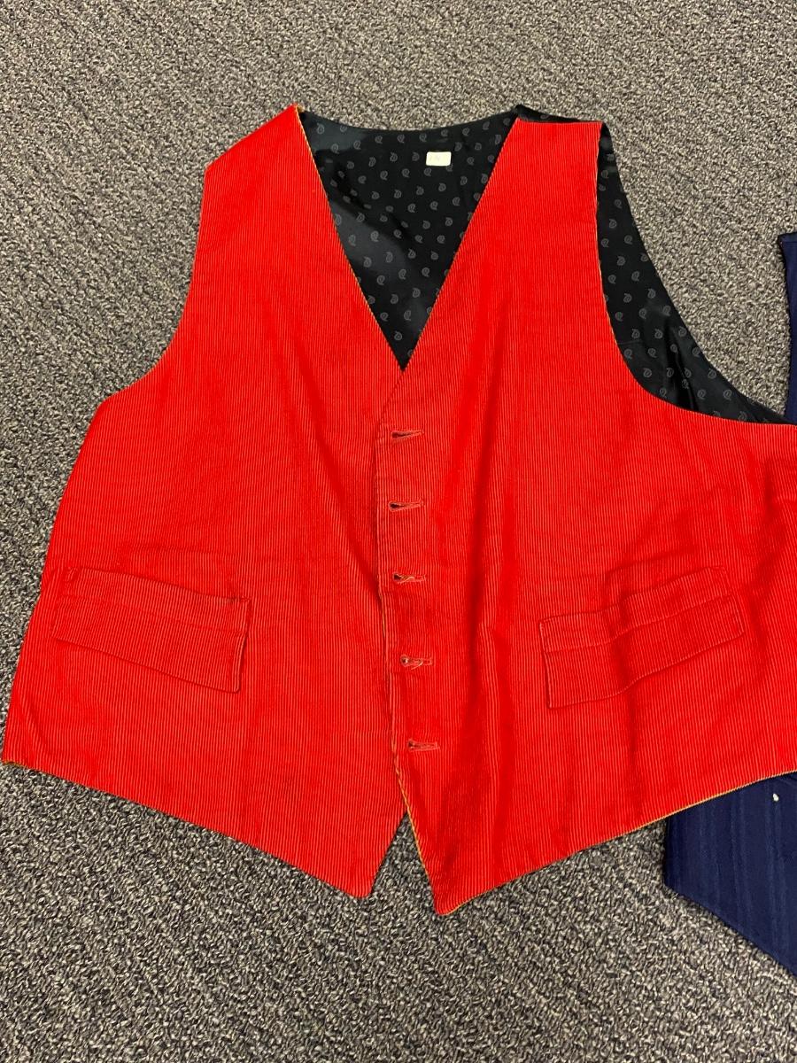 Set of 3 Victorian Vintage Button Front Vests. In good wearable vintage condition. The red corduroy vest is reversible to gold. All are the same size or very close to, arm pit to arm pit about 18".