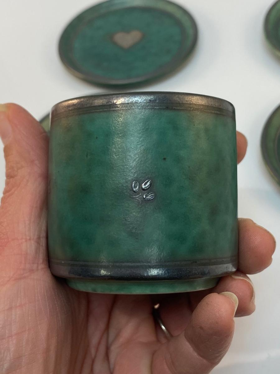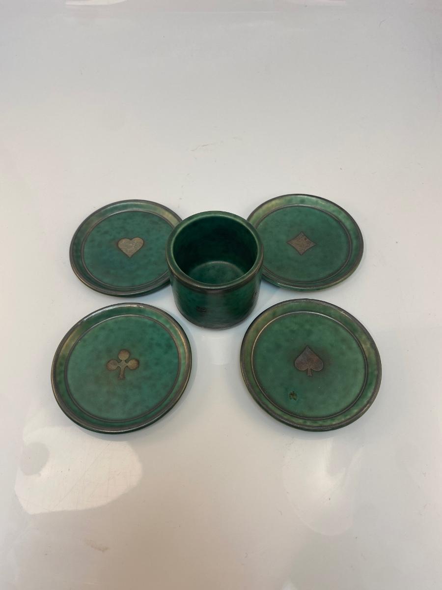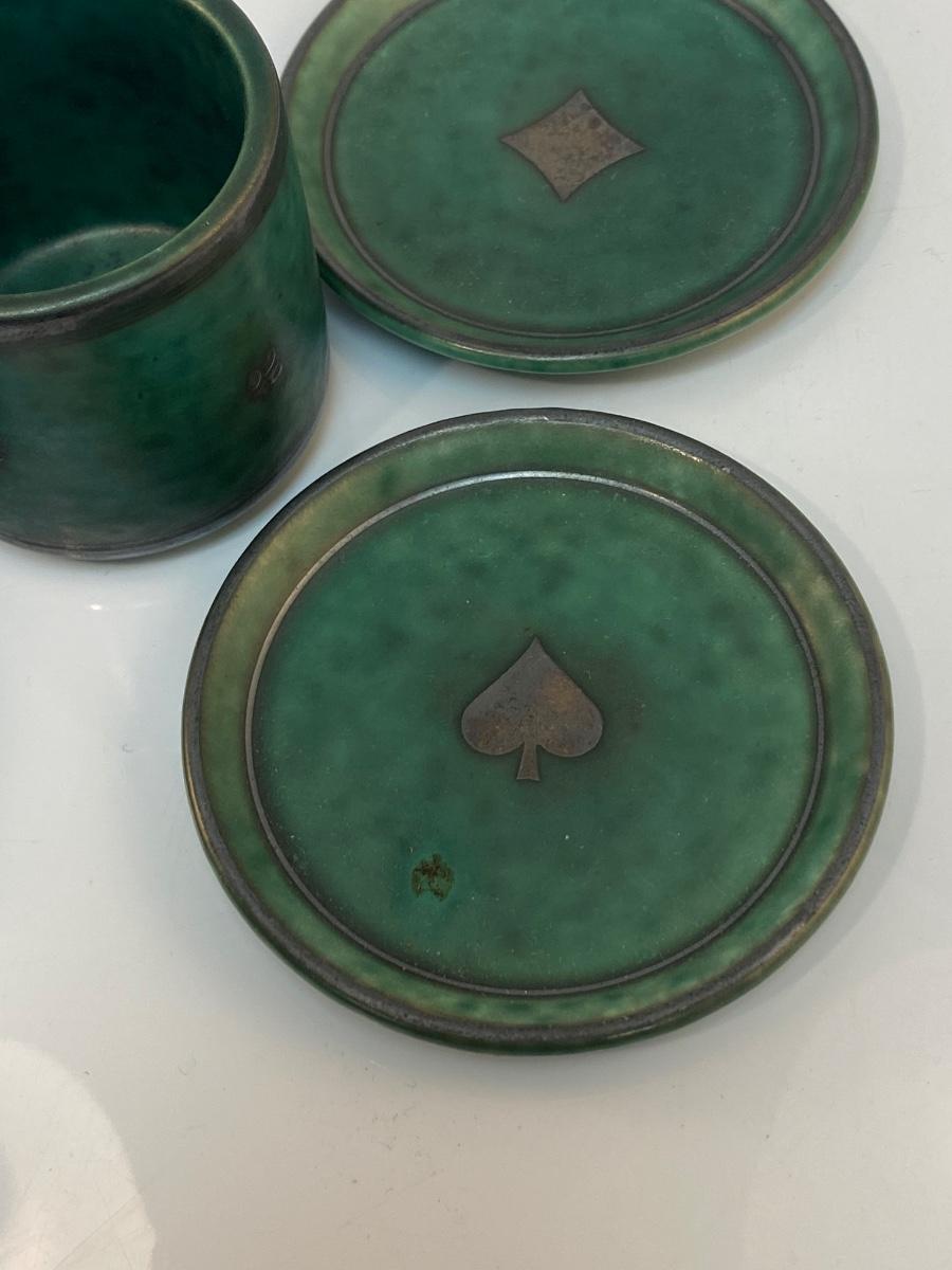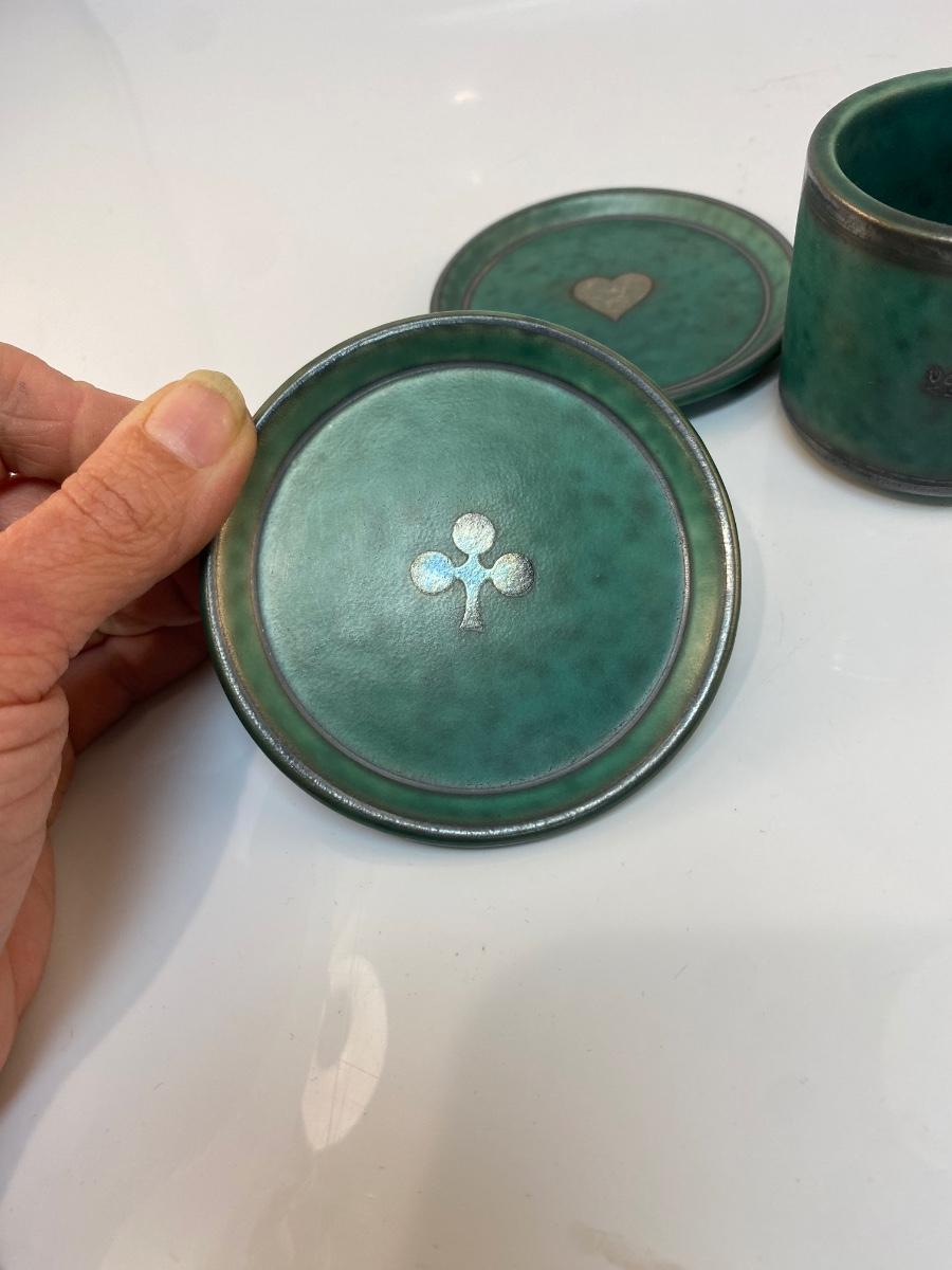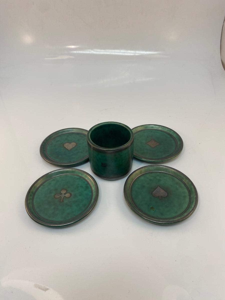 Vintage 1940s Wilhelm Kage Gustavsberg Argenta Sweden Silver Overlay Green Pottery Bridge Card Suit Coasters & Small Cup