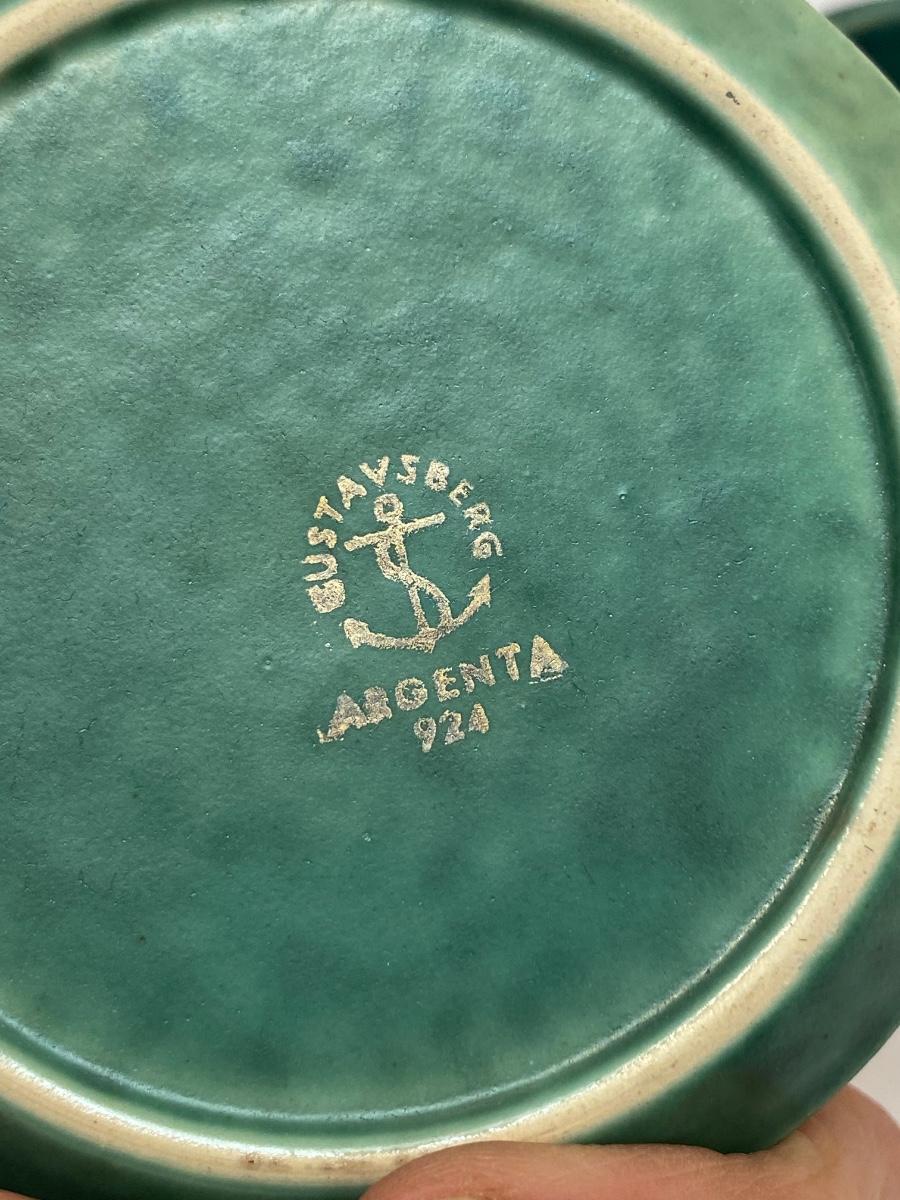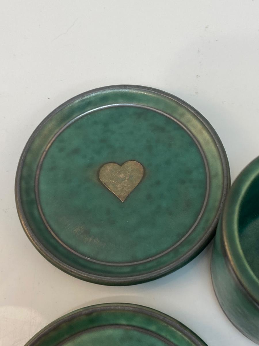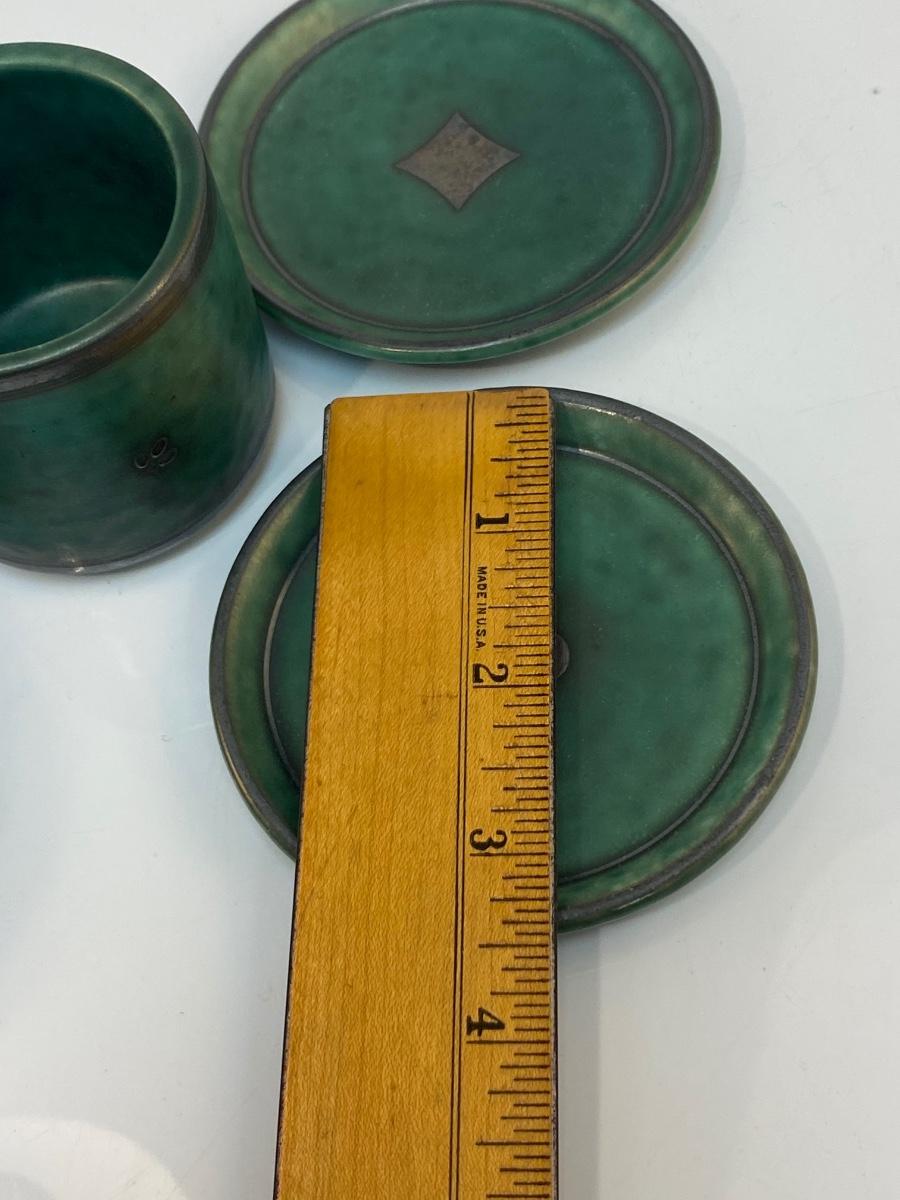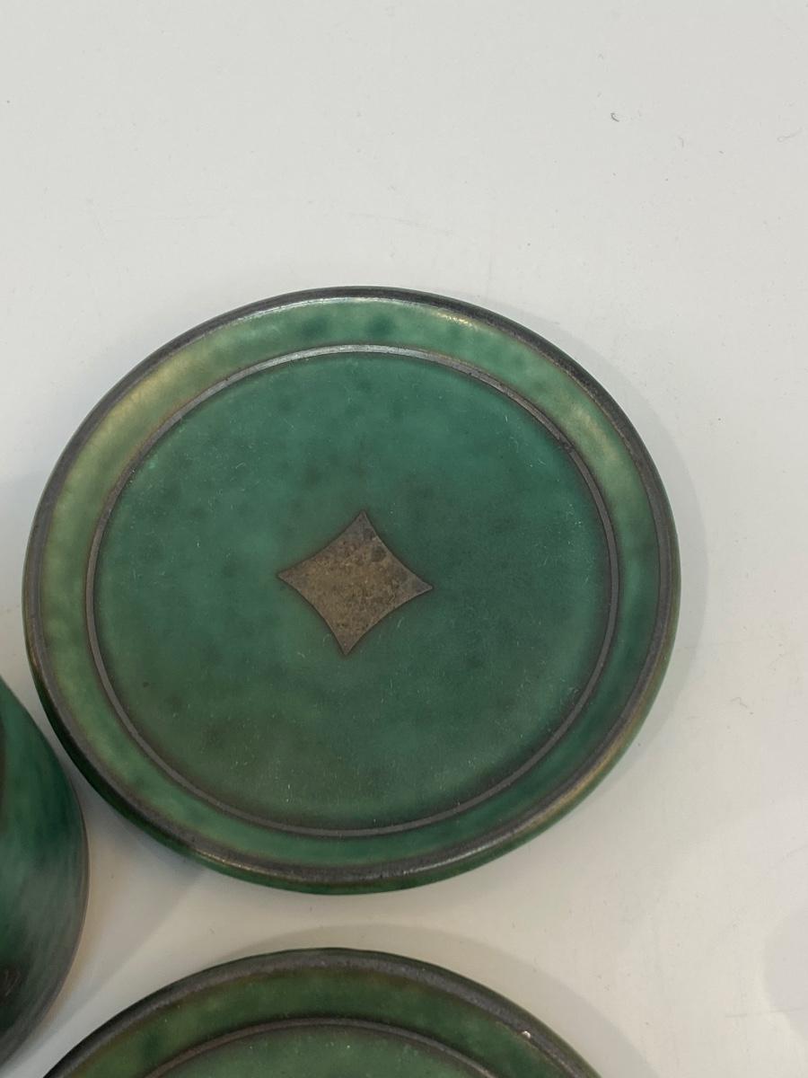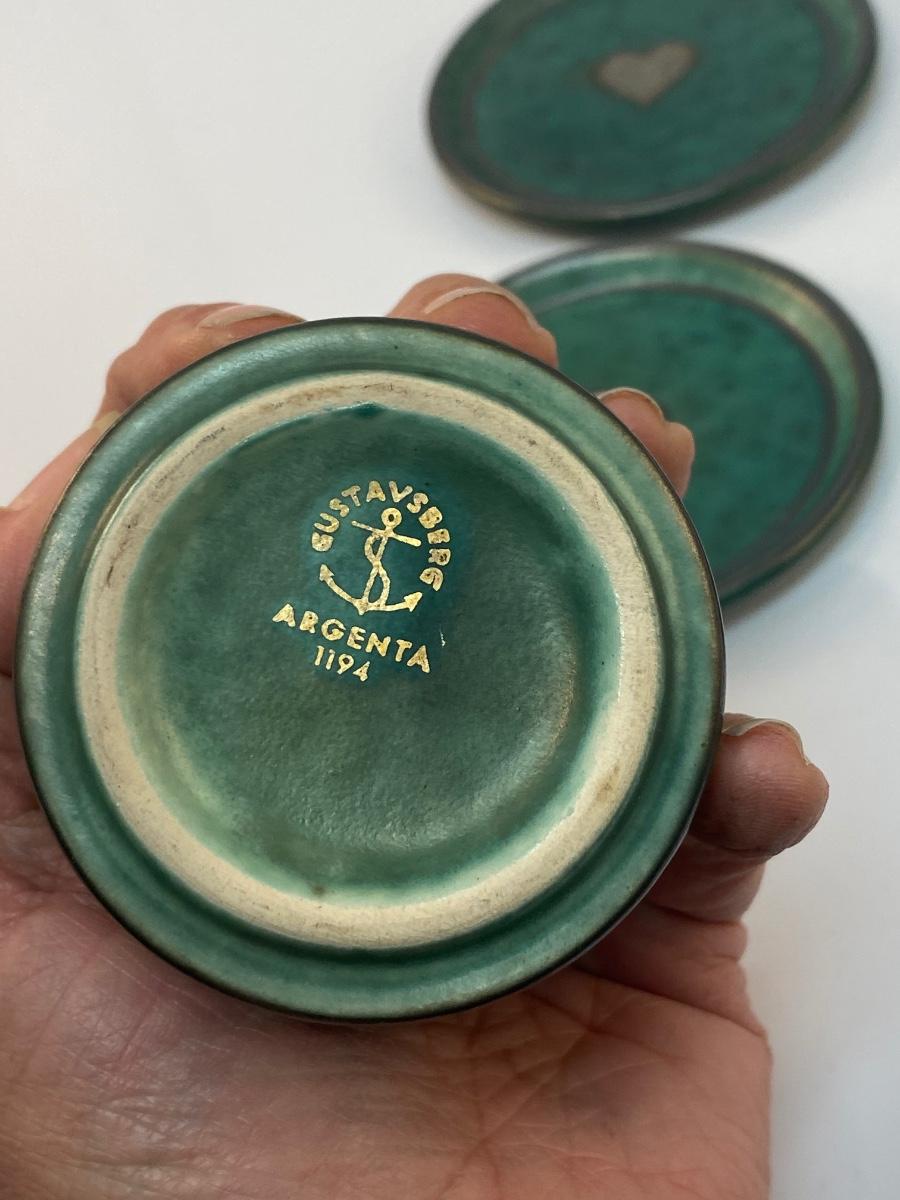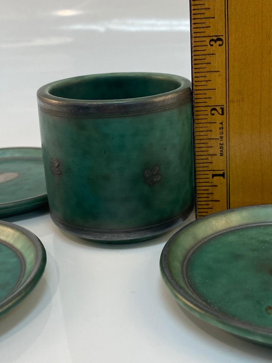 Vintage 1940s Wilhelm Kage Gustavsberg Argenta Sweden Silver Overlay Green Pottery Bridge Card Suit Coasters & Small Cup