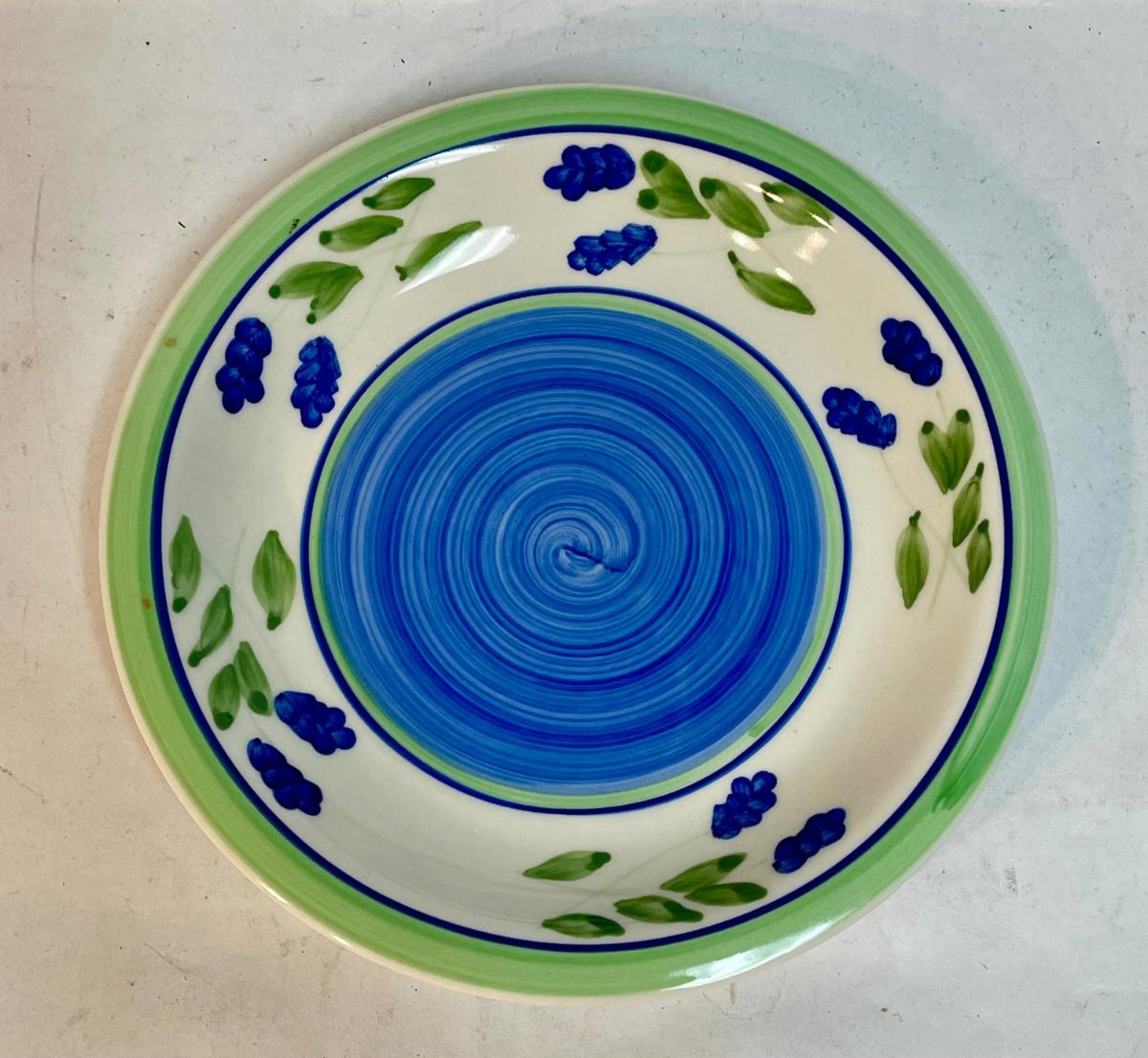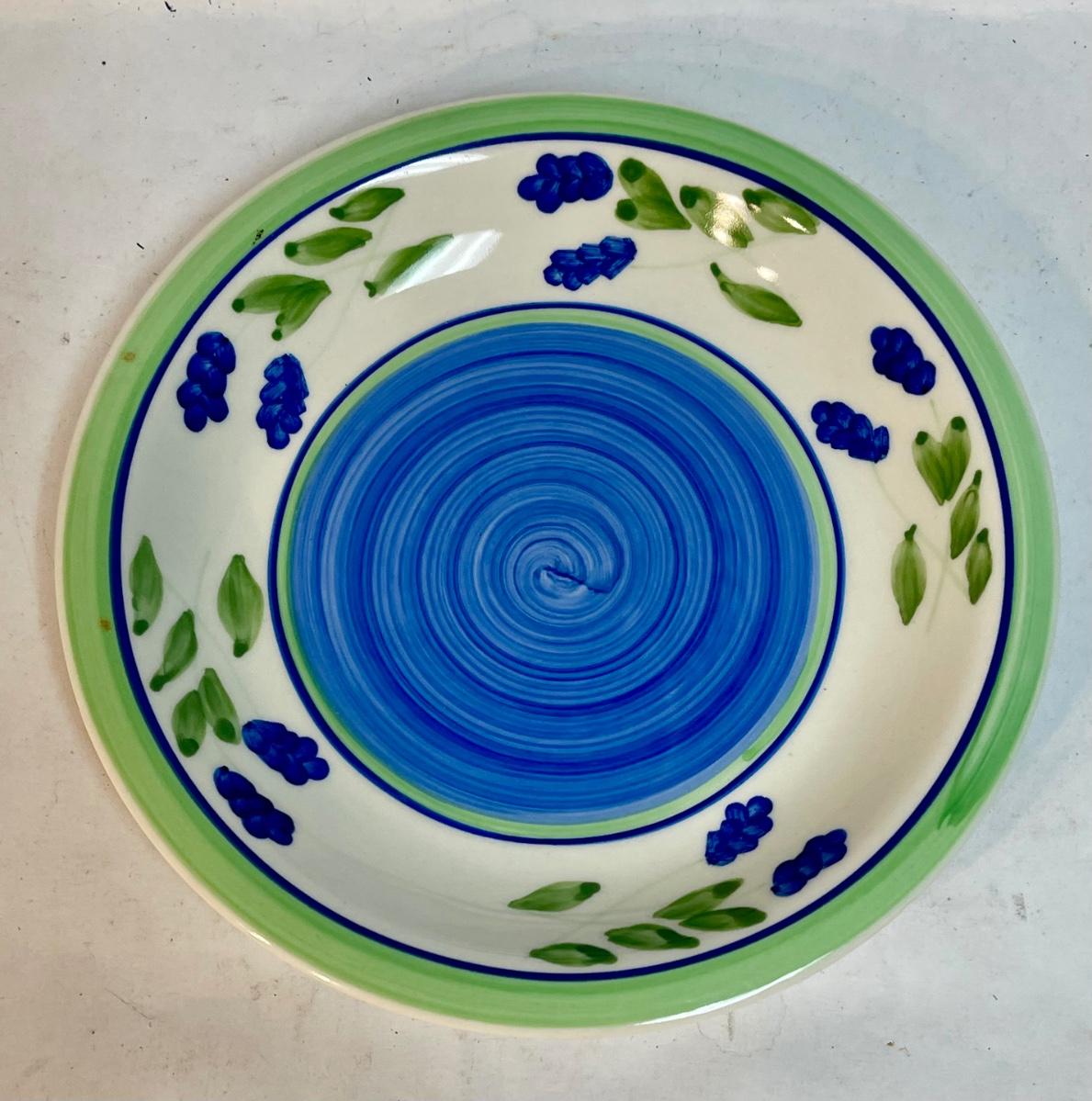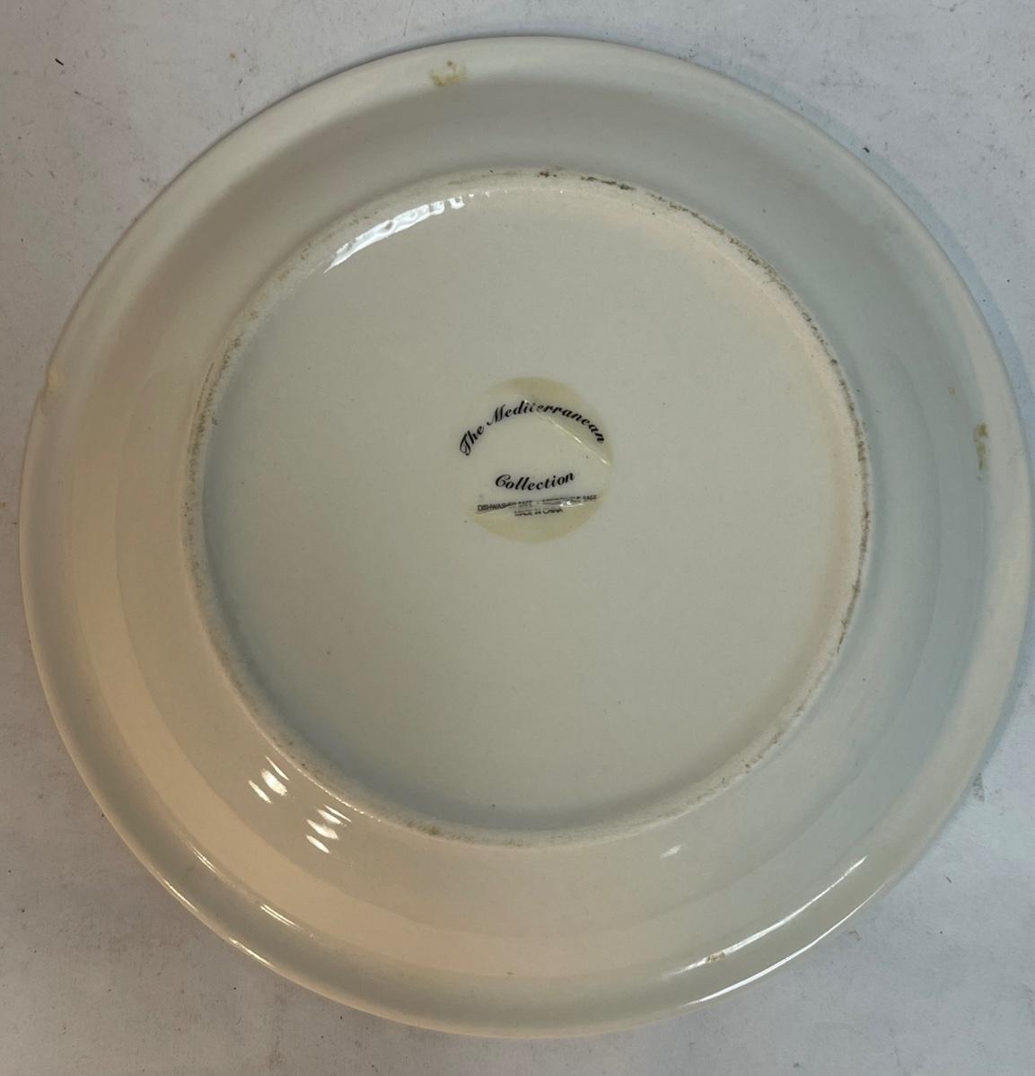 Ceramic plate from the Mediterranean Collection. Is dishwasher and microwave safe, but can also be used for display or as home decor. Approx. 7 1/2" across.