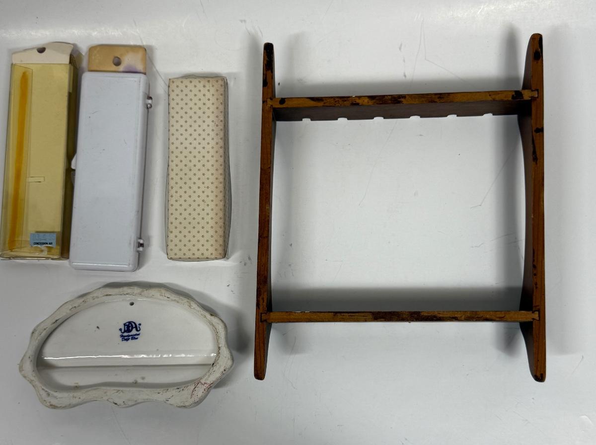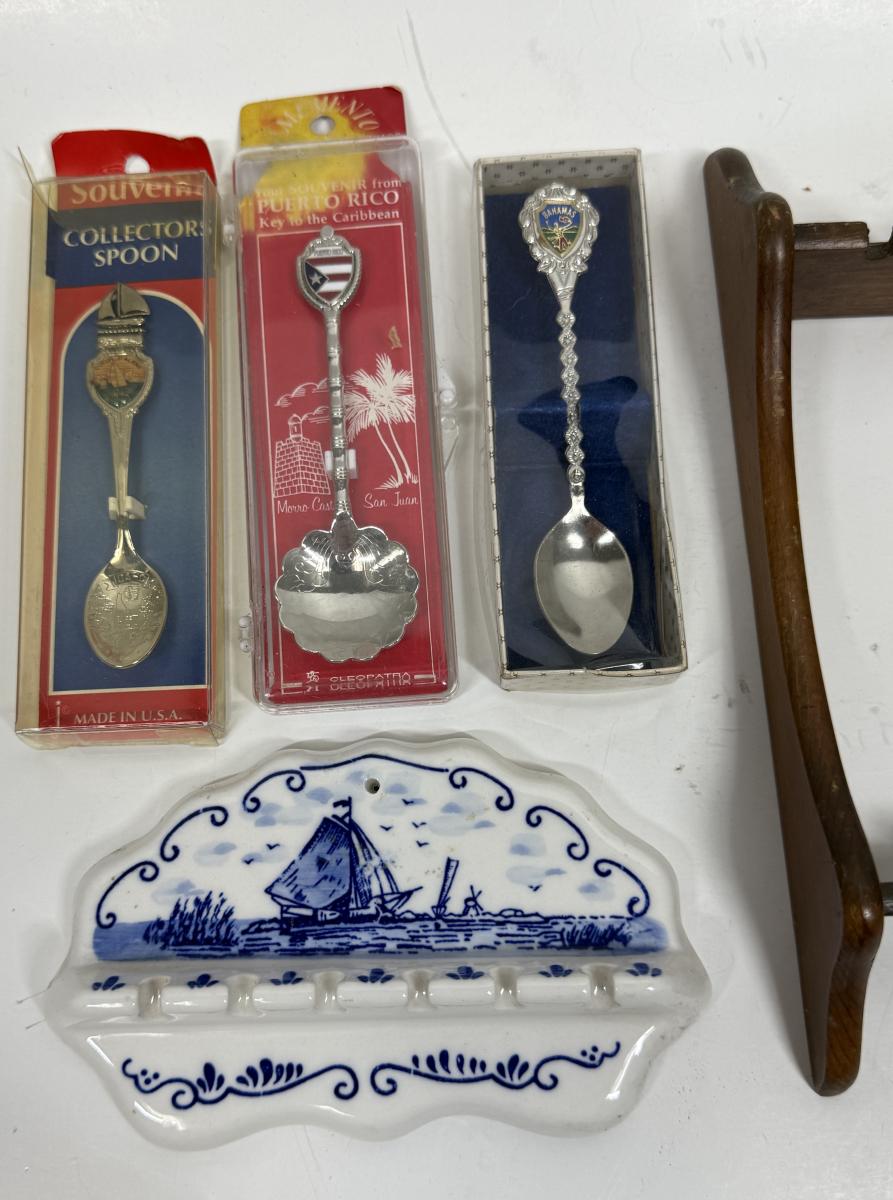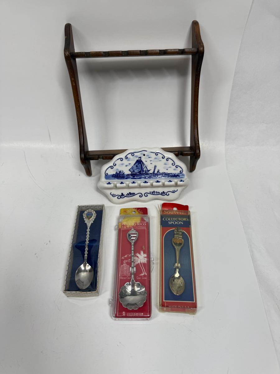 3 miniature spoon lot with 2 display pieces wood and Delft