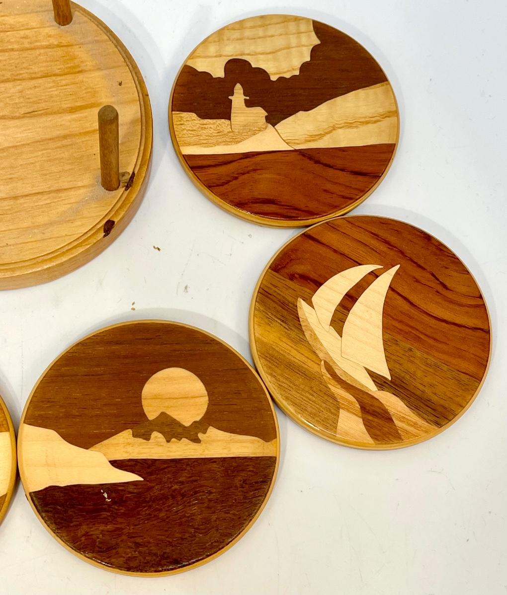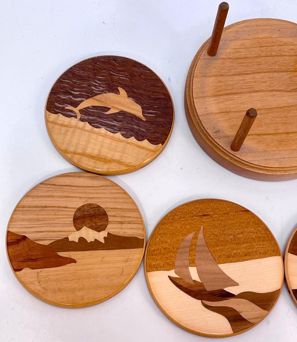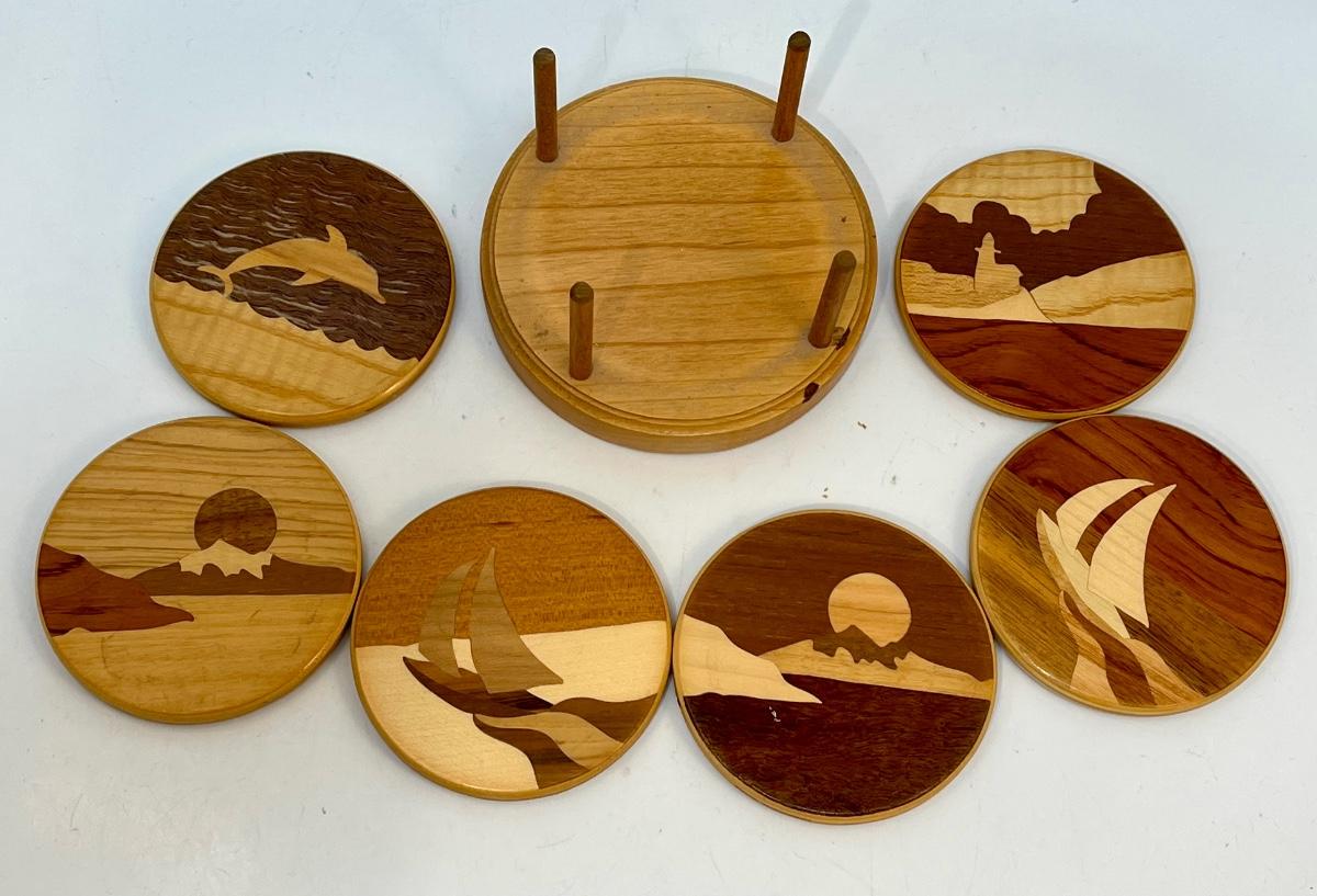 Vintage Retro Wood Art Nautical Theme Coaster Set with Holder. Each coaster is different. Great use of various woods. Stamped on the bottom of holder.