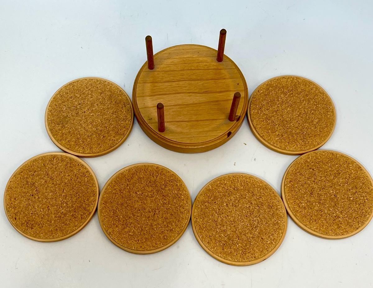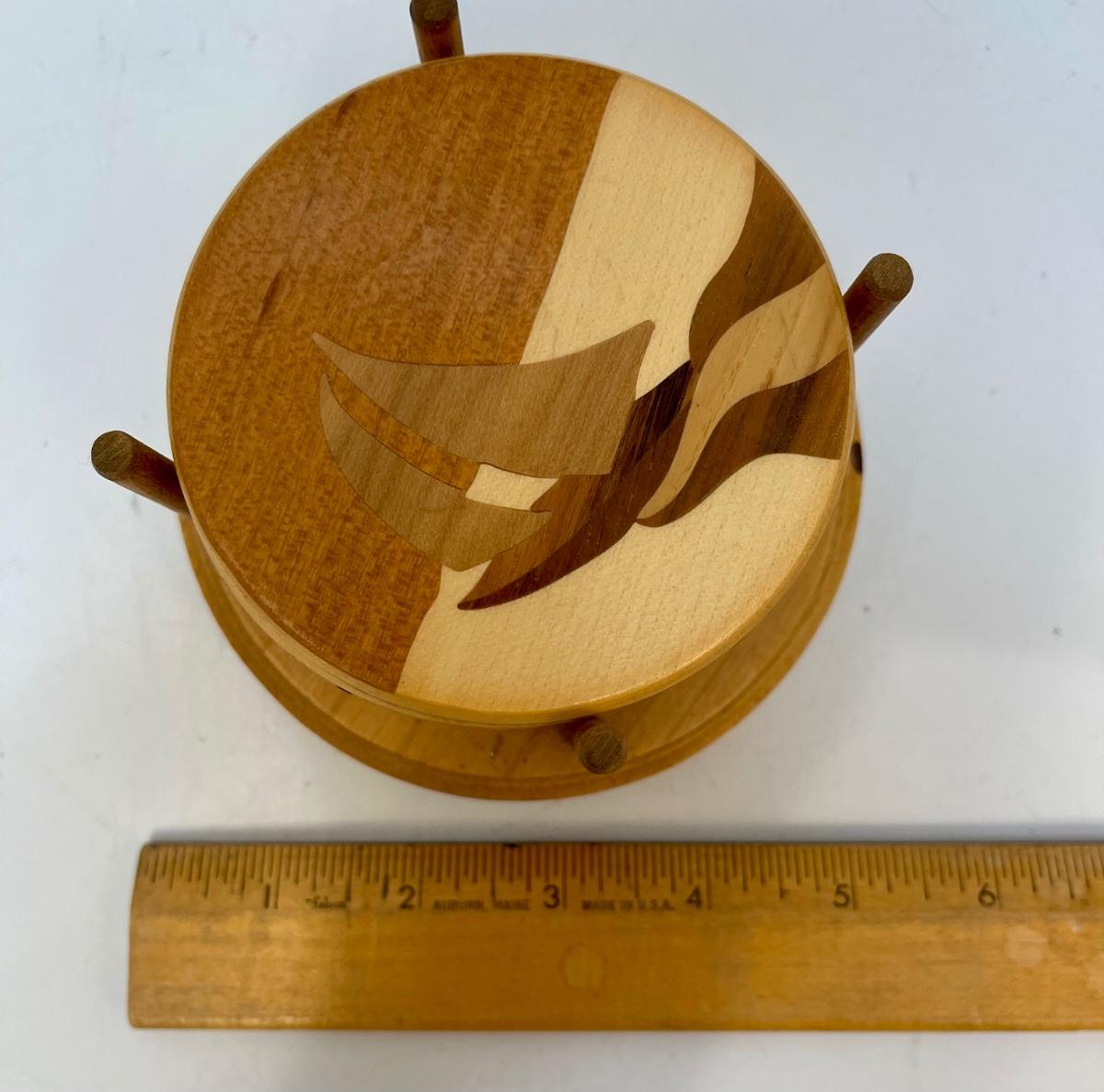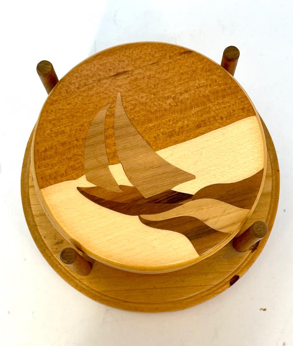 Vintage Retro Wood Art Nautical Theme Coaster Set with Holder. Each coaster is different. Great use of various woods. Stamped on the bottom of holder.