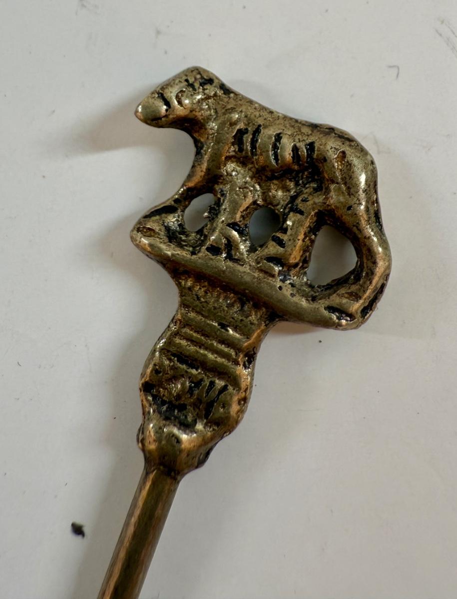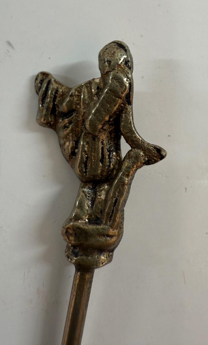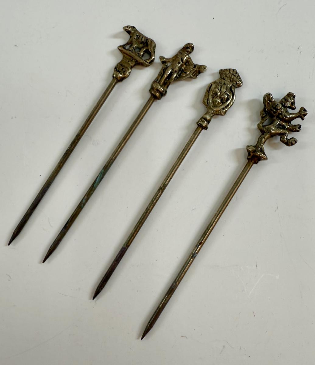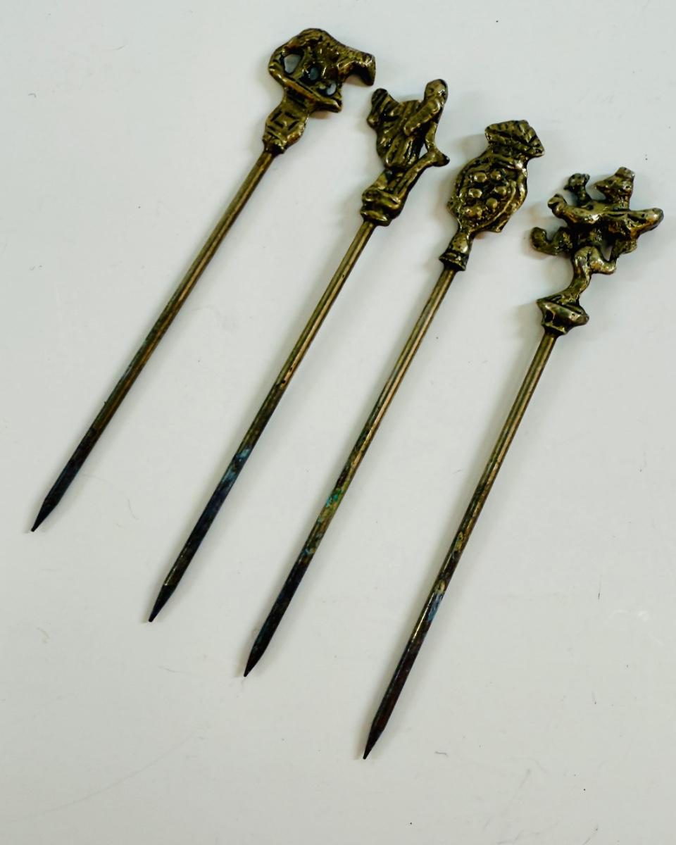Shish kabob skewers with brass handles featuring animal or figure ornaments, approx. 4" long.