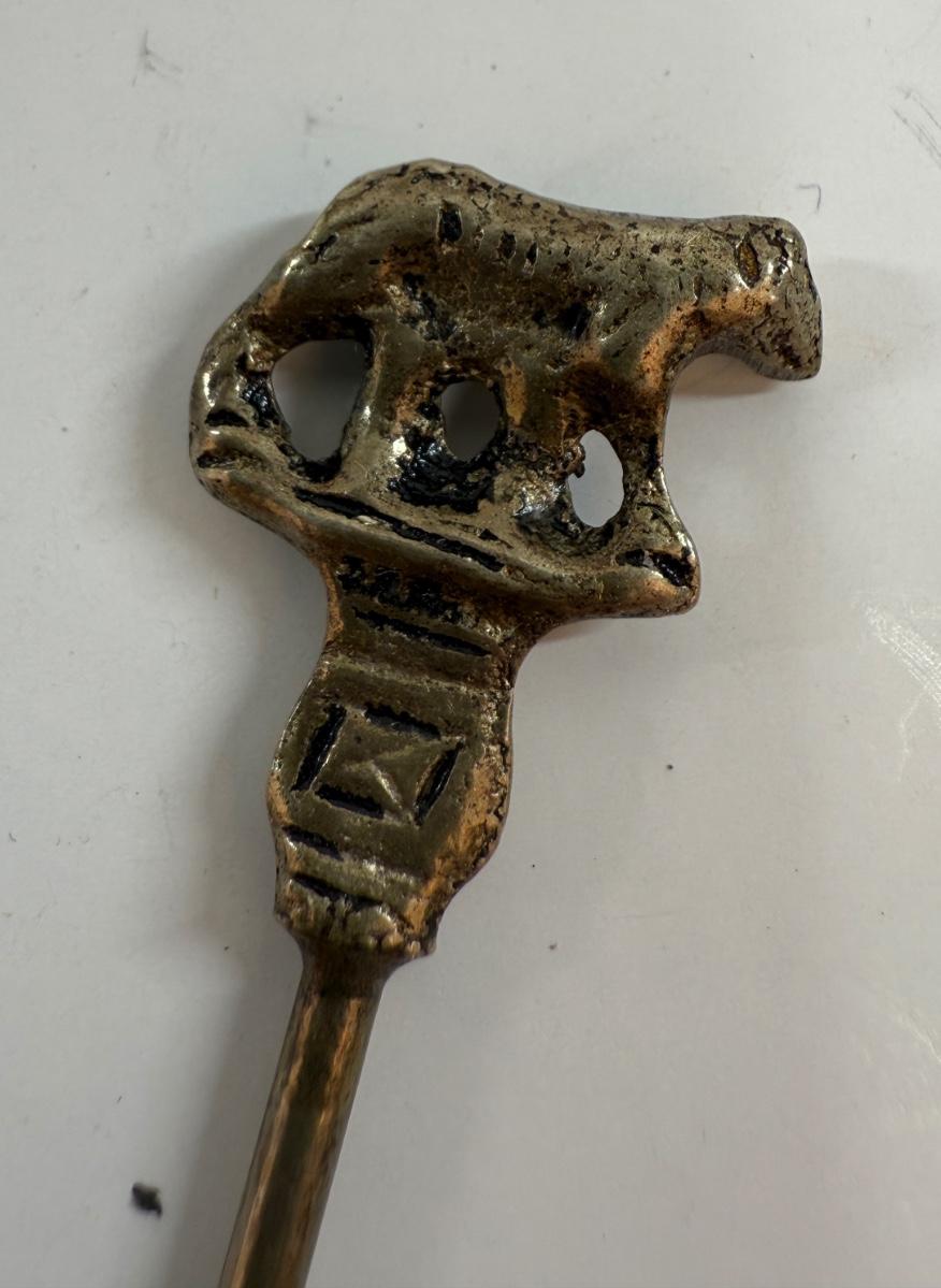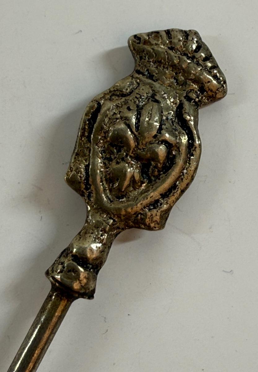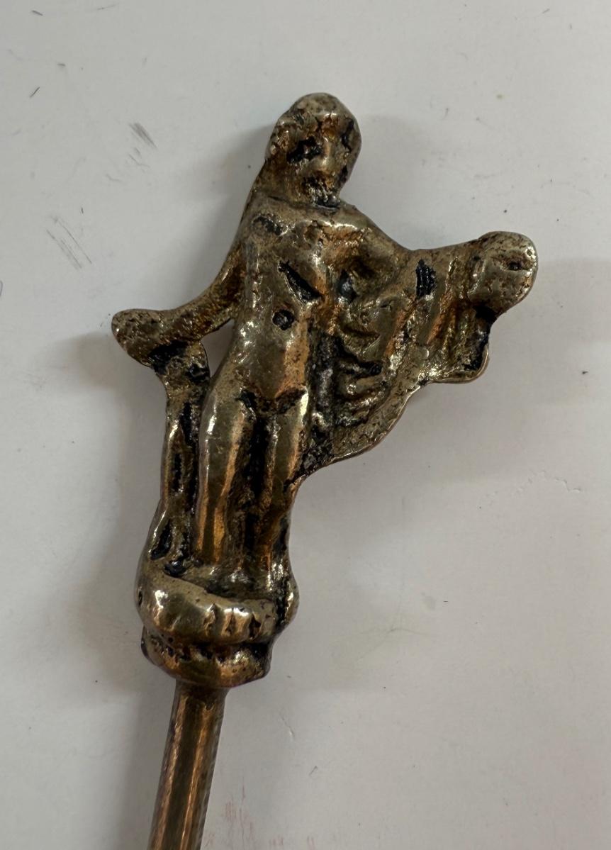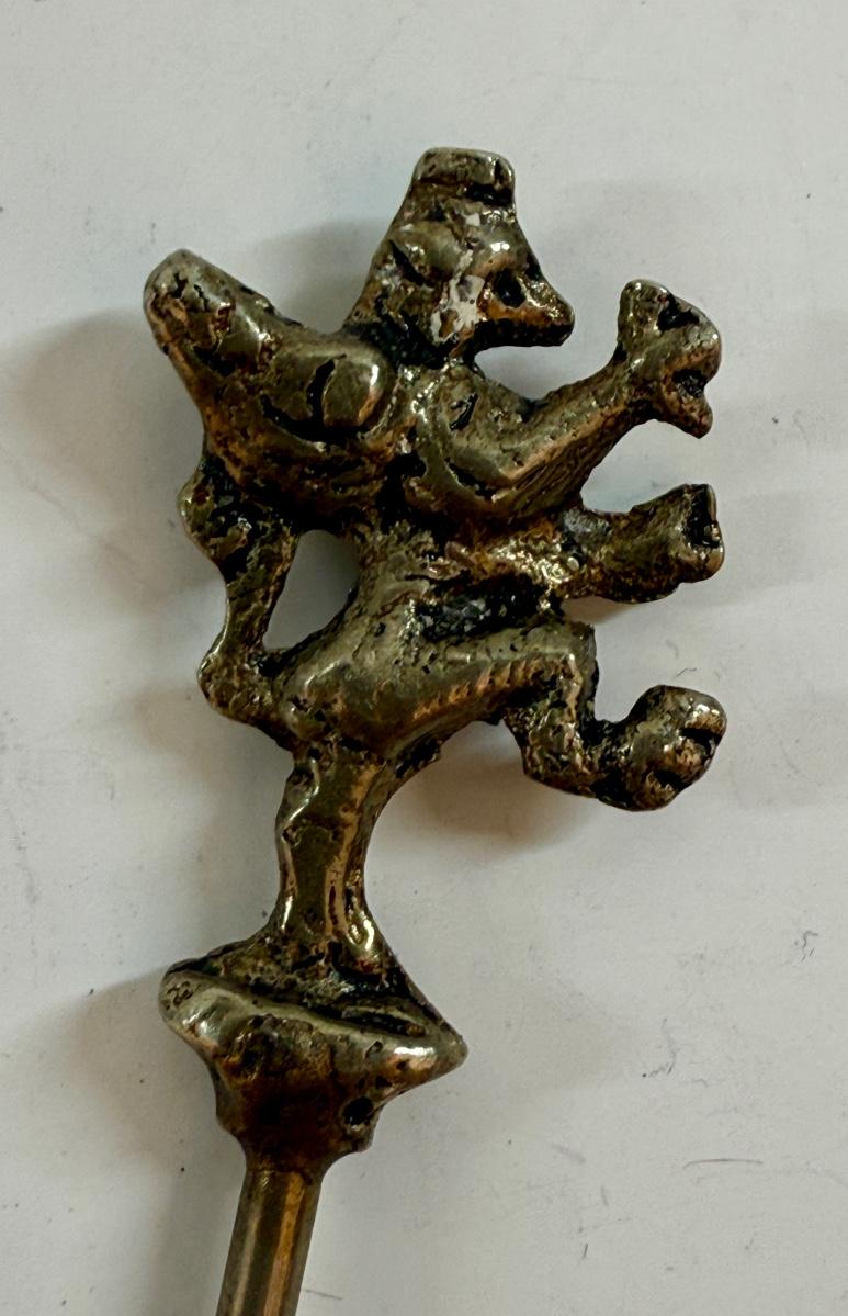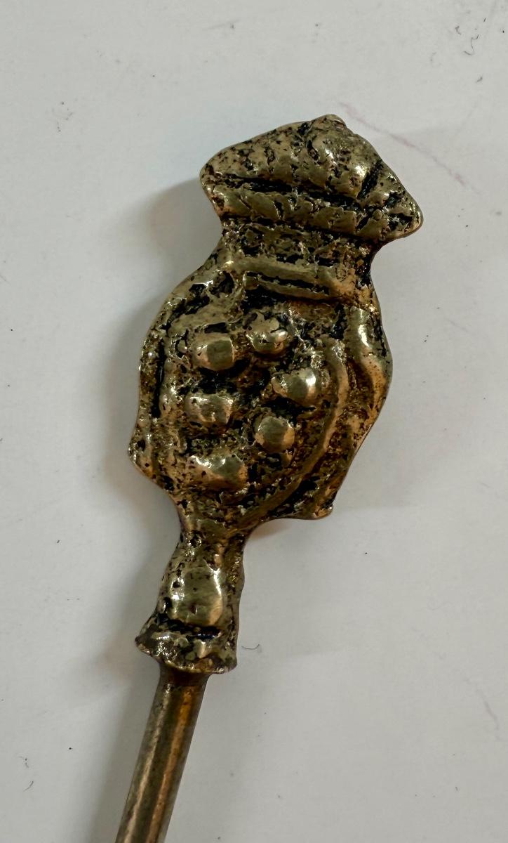 Shish kabob skewers with brass handles featuring animal or figure ornaments, approx. 4" long.