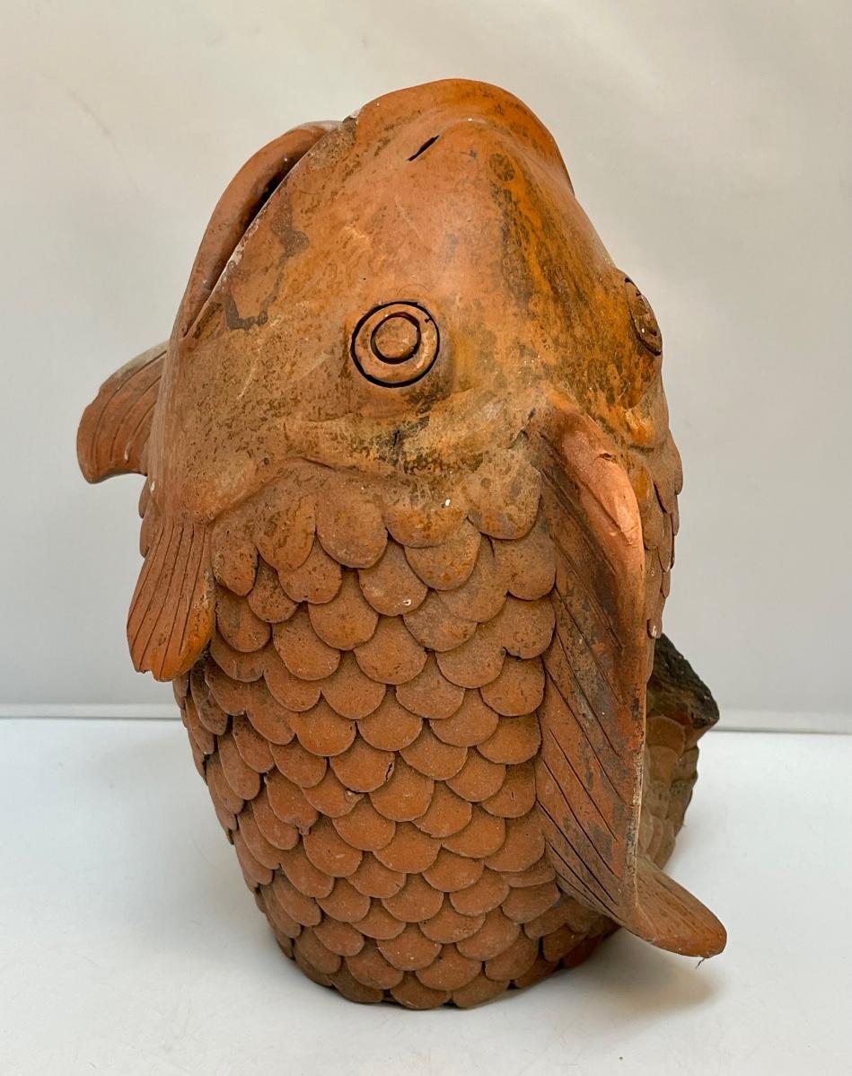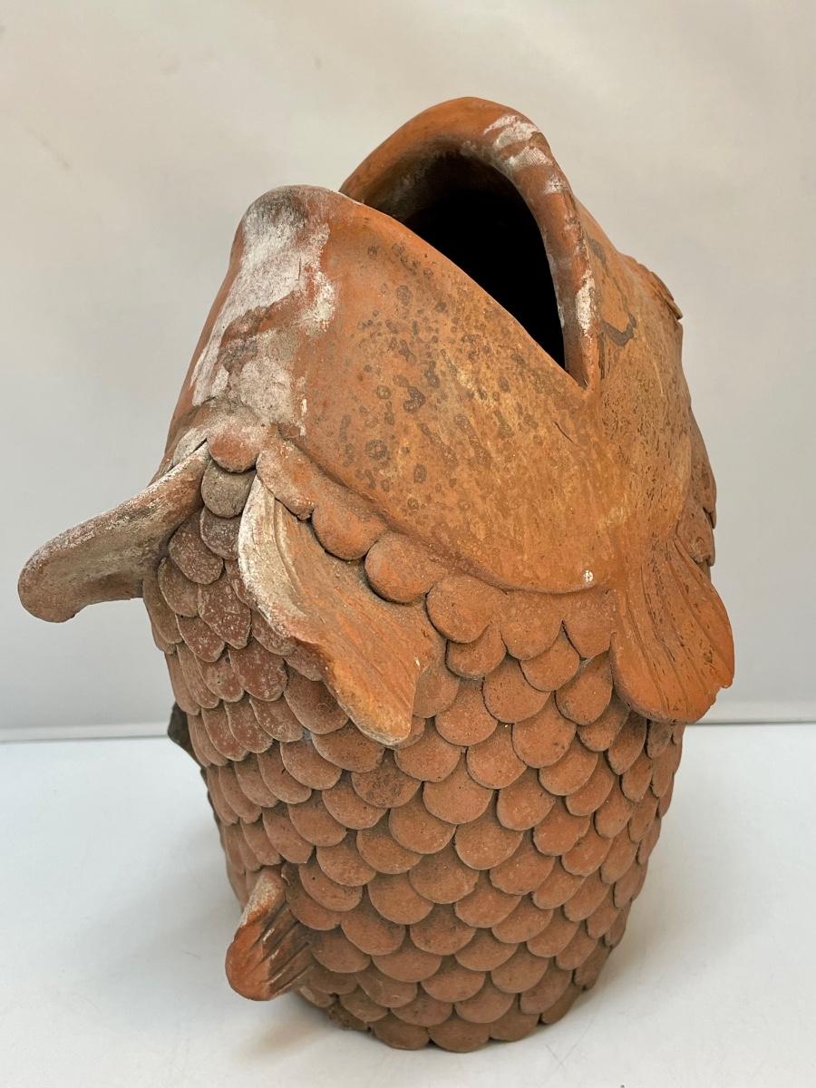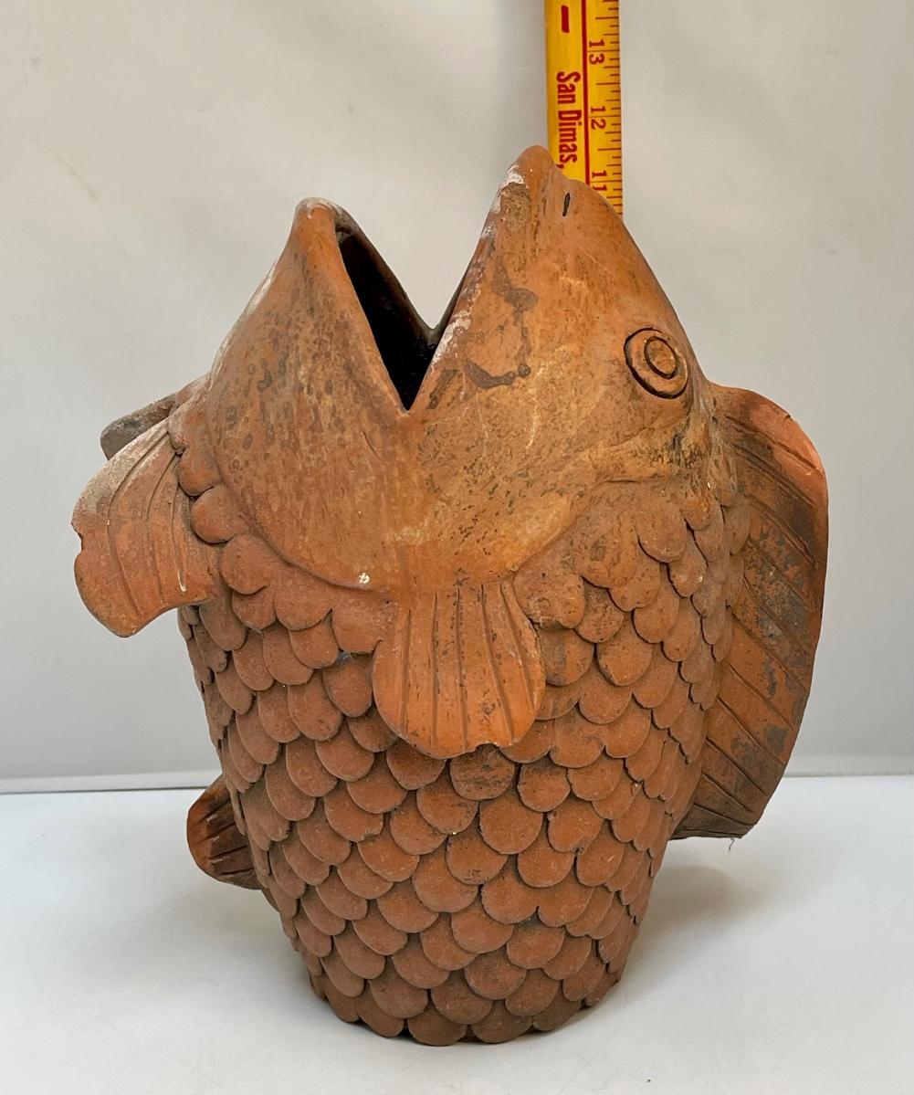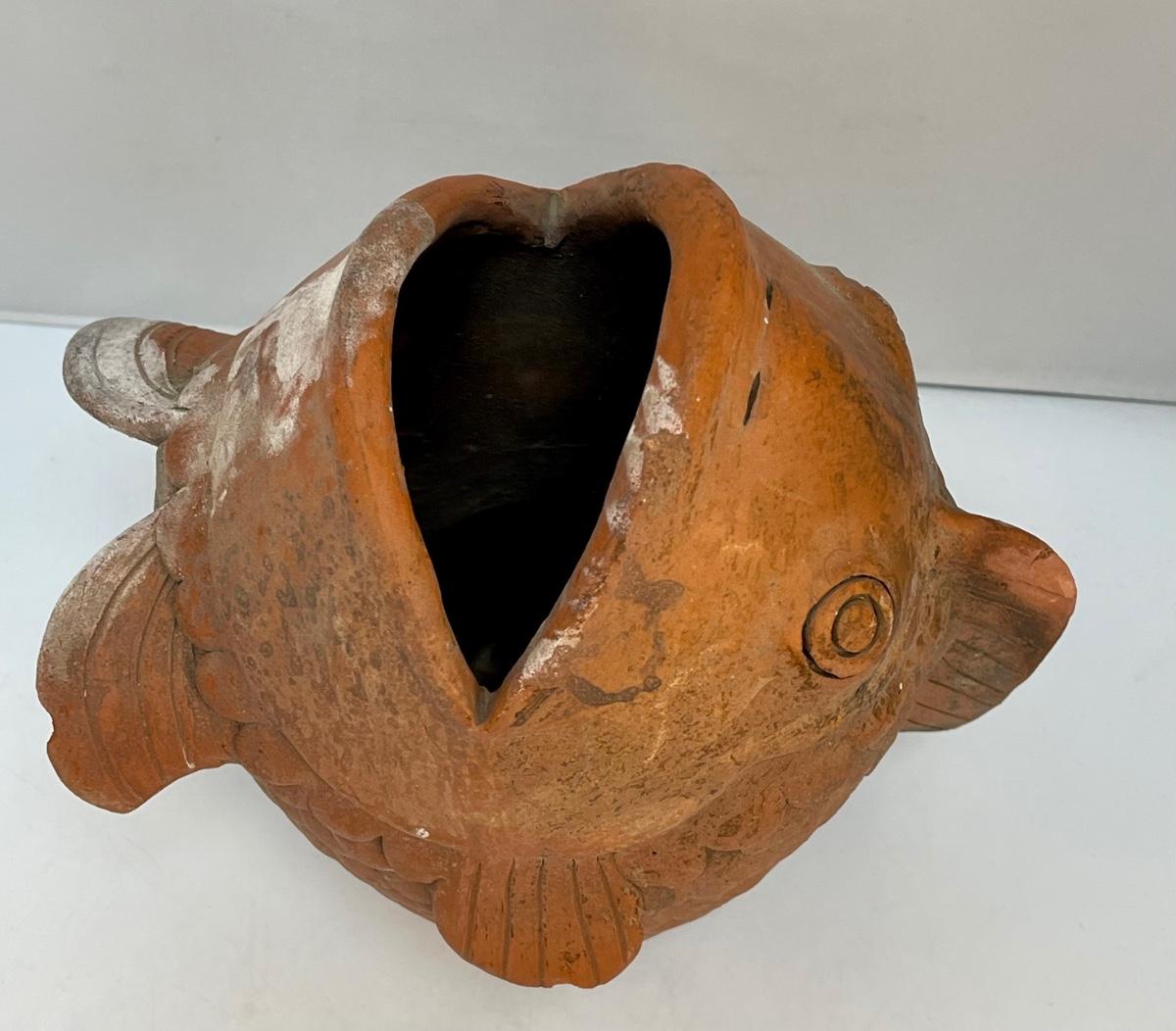 Terra Cotta Pottery Fish Garden Statue Planter Pot Open Mouth. Great details. In good, weathered condition. About 12" size.