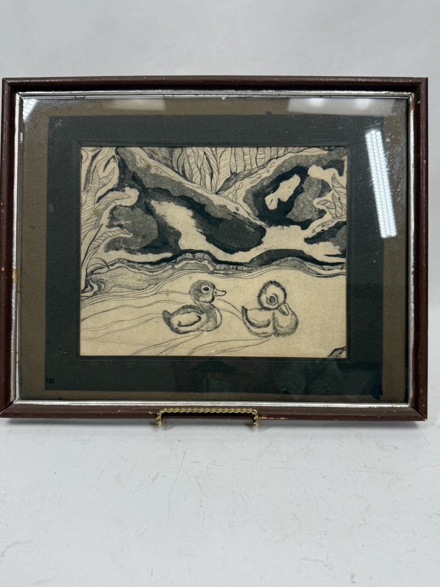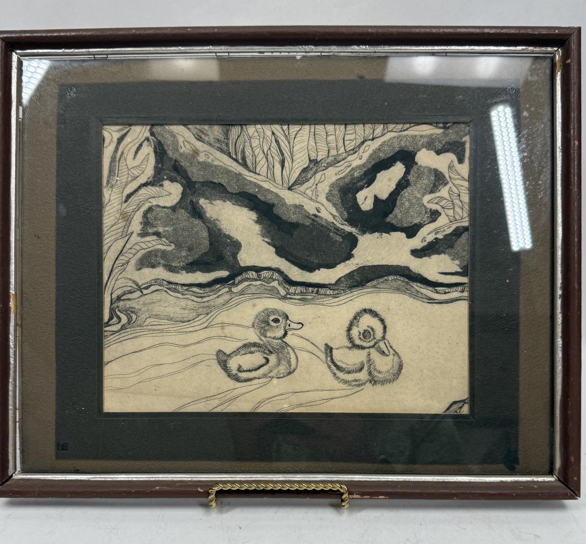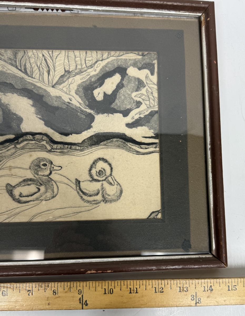 Framed Etching of Two Baby Duckings Swimming, unsigned