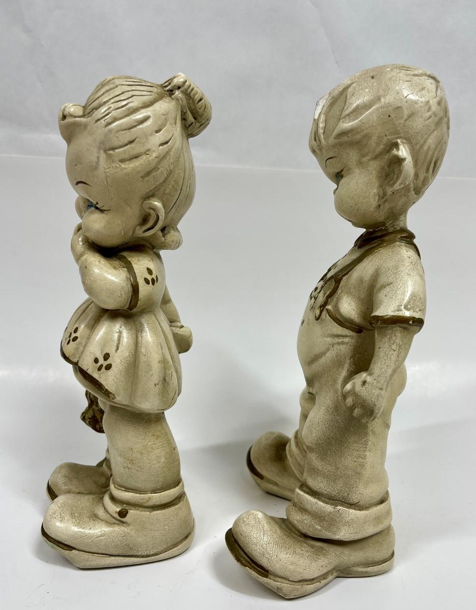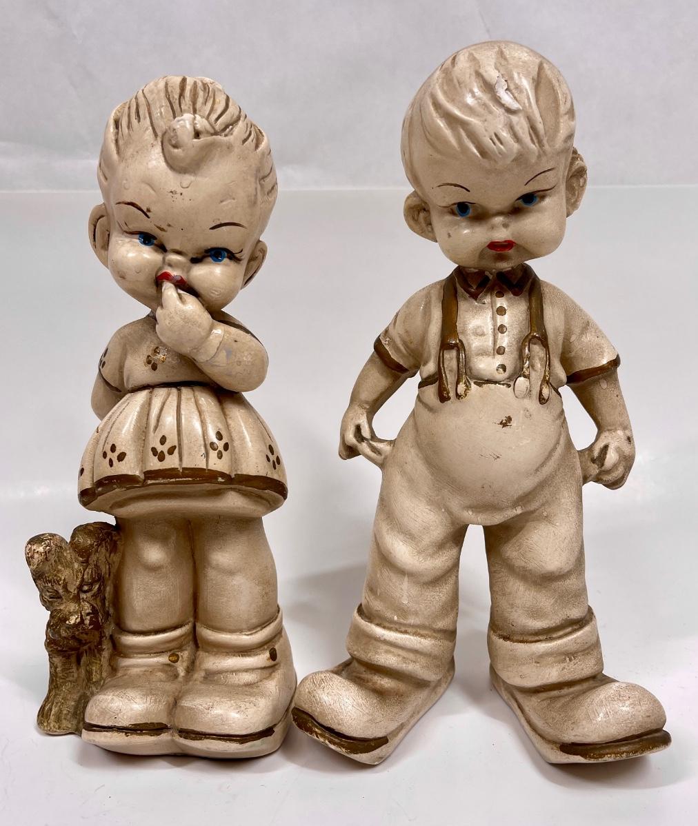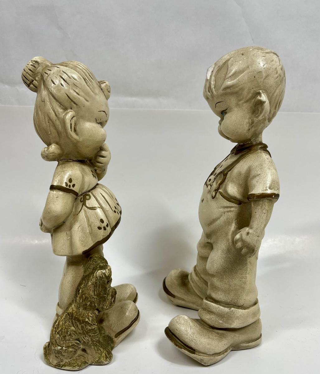 This vintage figurine set features a little boy and girl with two empty pockets and a dog, all made of ceramic with a beautiful gold finish. The set is perfect for collectors of vintage children's items and is sure to add a touch of nostalgia to any decor. The figurines are approx. 8.5" tall, making them the perfect size for display on a shelf or desk. The set is from the 1950s and has a classic style that is sure to appeal to collectors of all ages. The beige color and antique finish give the set a unique and timeless look.