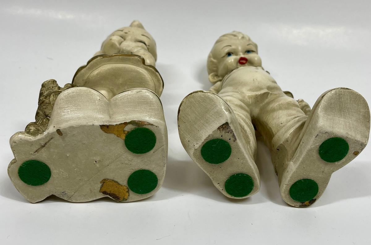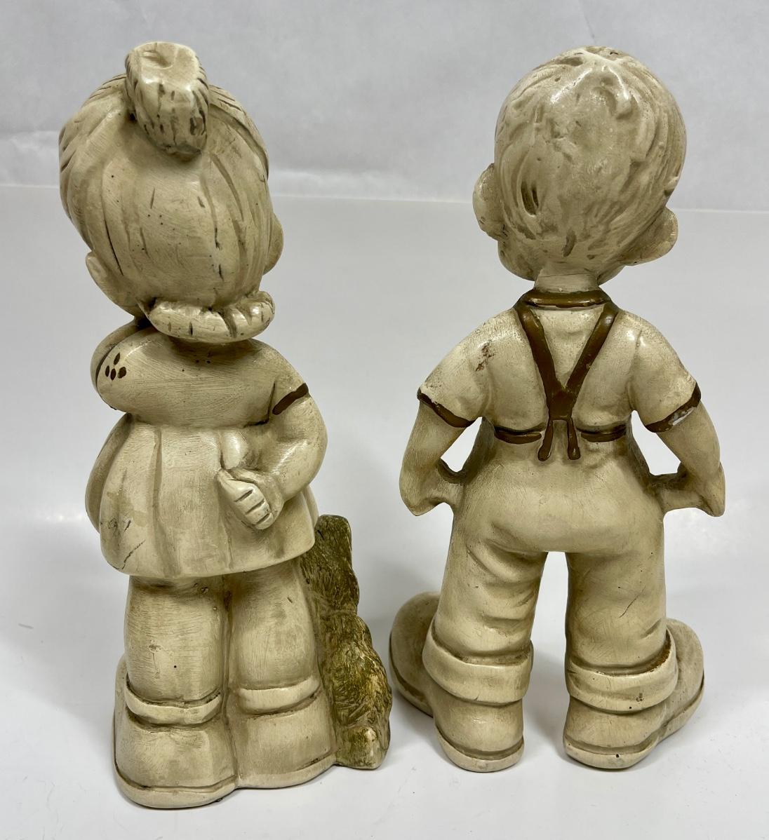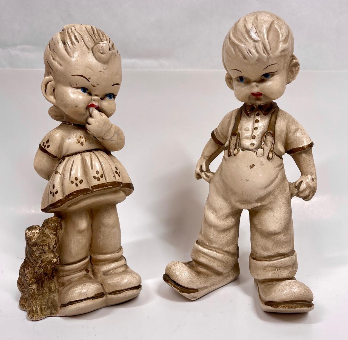 This vintage figurine set features a little boy and girl with two empty pockets and a dog, all made of ceramic with a beautiful gold finish. The set is perfect for collectors of vintage children's items and is sure to add a touch of nostalgia to any decor. The figurines are approx. 8.5" tall, making them the perfect size for display on a shelf or desk. The set is from the 1950s and has a classic style that is sure to appeal to collectors of all ages. The beige color and antique finish give the set a unique and timeless look.