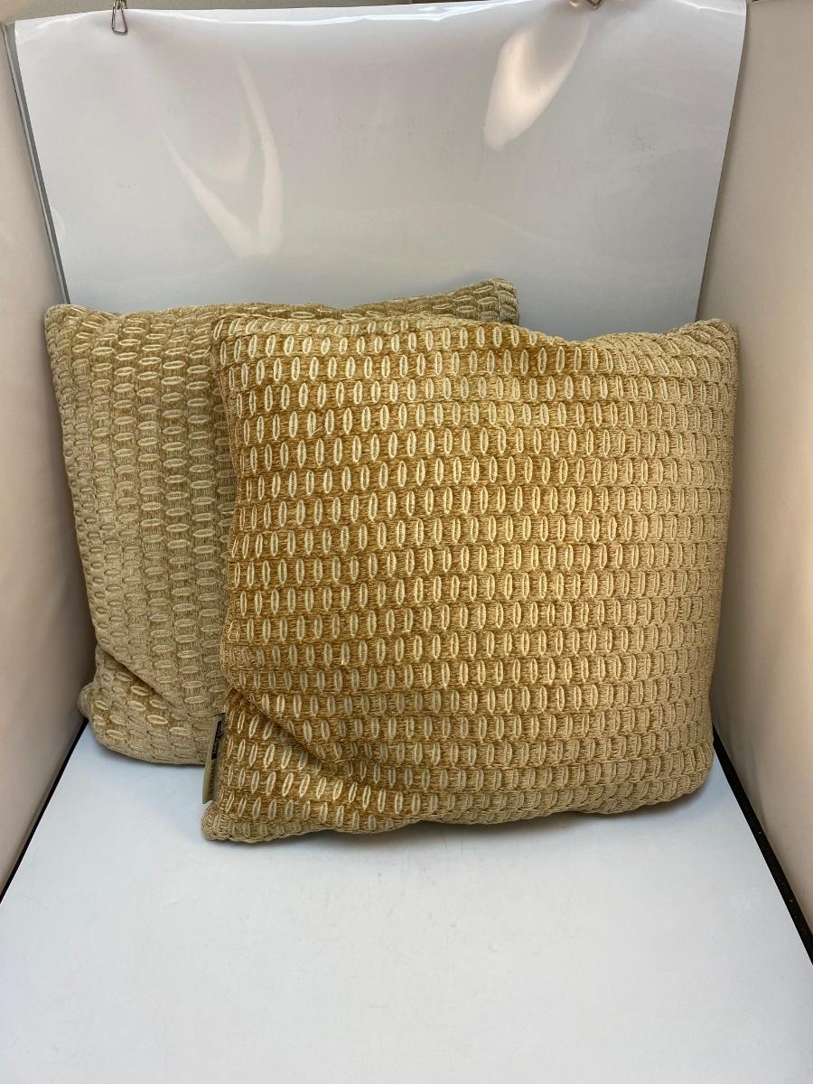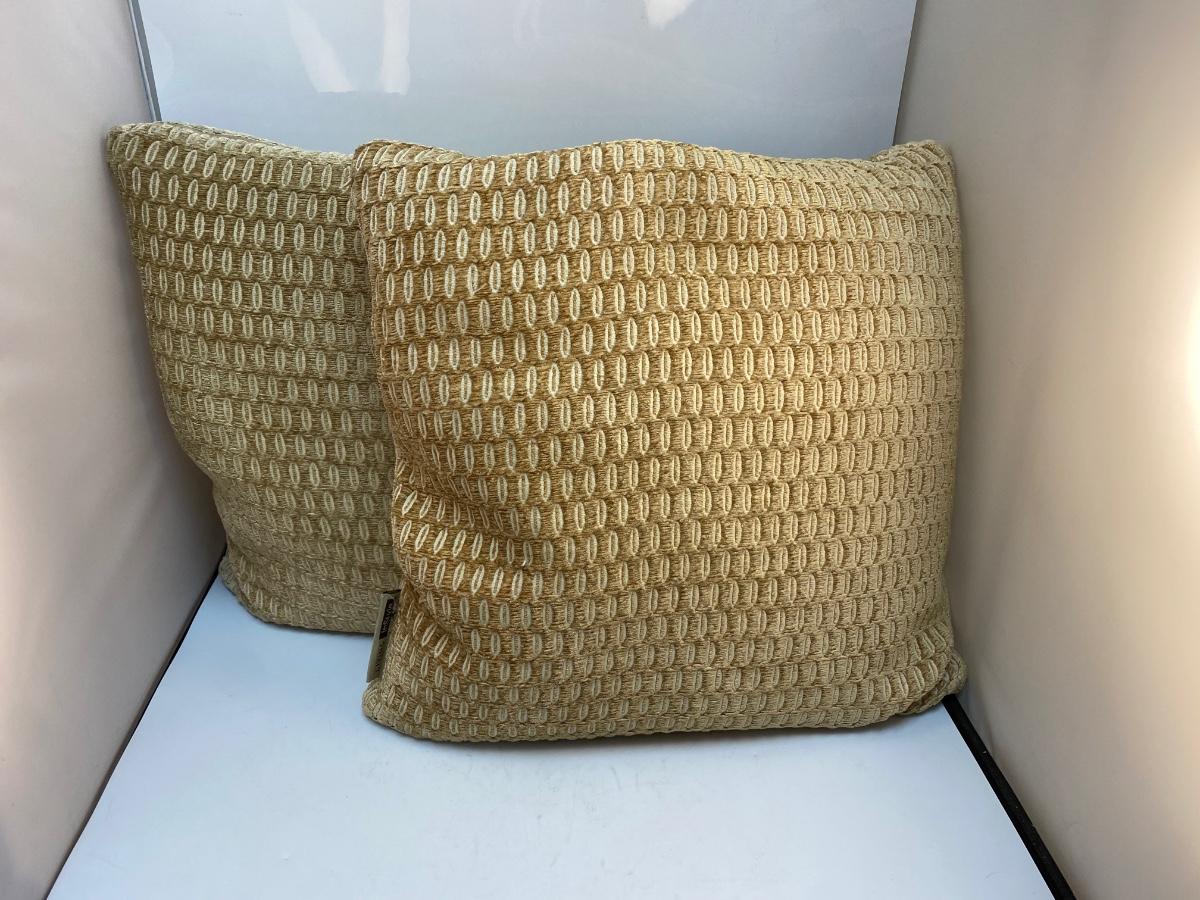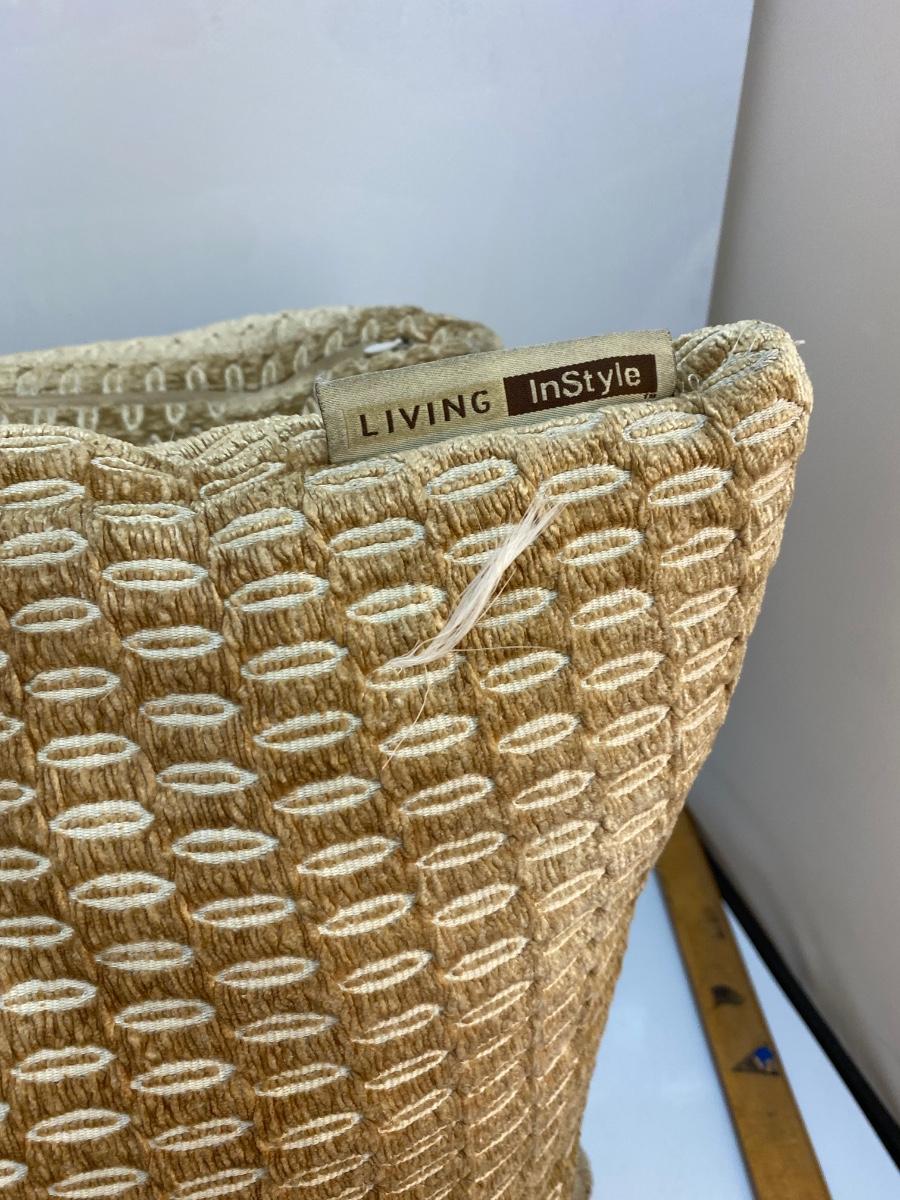Pair of Midcentury Vintage Geometric Gold Beige Throw Accent Pillows. Color seems to change depending on the angle looked at. In good condition, no spots or stains. Large, about 17" size. Tag has maker as "Living InStyle".
