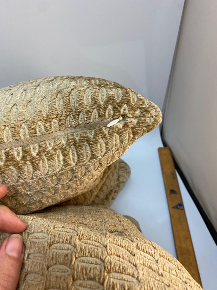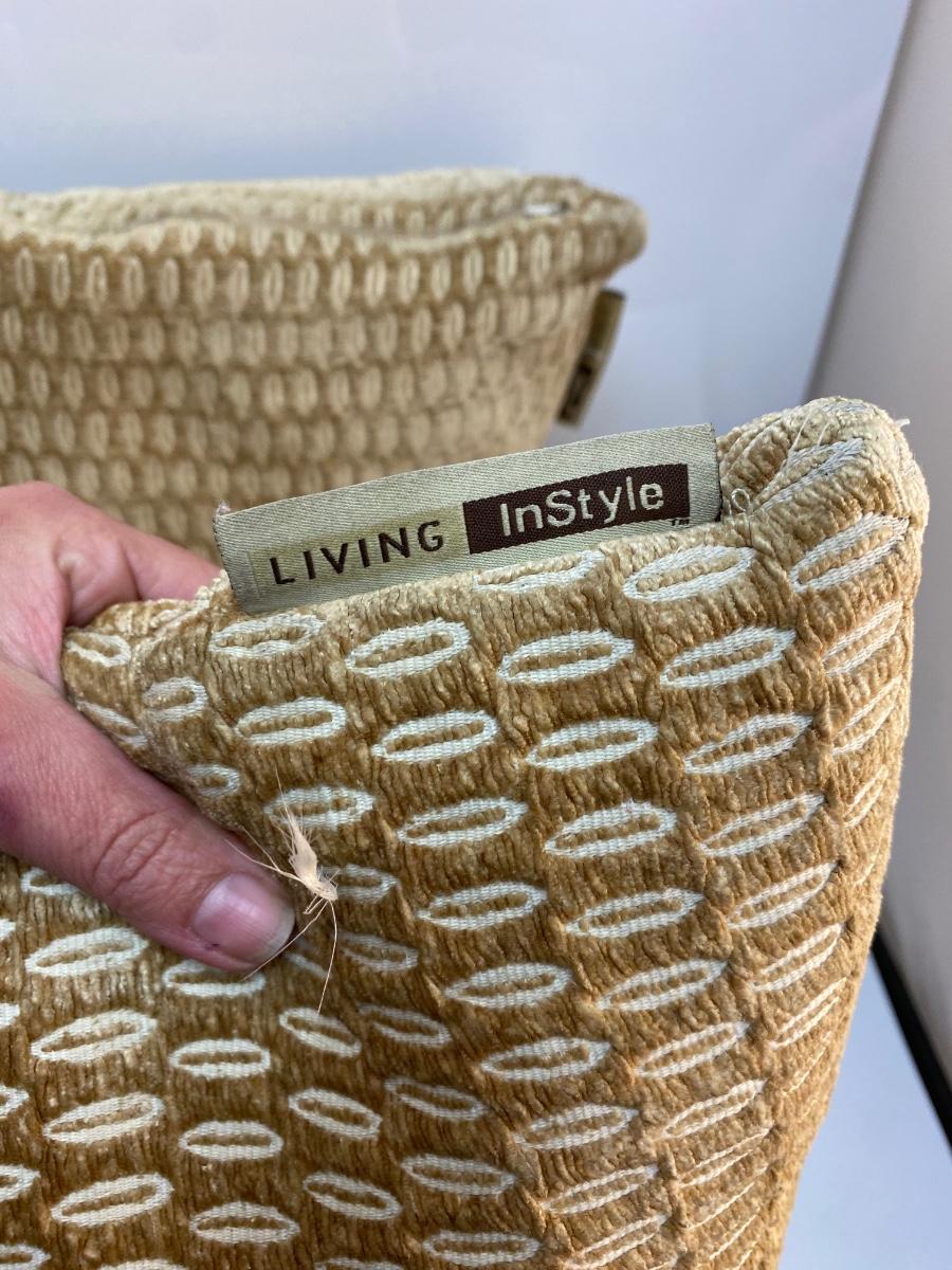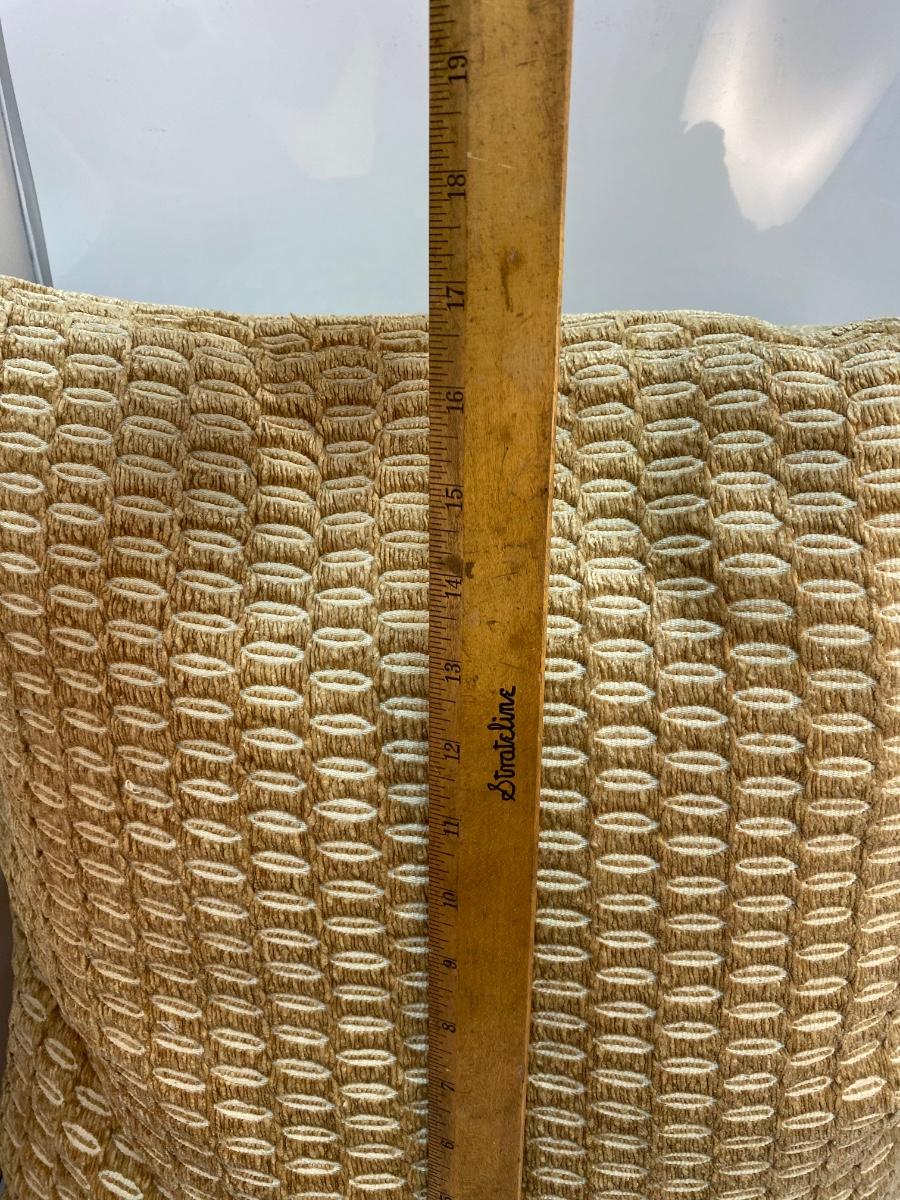 Pair of Midcentury Vintage Geometric Gold Beige Throw Accent Pillows. Color seems to change depending on the angle looked at. In good condition, no spots or stains. Large, about 17" size. Tag has maker as "Living InStyle".