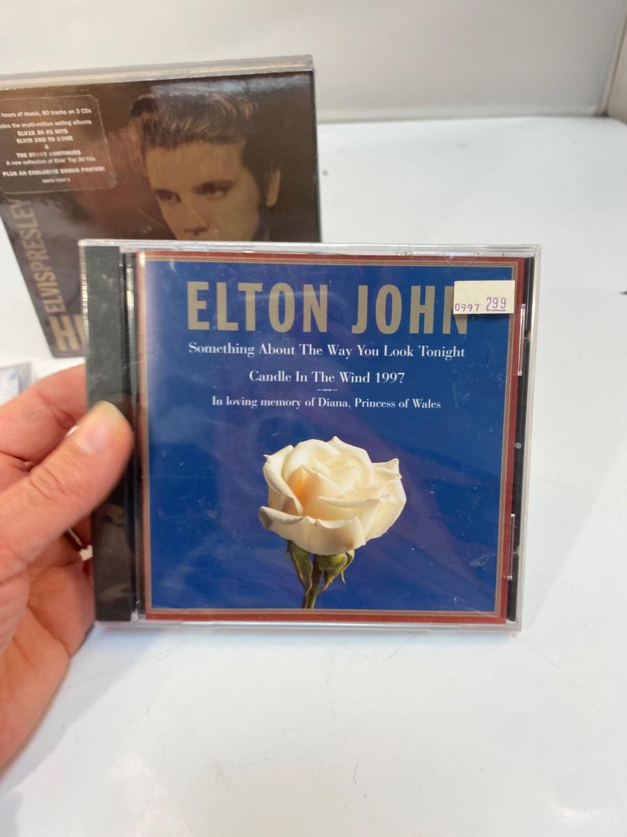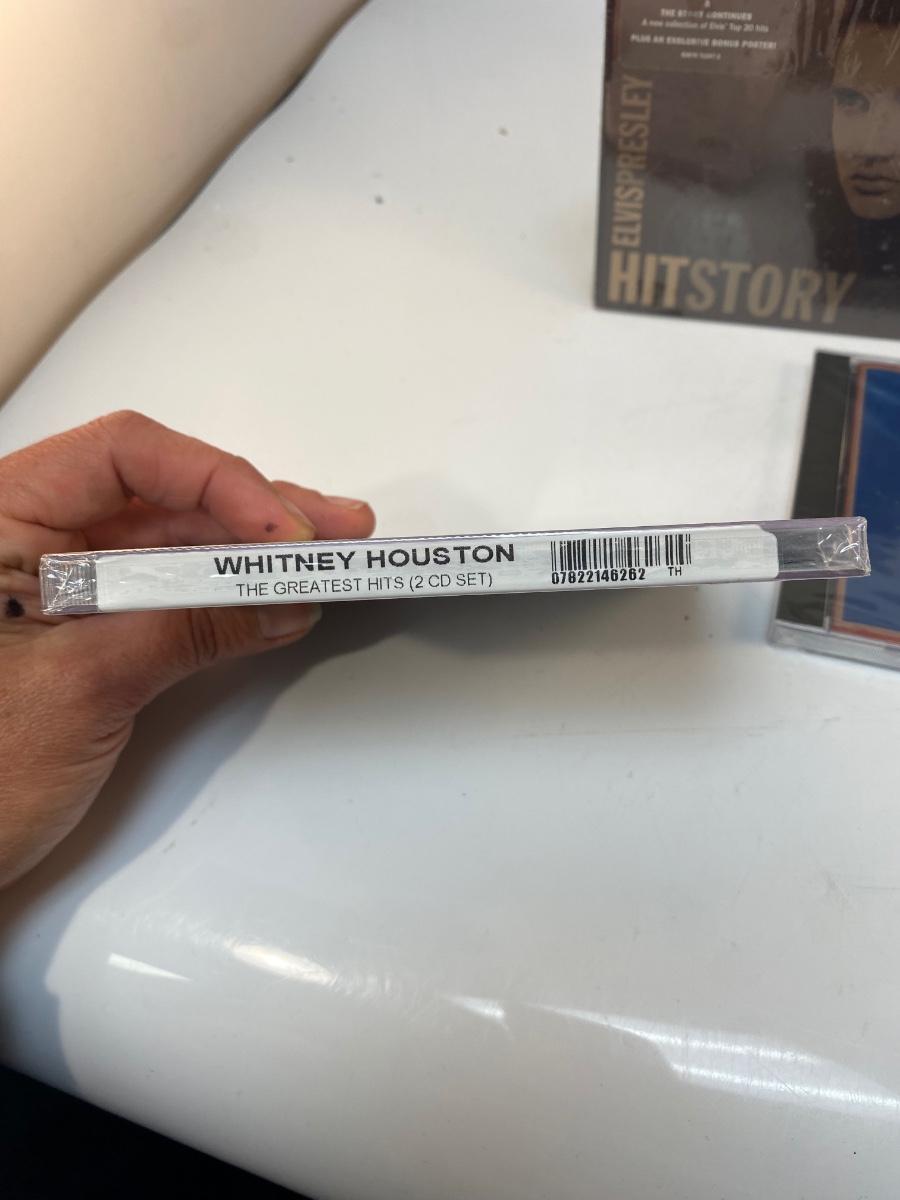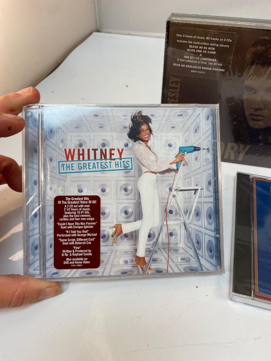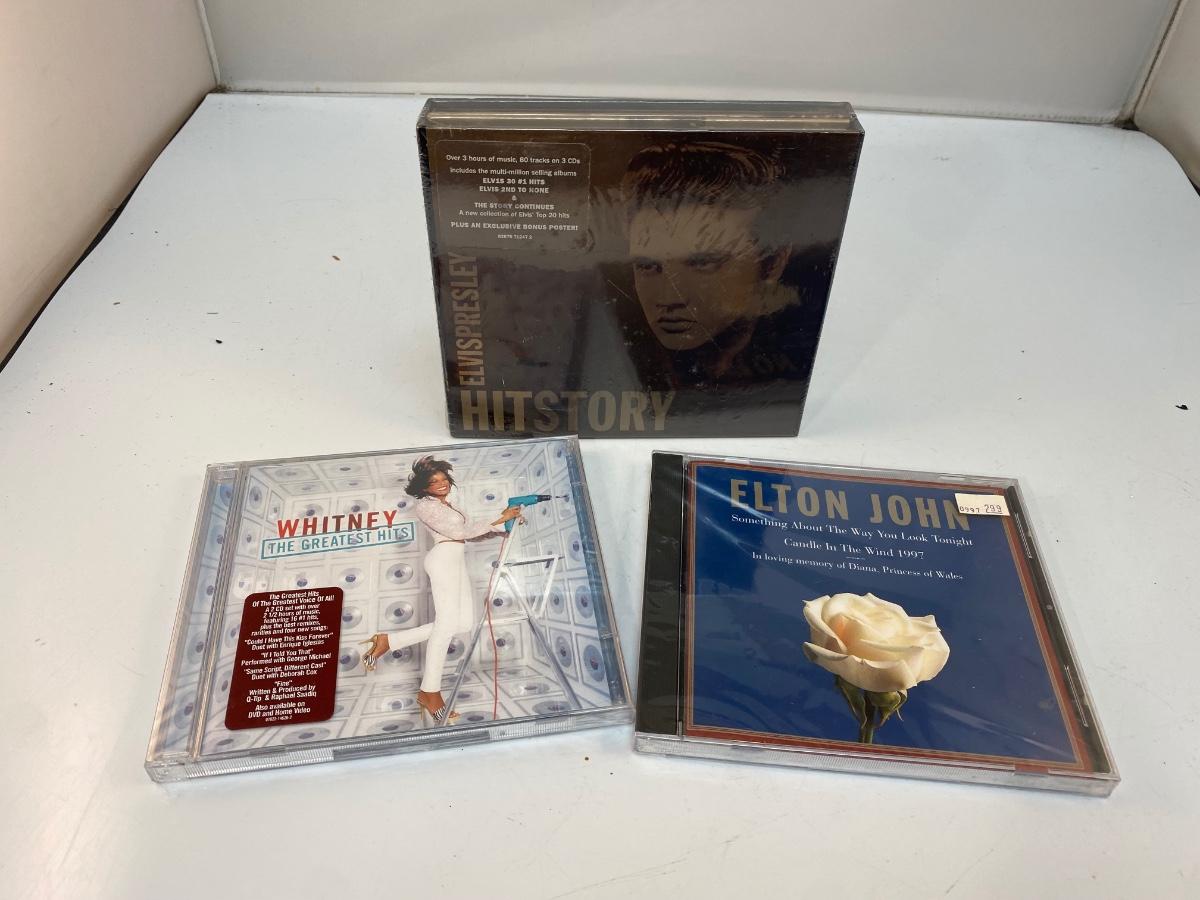 Set of Three UNOPENED New CDs Elvis Whitney Houston Elton John. All three still in original plastic. The Elvis cd is a 3-disc set. Whitney cd is her greatest hits. Elton John is a Princess Diana memorial two song disc.