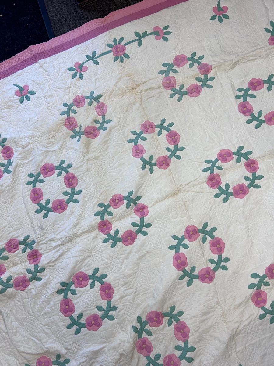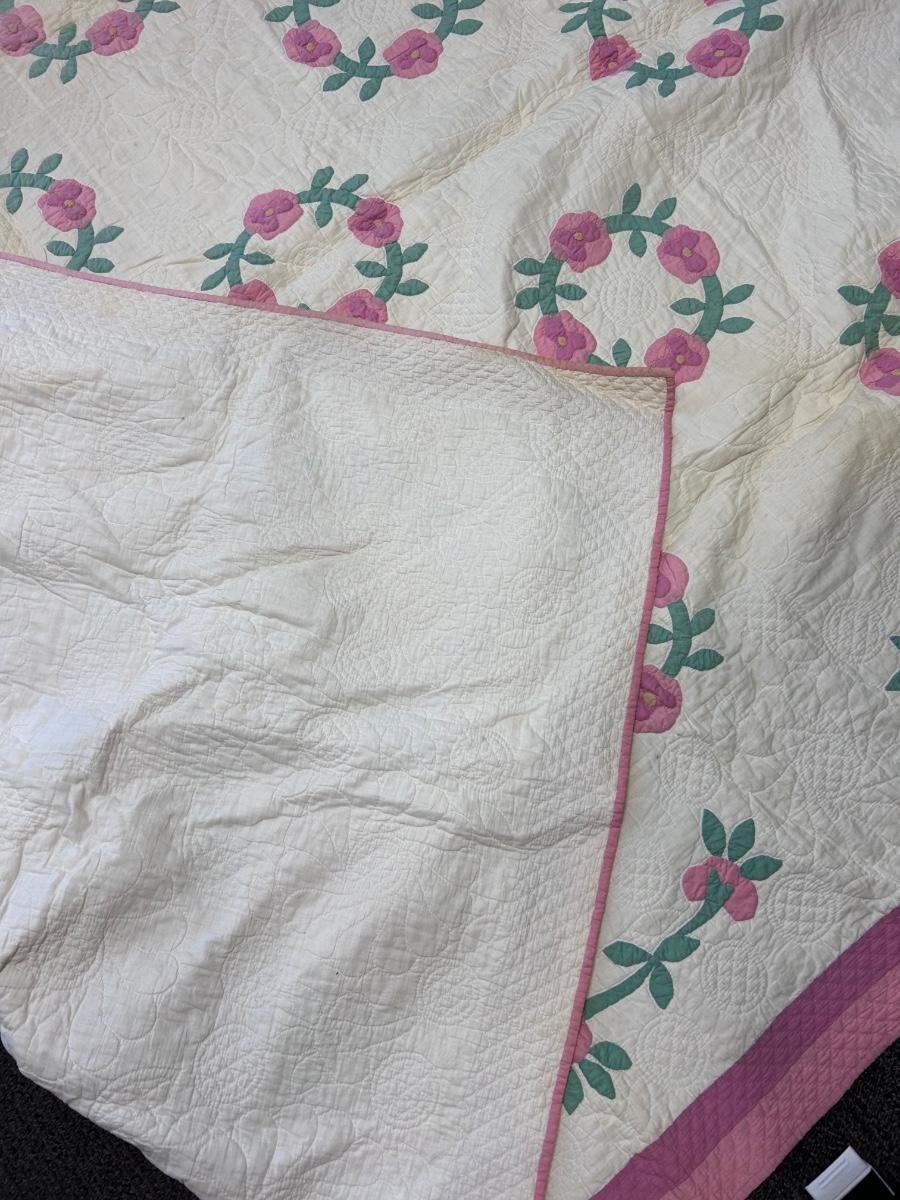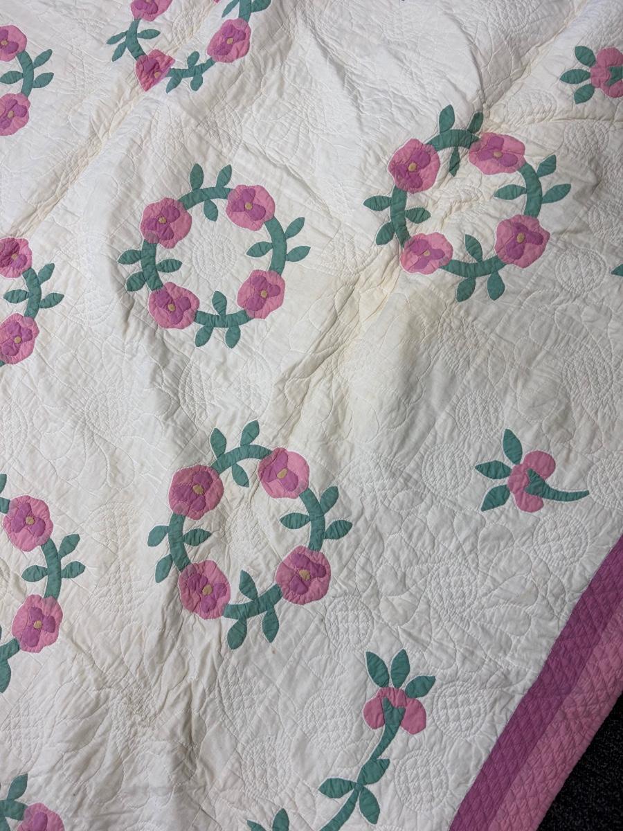 Vintage Hand Made Pink Rose Wreath Quilt Blanket Bedspread #1