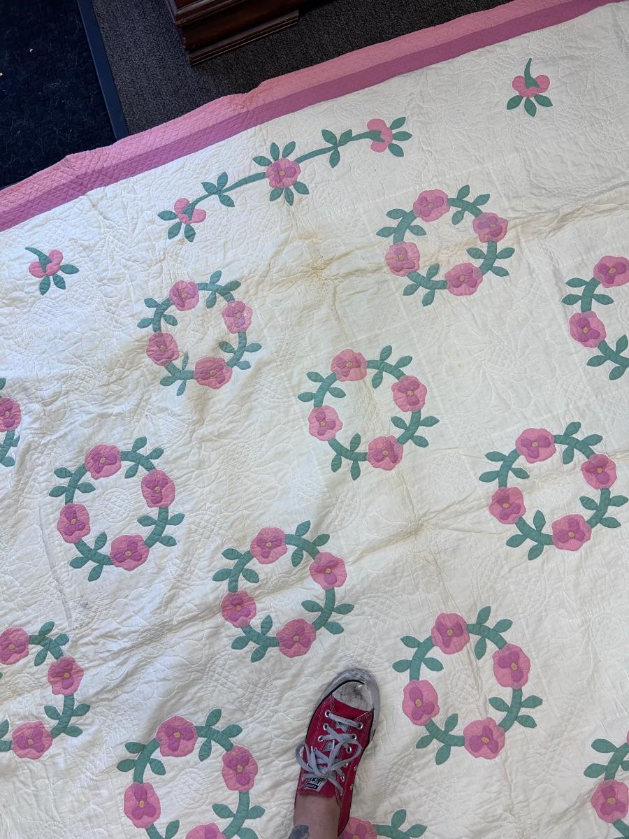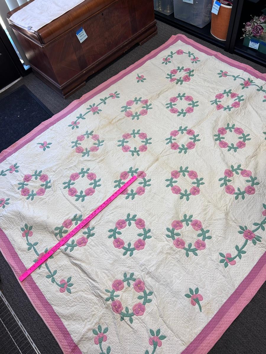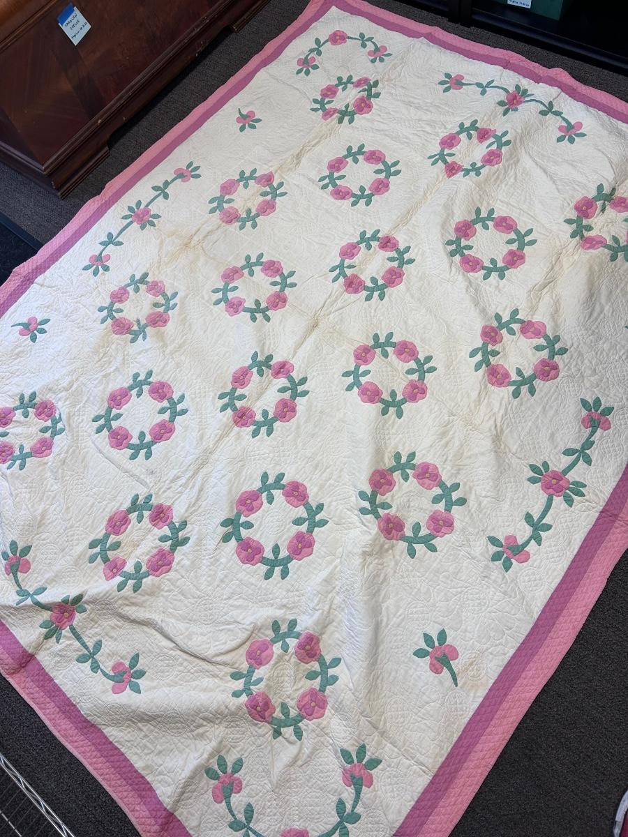 Vintage Hand Made Pink Rose Wreath Quilt Blanket Bedspread #1