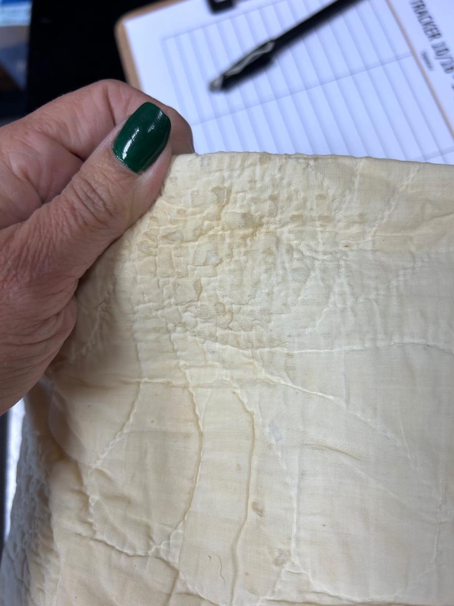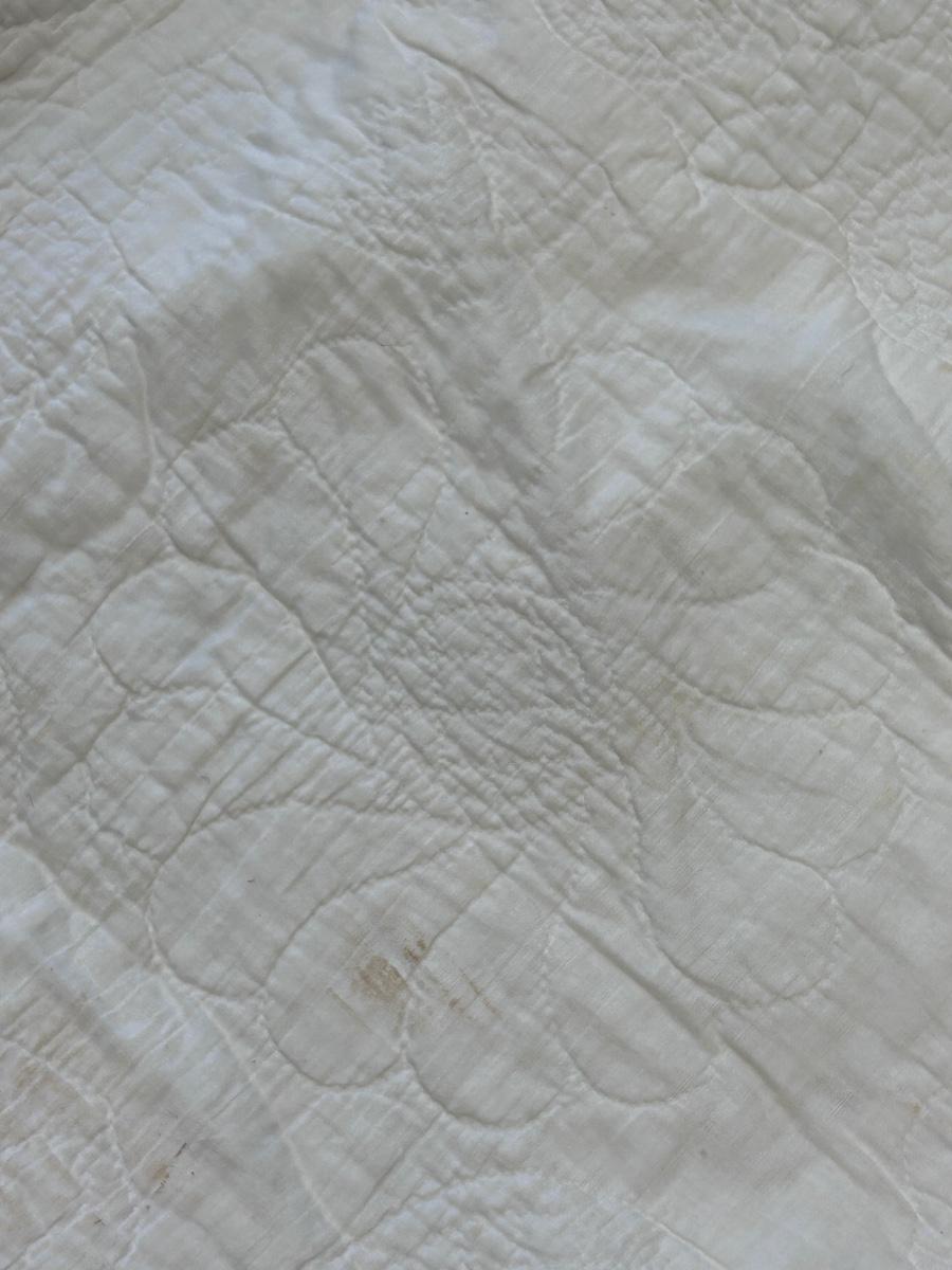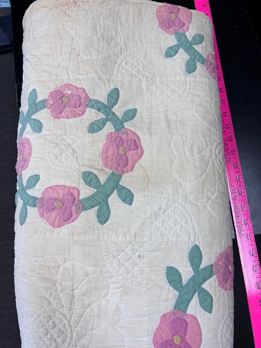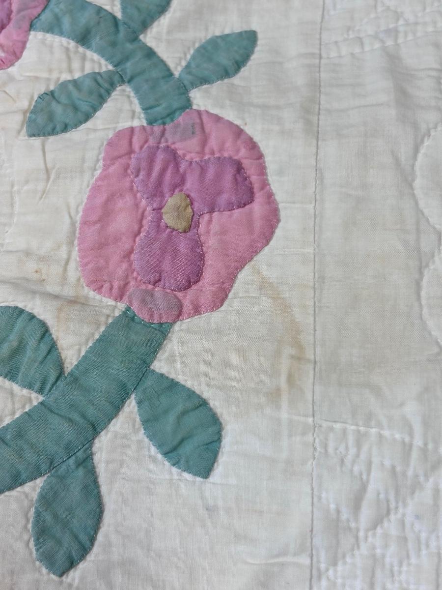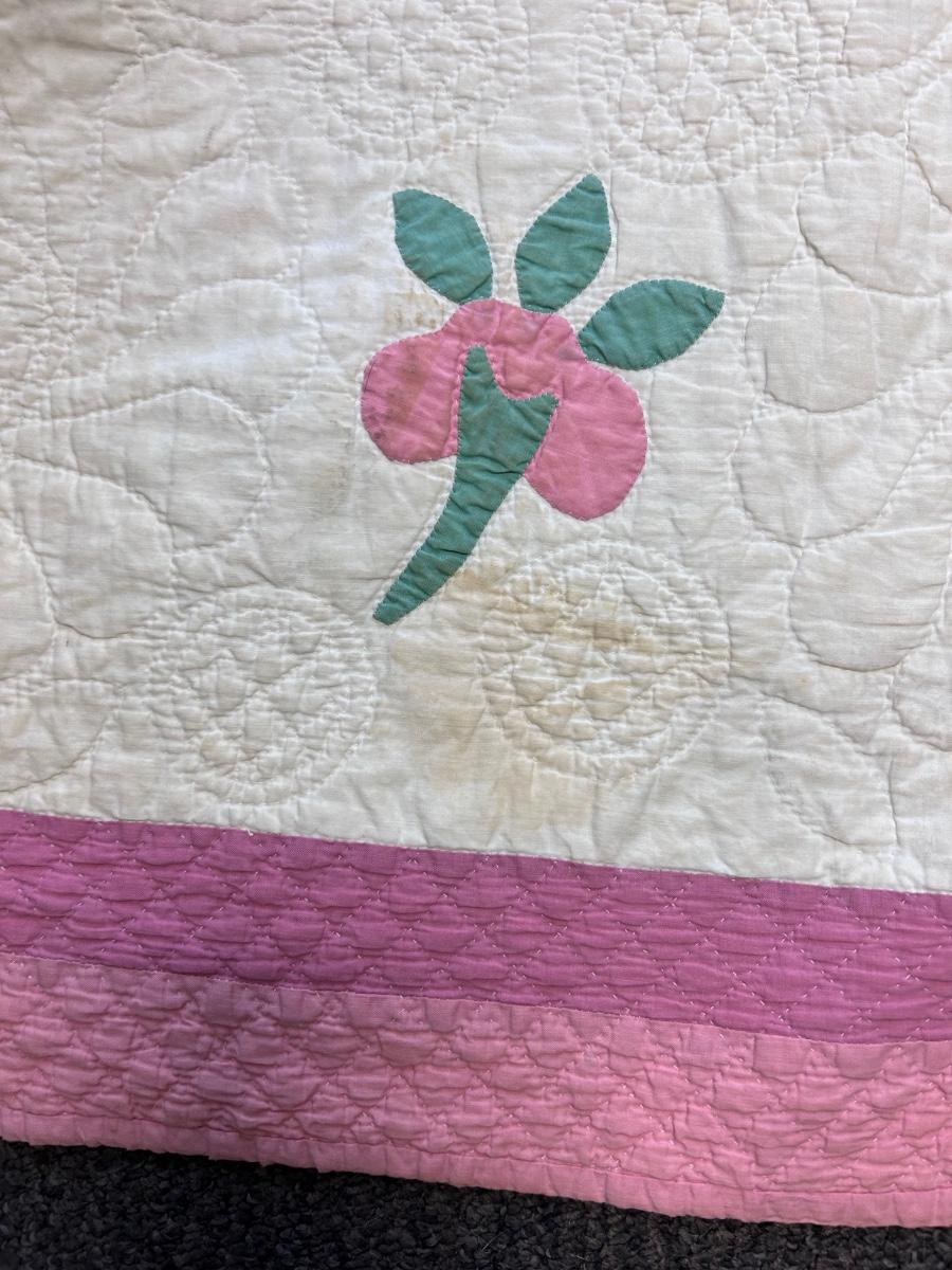 Vintage Hand Made Pink Rose Wreath Quilt Blanket Bedspread. In vintage condition. There is some discoloration spots but no major dark stains. Some wear to the fabric was noticed. Would fit a twin-size bed. There is a matching quilt in the auction.