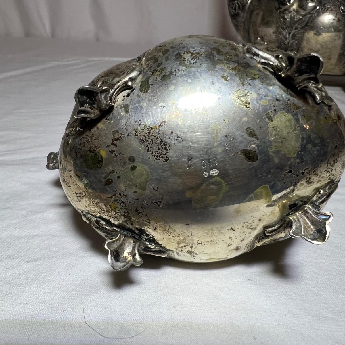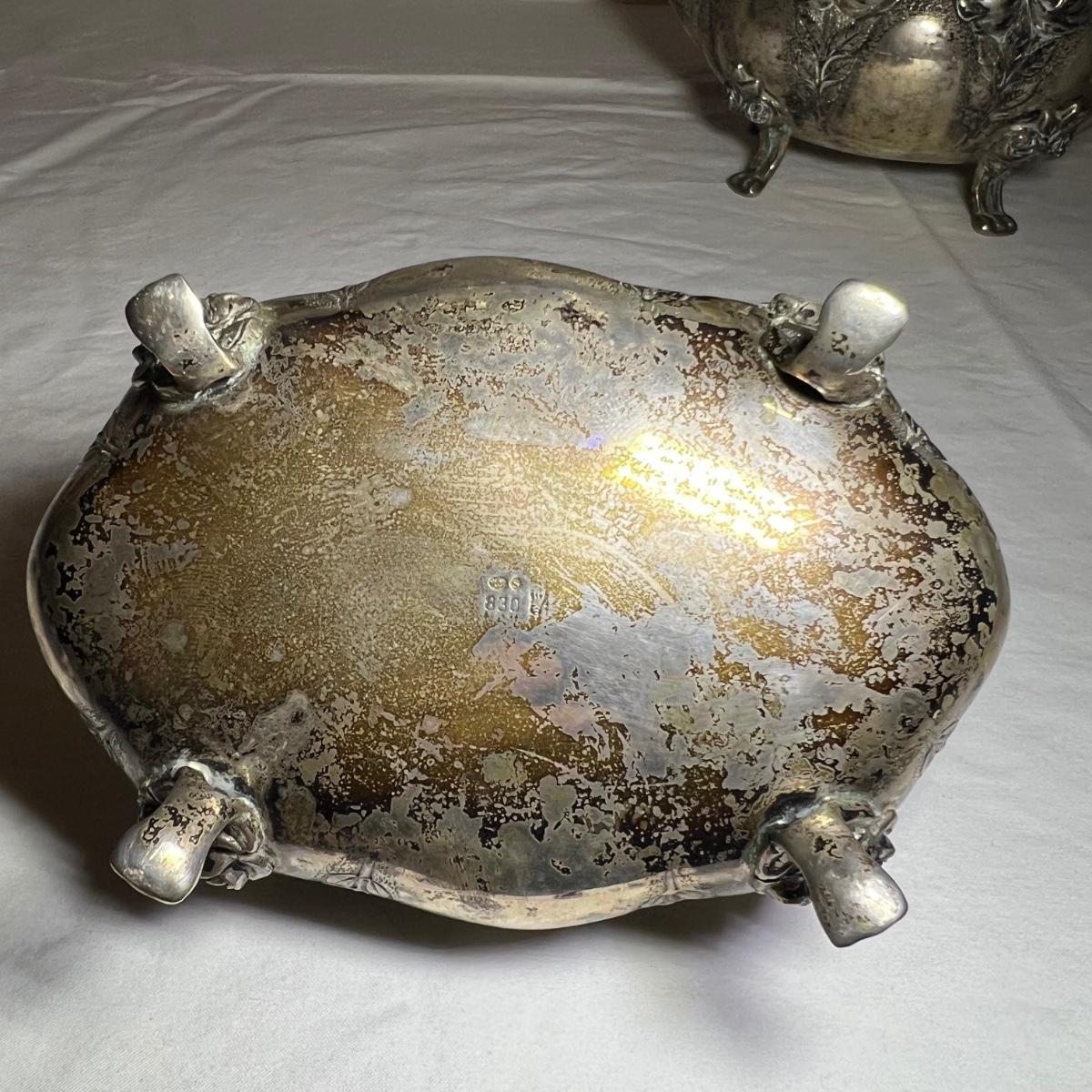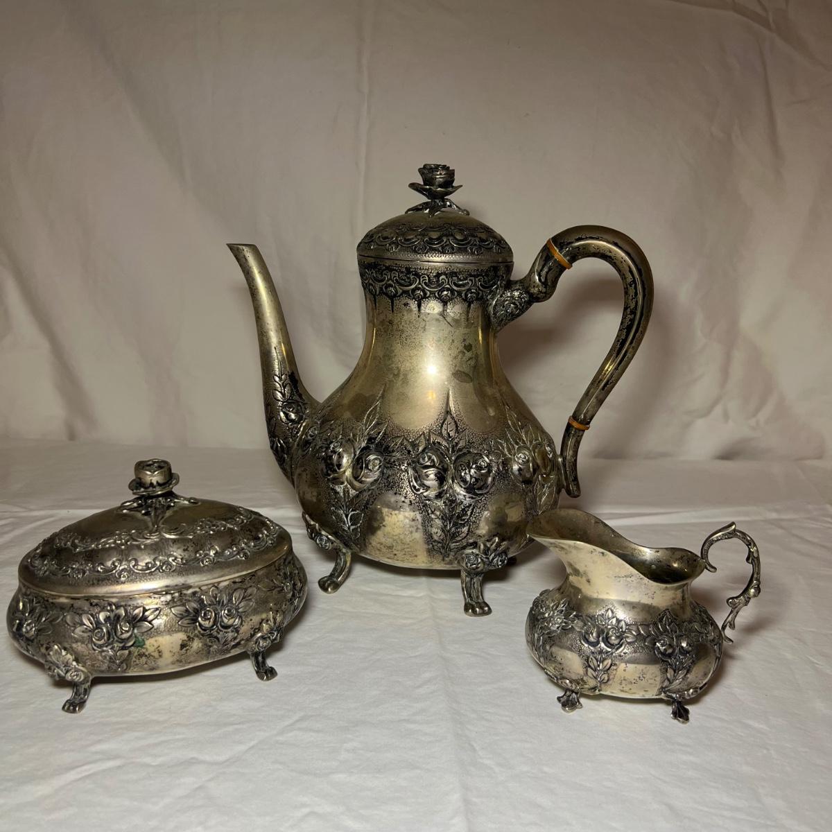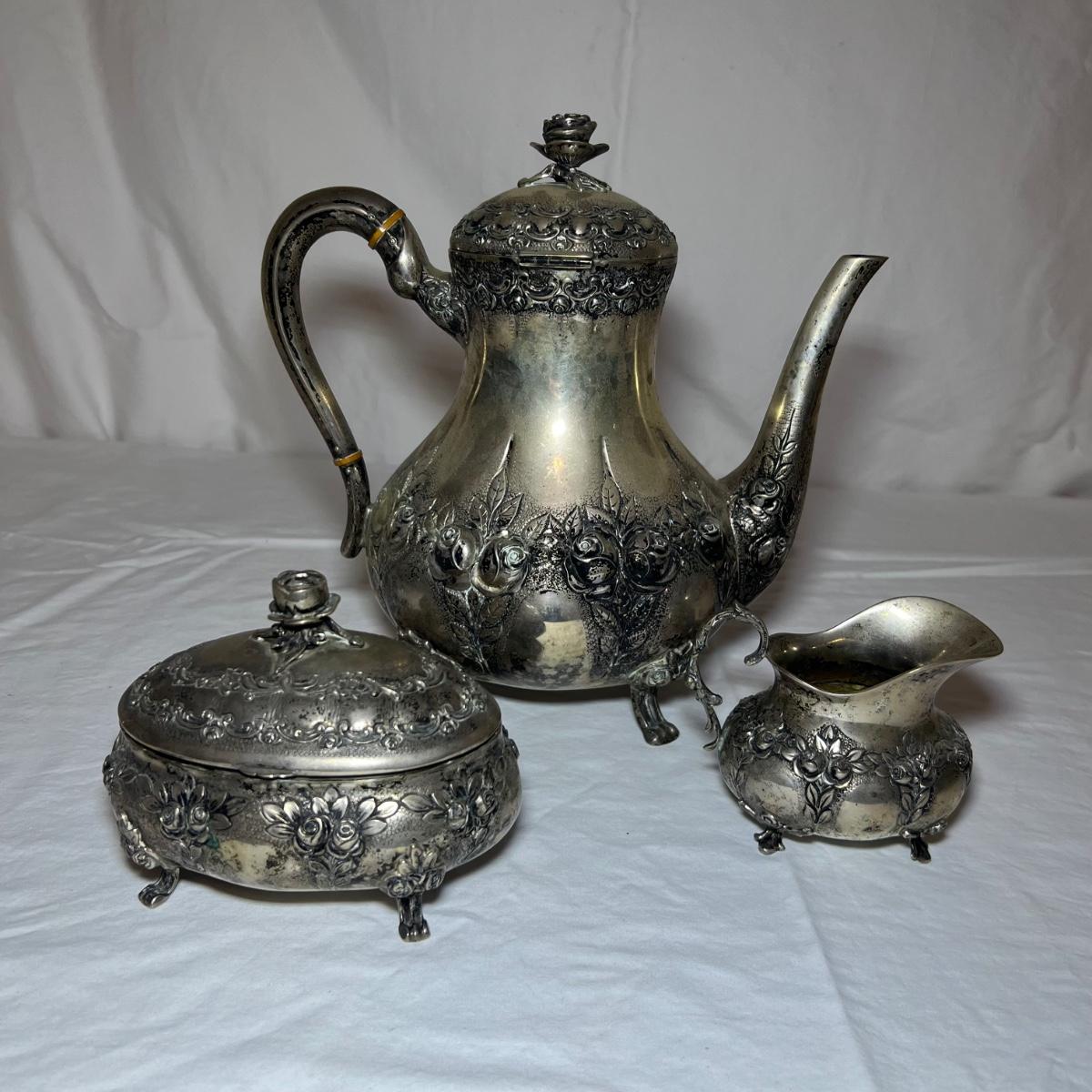This precious silver set are all stamped 830 and likely from Sweden. Set includes a teapot, lidded sugar bowl and creamer.
