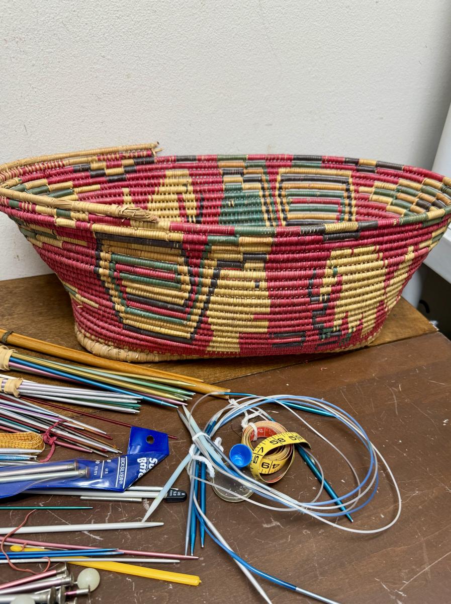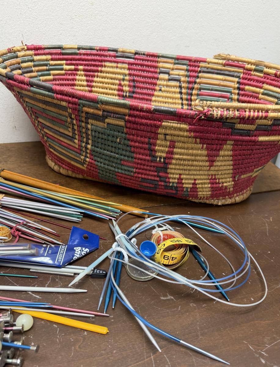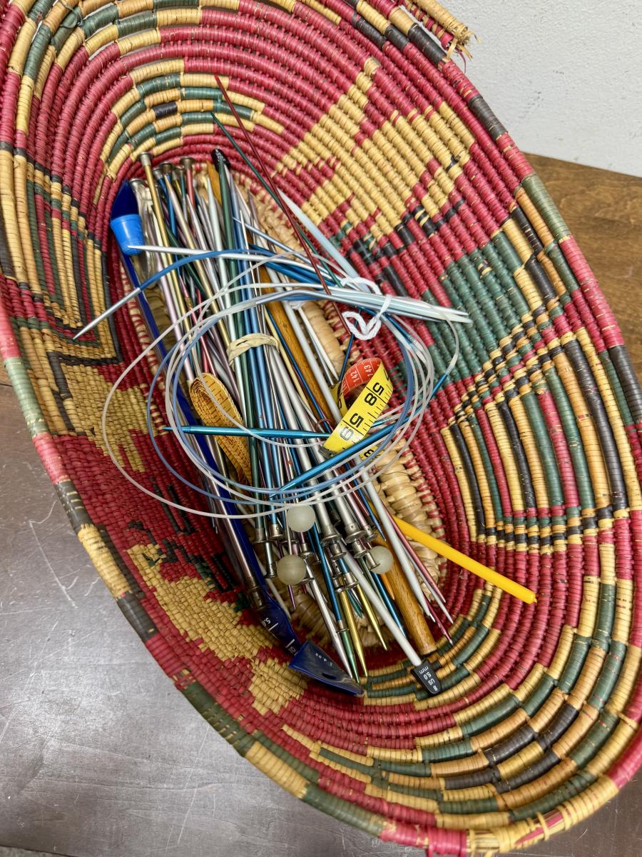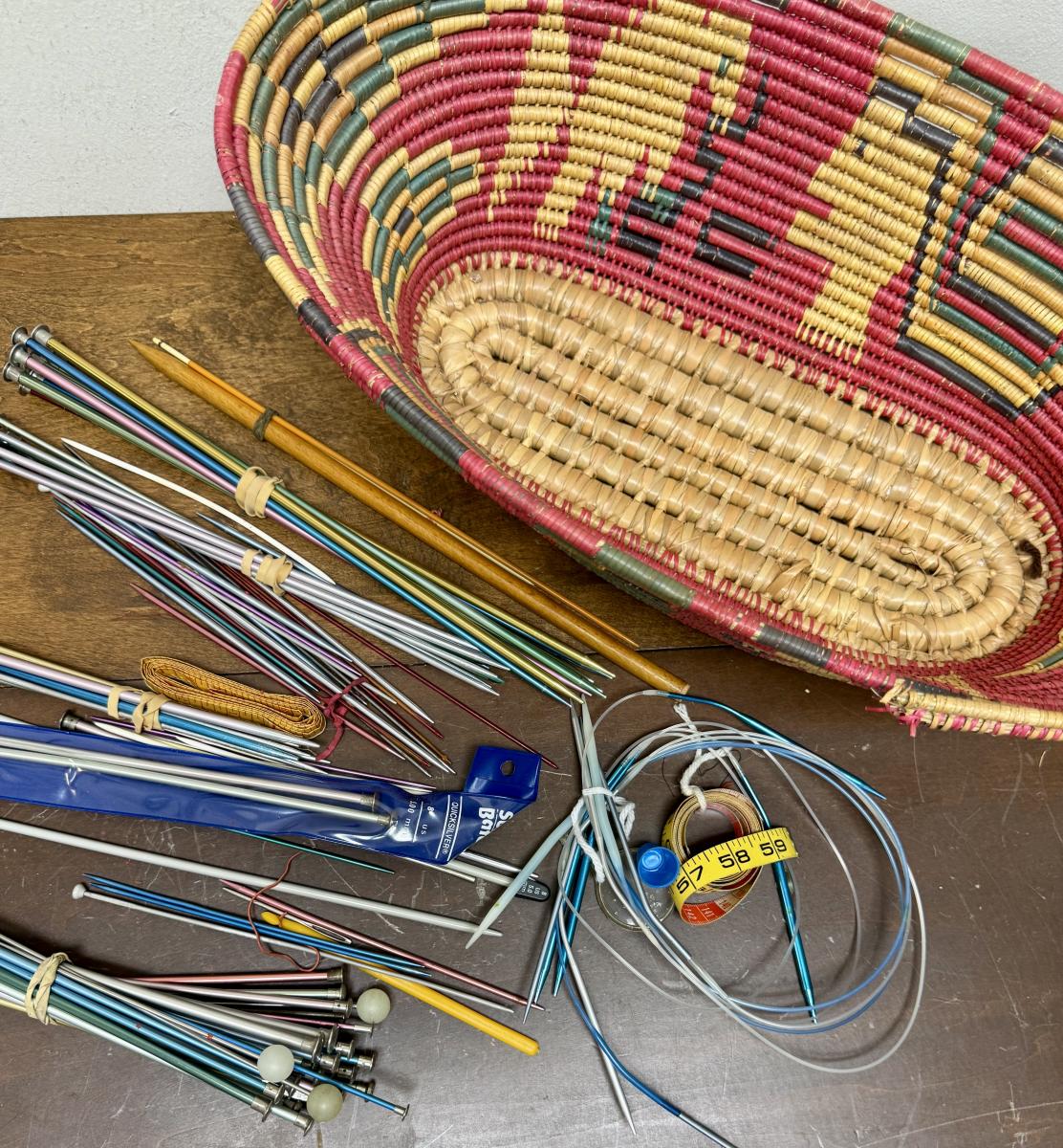 Large Lot of Vintage Knitting Needles Different Sizes & a couple of measuring tapes in Hand Woven Basket