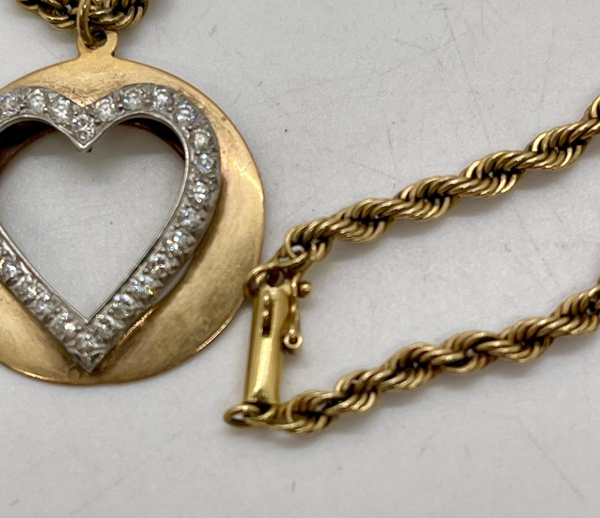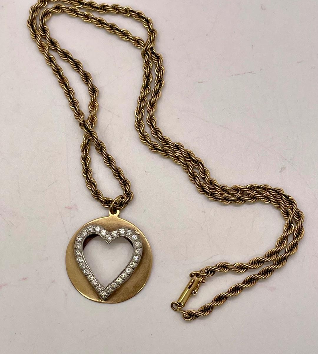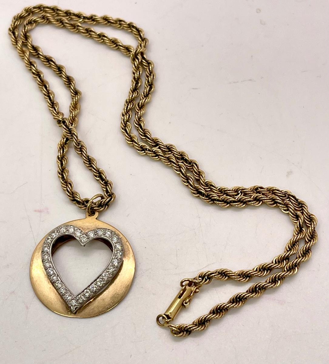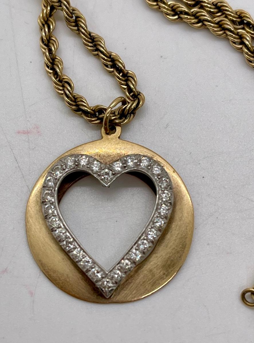 Thick braid chain marked 14k, weight is 15.9g. Pendant is unmarked, but tested. Weight of pendant is 4.9g, which includes 28 small diamonds set in a heart-shaped mounting. In good condition.