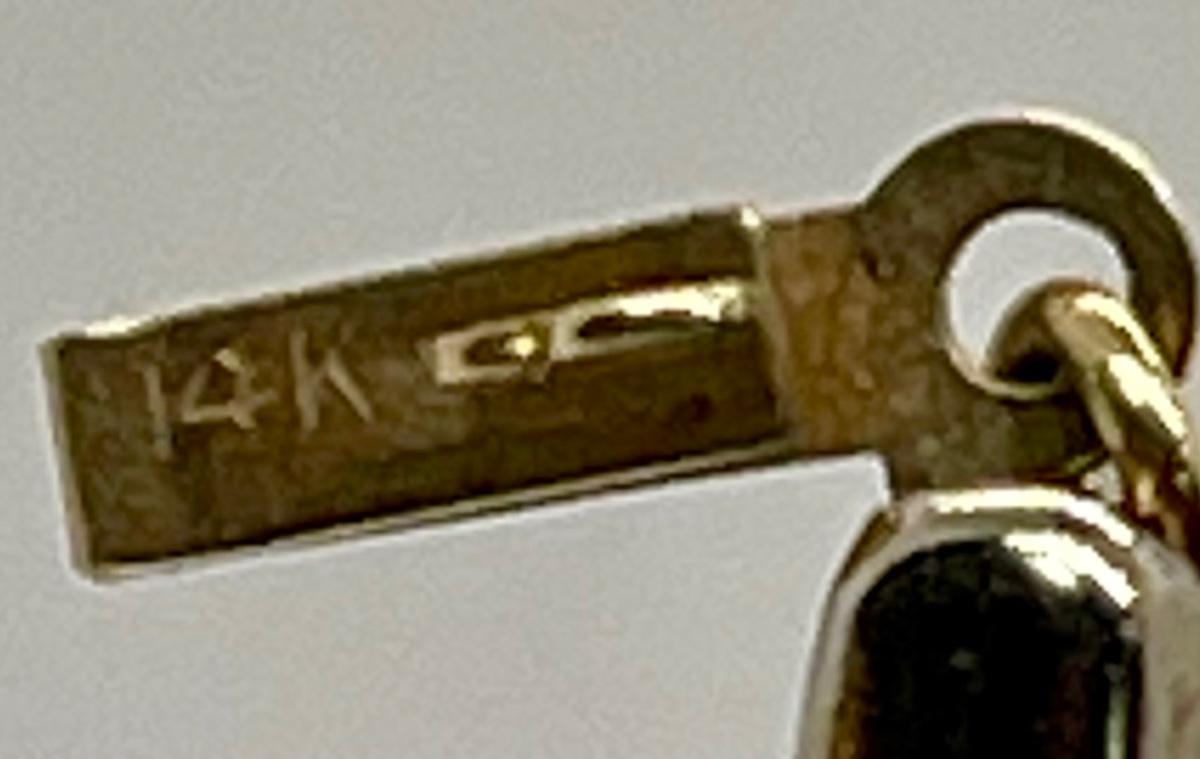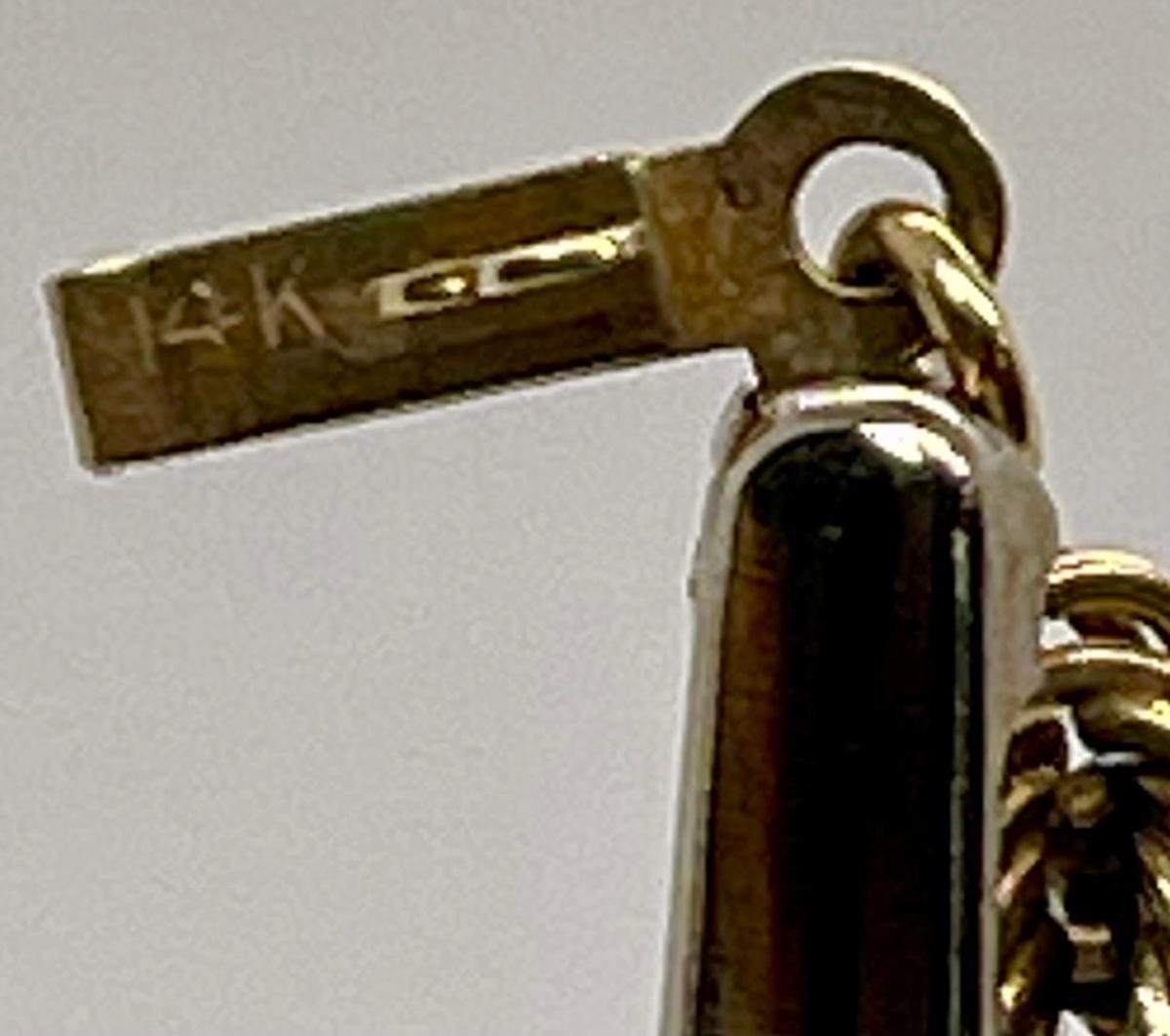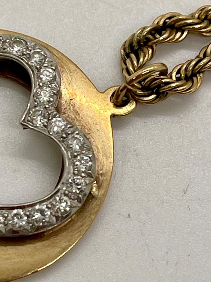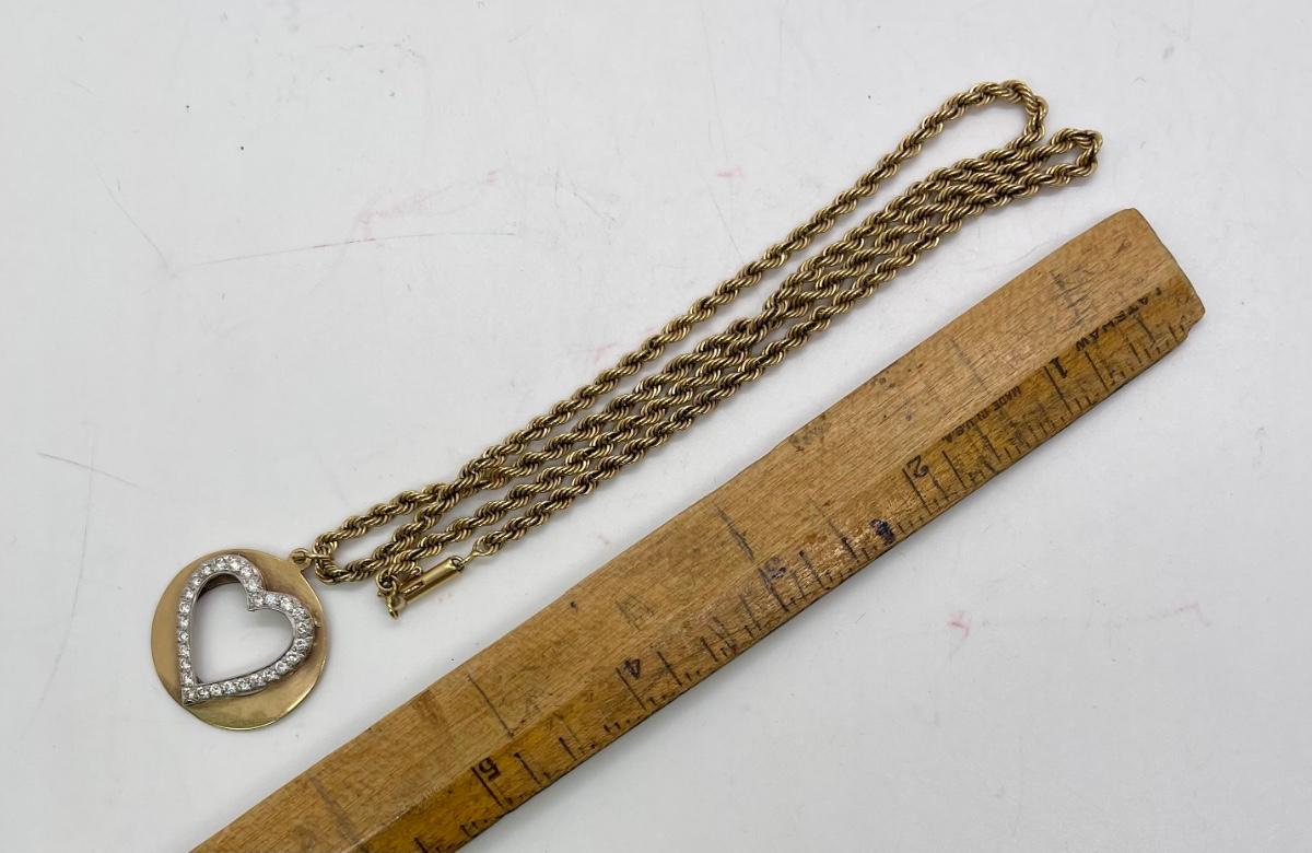 Thick braid chain marked 14k, weight is 15.9g. Pendant is unmarked, but tested. Weight of pendant is 4.9g, which includes 28 small diamonds set in a heart-shaped mounting. In good condition.
