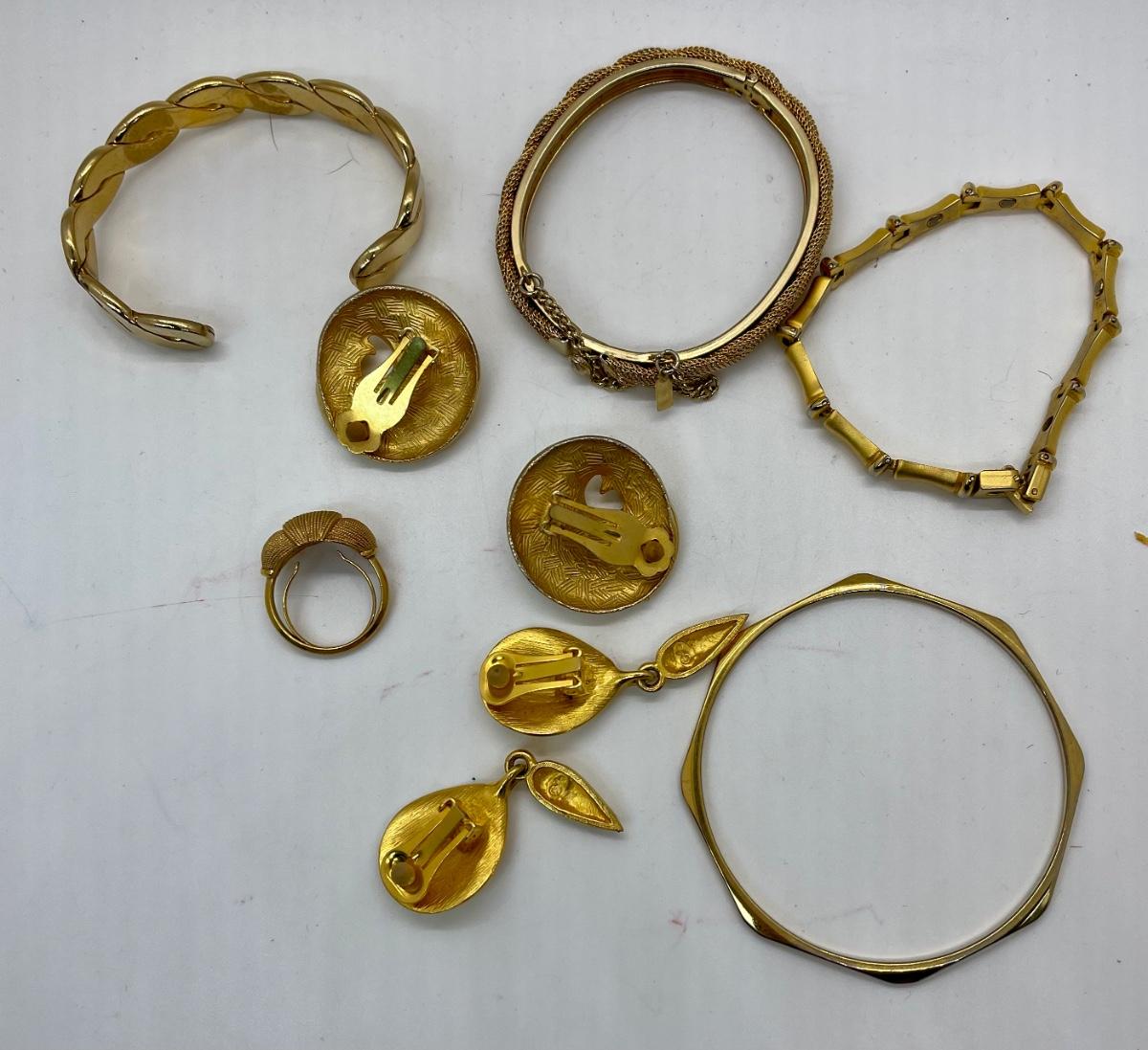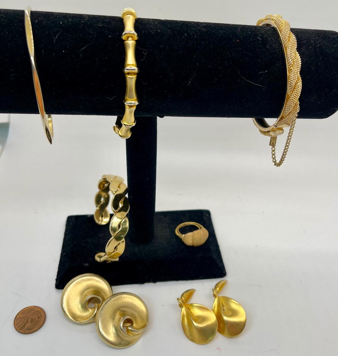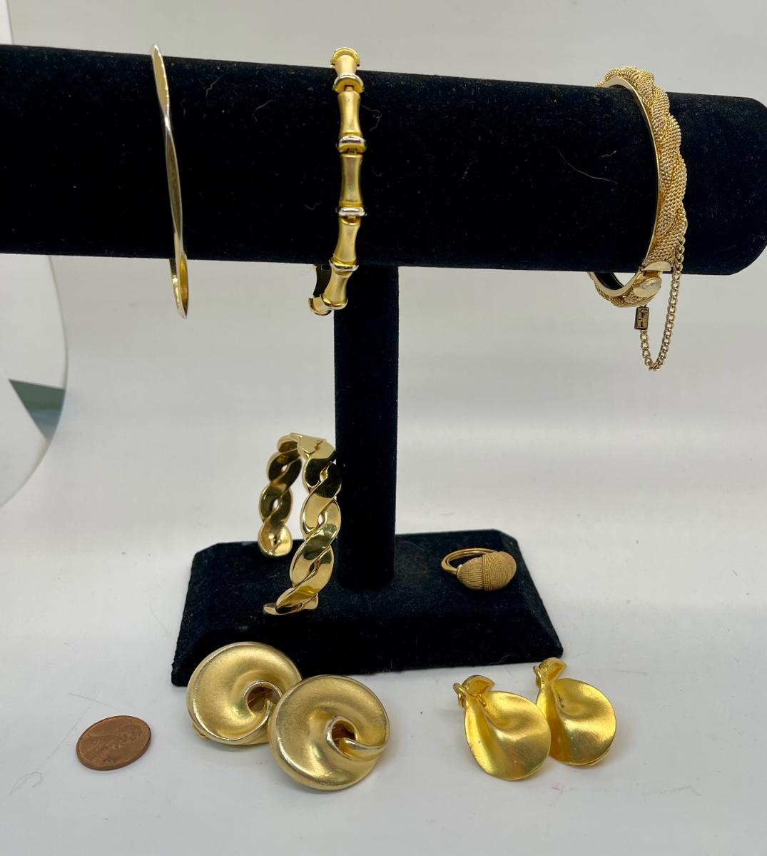 4 bracelets, 2 earrings, 1 ring in gold tone. In good preowned condition.