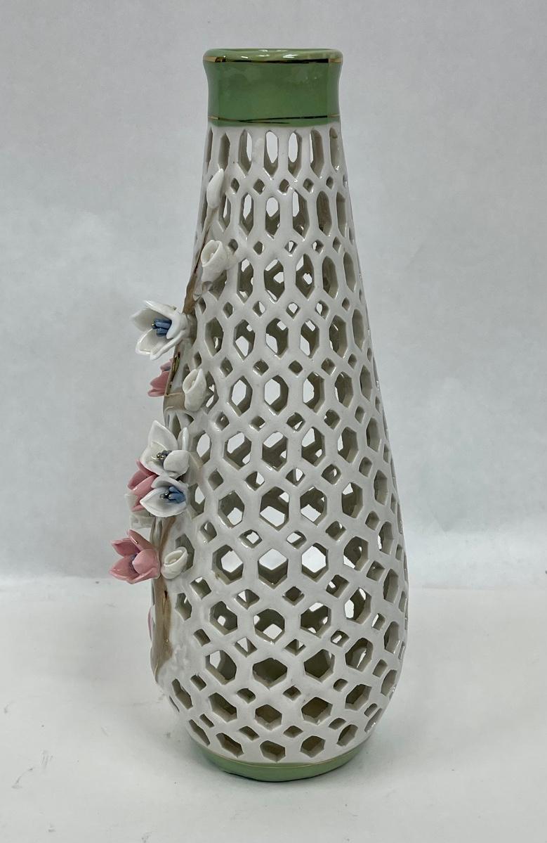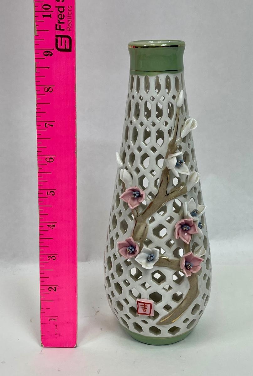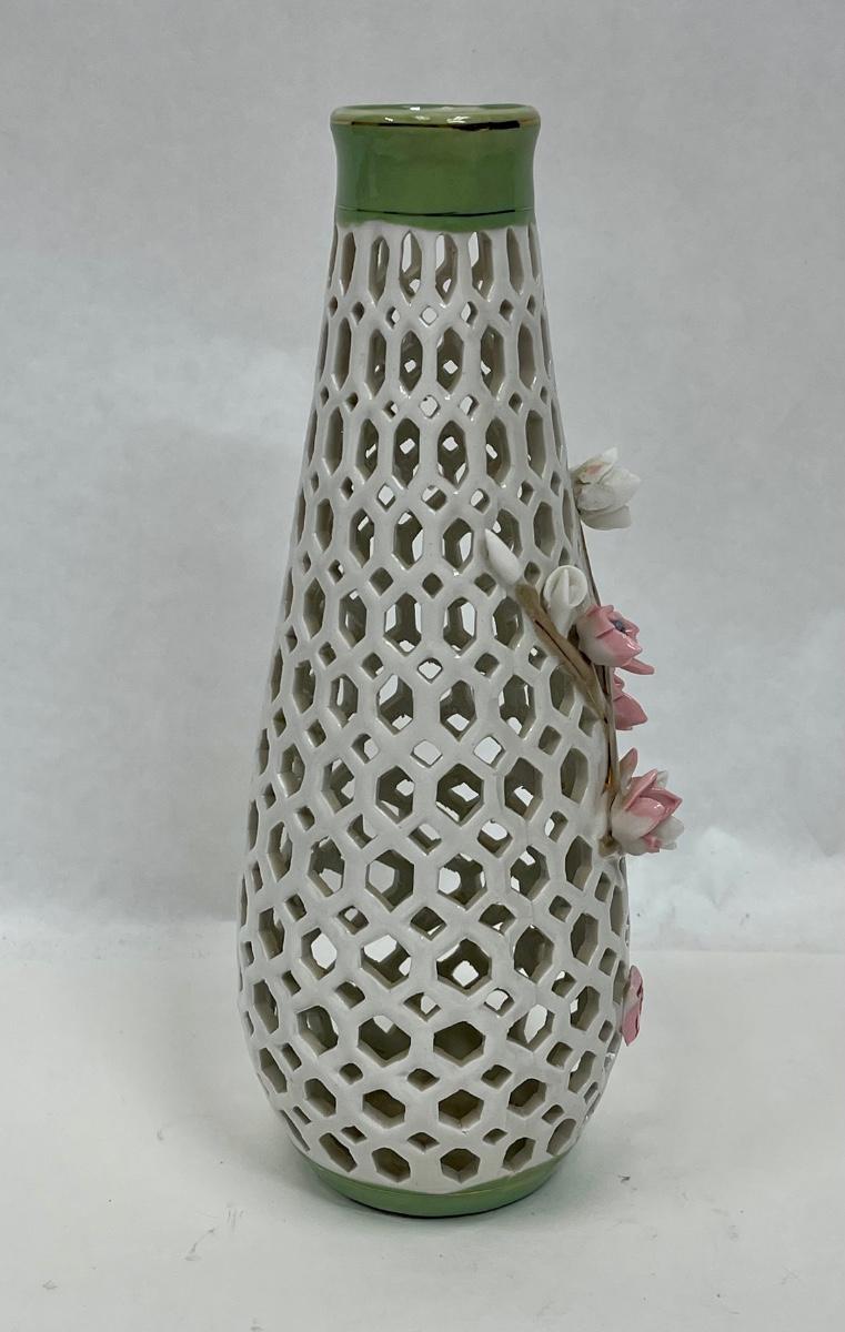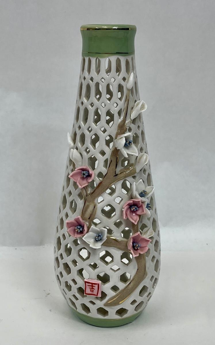 Porcelain Lattice Vase with Applied Pink Flowers 9" tall