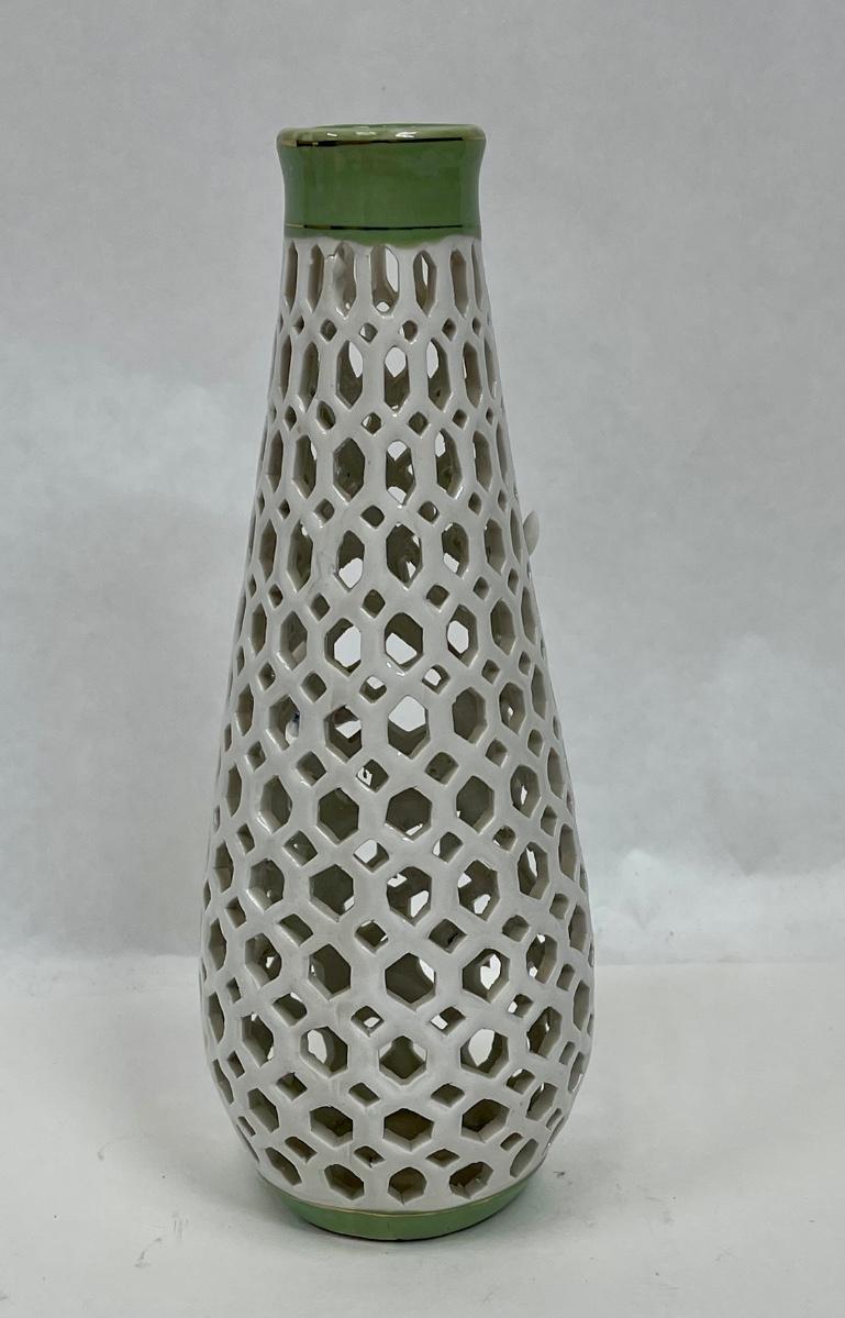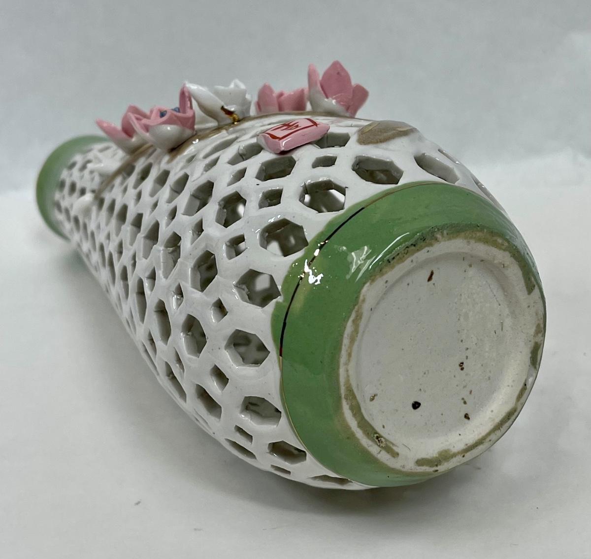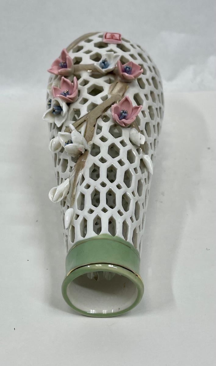 Porcelain Lattice Vase with Applied Pink Flowers 9" tall