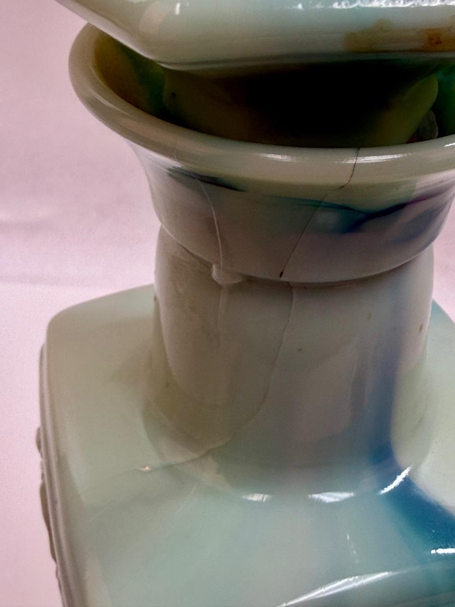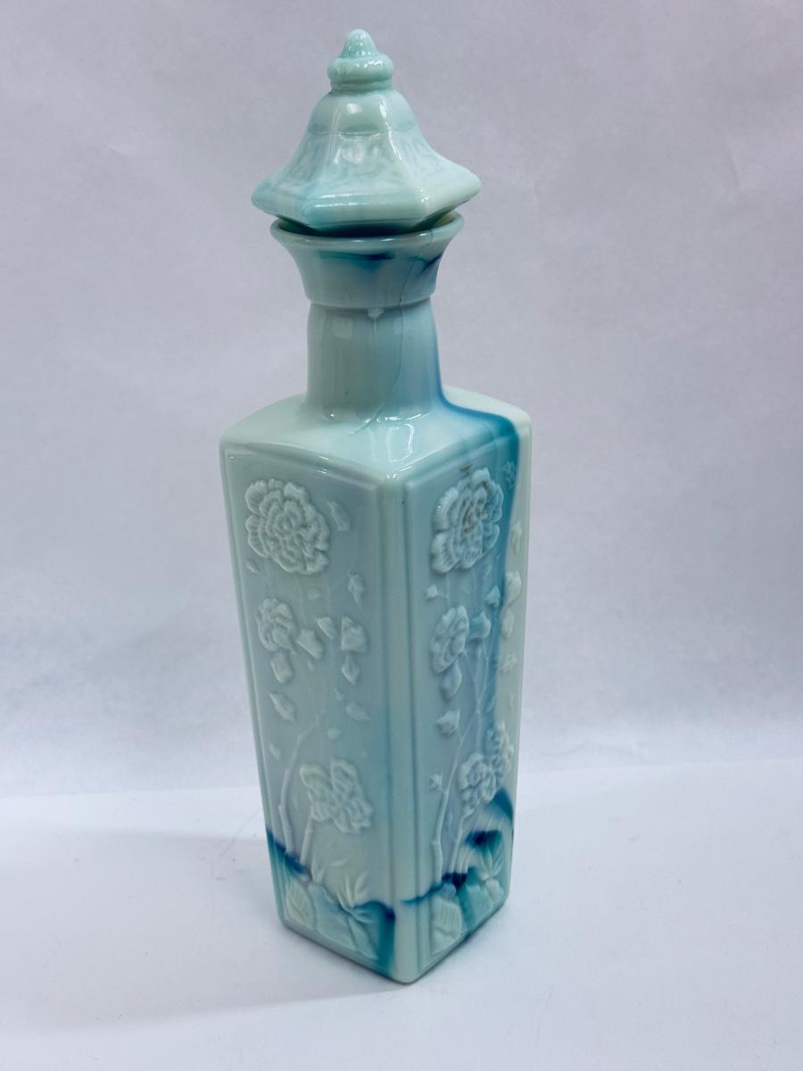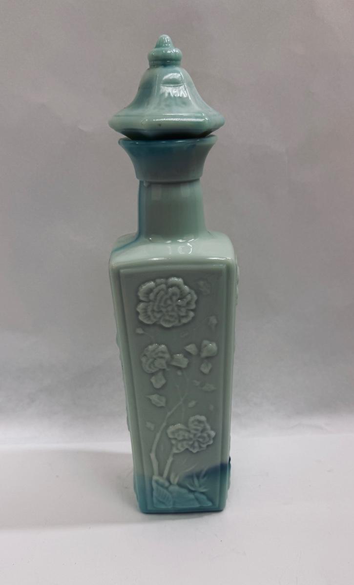 Vintage 1972 Jim Beam "Oriental Jade" or "Royal Jade" series liquor decanter made of green milk slag glass with an embossed cherry blossom motif