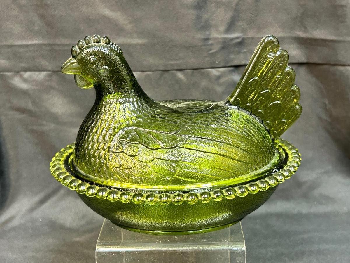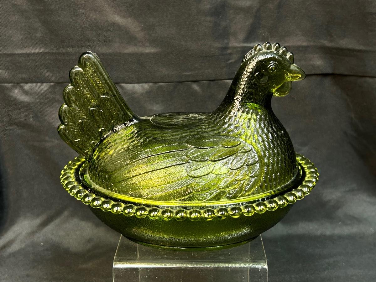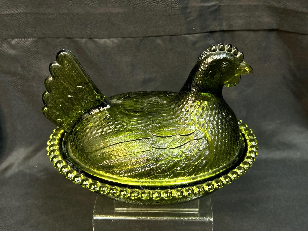 Vintage Retro Olive Avocado Green Glass Hen Chicken in a Basket Lidded Dish. In good vintage condition. No chips or damage. About 8" length.