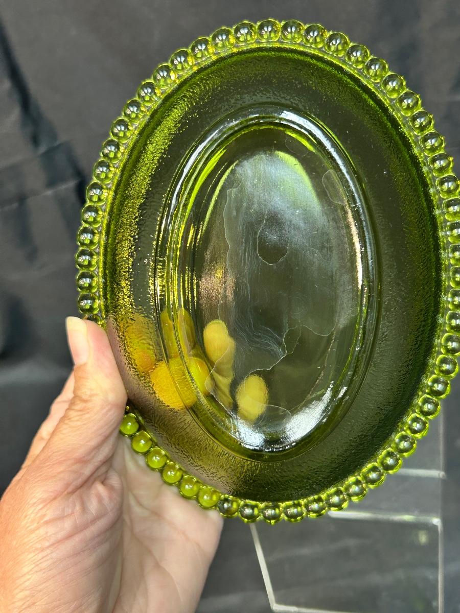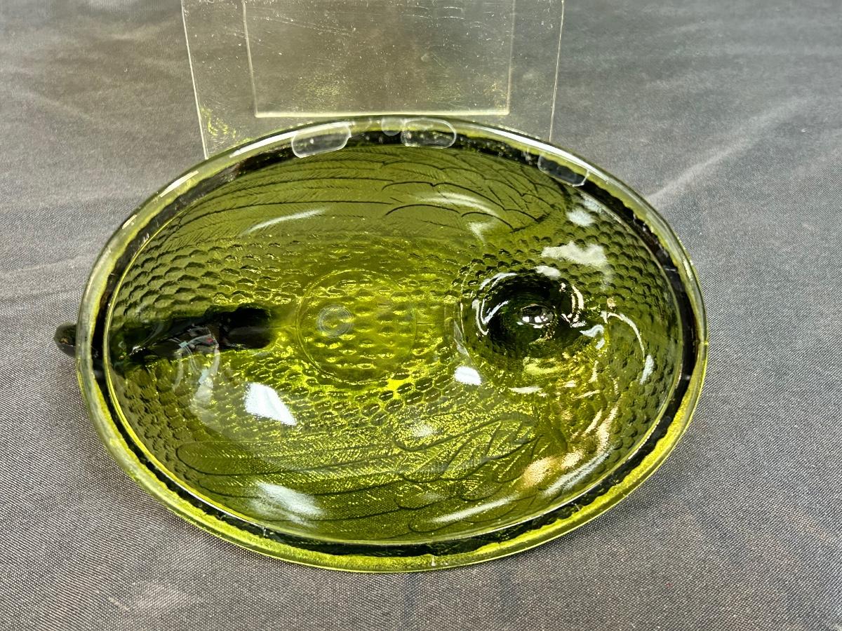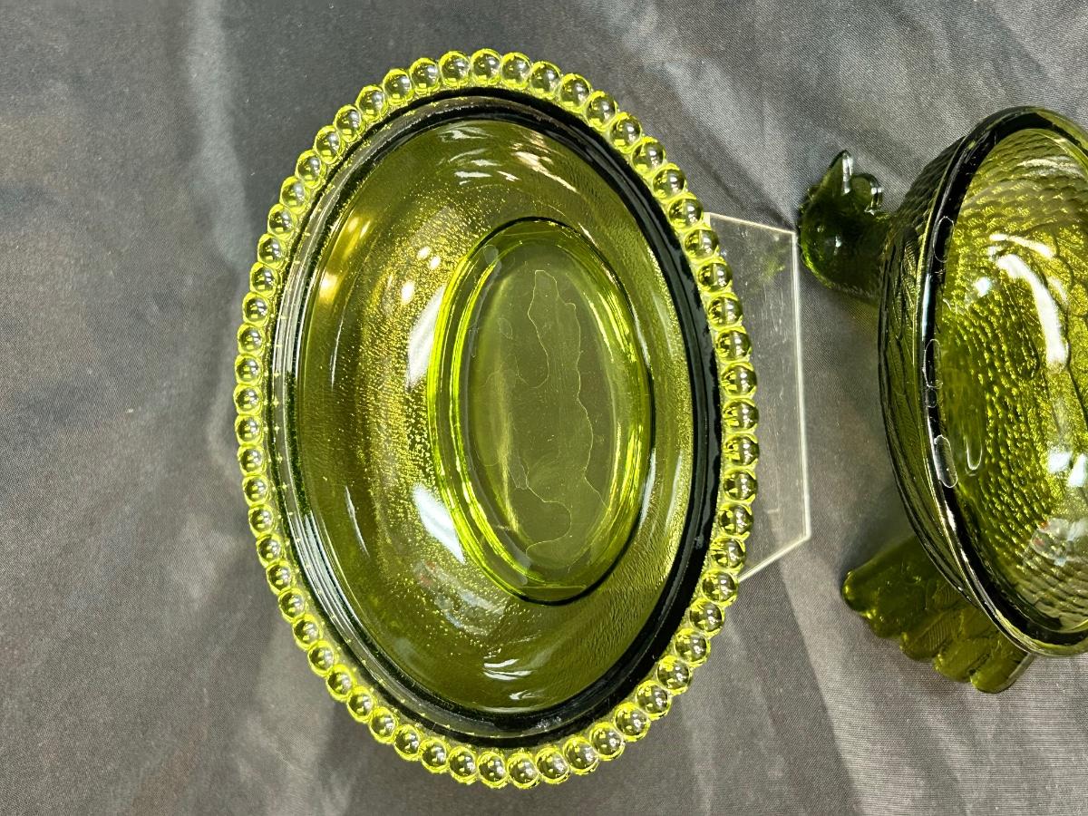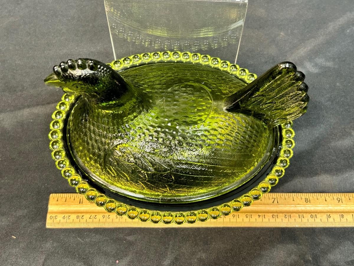 Vintage Retro Olive Avocado Green Glass Hen Chicken in a Basket Lidded Dish. In good vintage condition. No chips or damage. About 8" length.